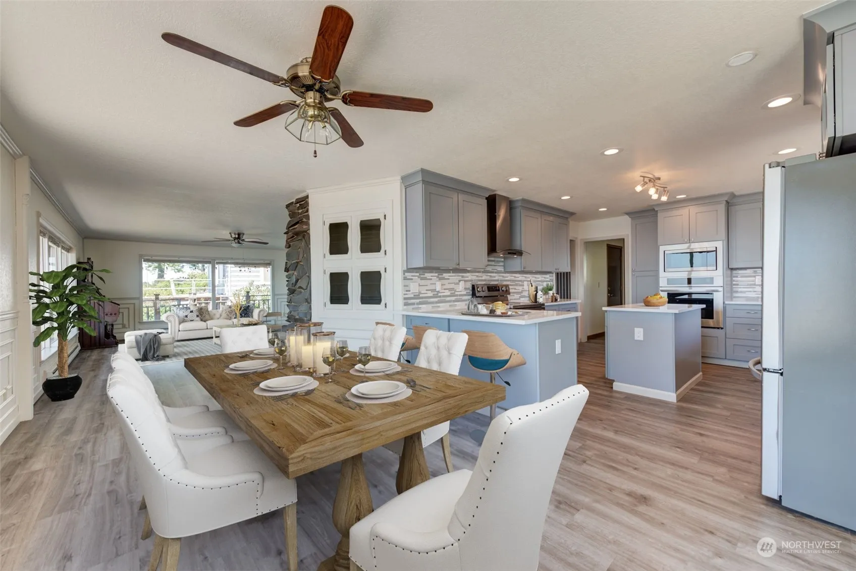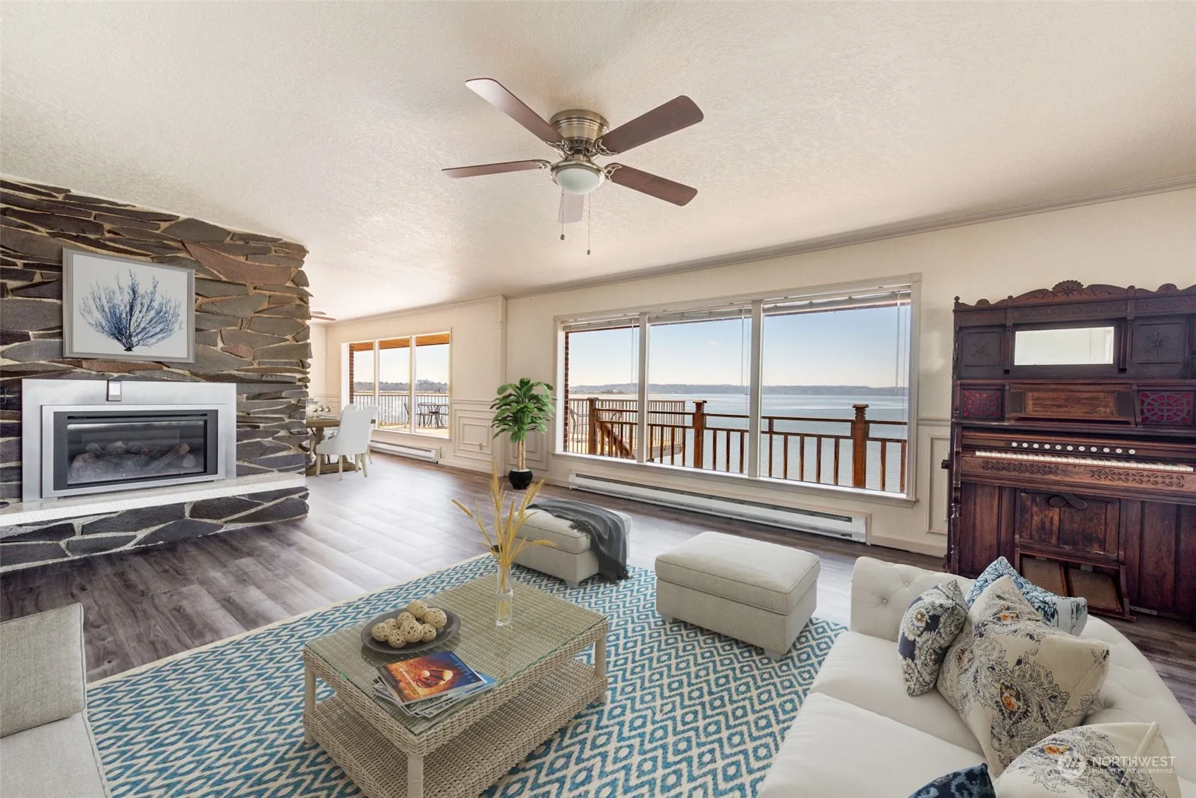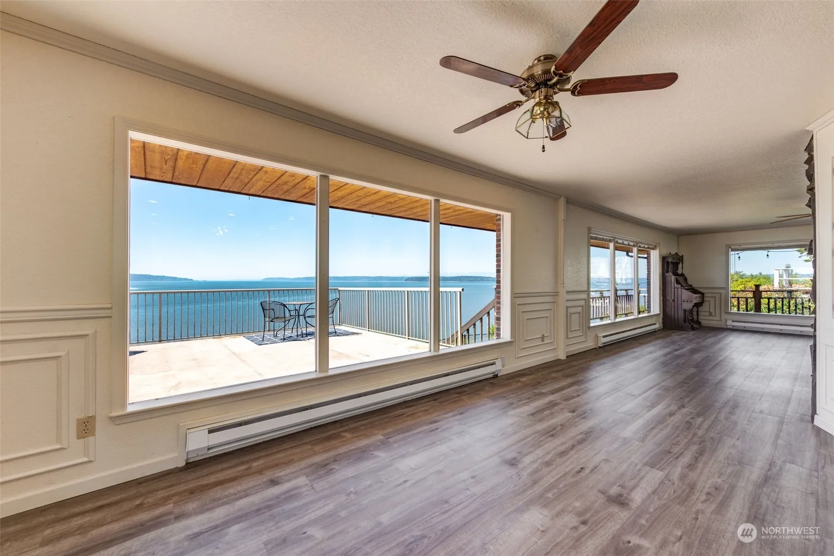 Experience breathtaking Puget Sound, City and Olympic views right from your 1239 asf expansive deck! Entertain and cook in the beautifully appointed Chef’s Kitchen (2023), open to the dining and spacious living room, with panoramic picture windows to soak in views. Primary bedroom (en-suite bathroom, 2nd bedroom, main bathroom & utility room are on the main floor. Descend to fully furnished living quarters, including updated kitchen, bedroom, bathroom and bonus room. Updates include flooring, interior paint, electrical panel, 2 fireplace propane inserts, roof (2016), downstairs bathroom and kitchens. Community gate/stairs are a few steps away to truly immerse yourself in beachfront living! You will fall in love! 638 asf hobbyist’s garage.