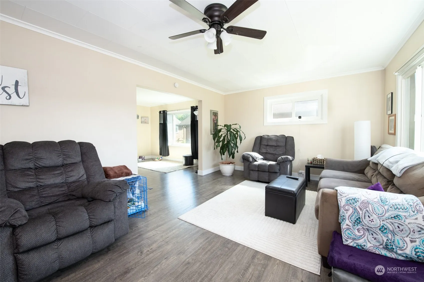Lots of possibilities with this multi family home with an ADU over the garage in the back of the lot. The main house is spacious boasting 2,116 square feet, 4 bedrooms, and 1 bathroom. Walk in to a covered sunroom/mudroom with an open concept living space and an eat in kitchen. Oversized bathroom on main with a walk in closet. Off the kitchen is another bonus room/office space and a laundry room. Head upstairs to three more bedrooms and a loft area. At the back of the lot is an updated 864 square foot ADU with 2 bedrooms and 1 bathroom and it’s own washer and dryer. Separate PUD meters but one one water meter for the properties.