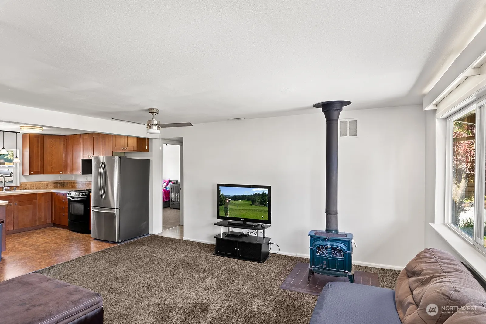 Welcome to your new home in a serene neighborhood, perfectly situated across from a beautiful park. This inviting residence features three spacious bedrooms, 1.75 baths, and a generous two-car garage with a workshop area and ample storage The expansive master suite boasts a jetted tub and a private bonus room, perfect for a home office or additional living space. The well-appointed kitchen opens to a cozy family room with a wood stove. Outside, enjoy a gorgeous, private backyard with covered storage and thoughtful landscaping. The corner lot includes plum cherry trees, berry bushes, potatoes, and a thriving green grape vine, offering plenty of space for outdoor activities and gardening. Plus, there’s a spacious patio for entertaining.