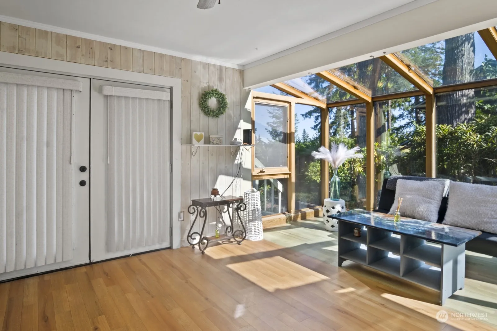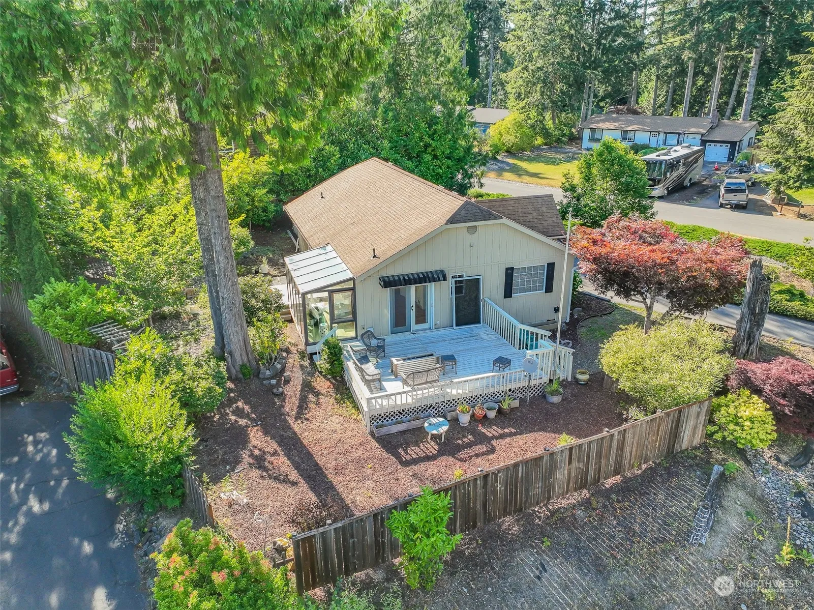 Welcome to your unique and spacious single level ranch home on a generous corner lot. The circular driveway offers extra parking and enhances curb appeal. Driftwood bleached wood walls and cathedral ceilings create a warm and inviting great room. The home features two large bedrooms with private en suite baths and walk-in closets, and a 3rd Finished room with French doors, elegant wainscoting, and crown molding. The kitchen has been updated with new floors, countertops, and an open layout. Updated windows and Plantation shutters add charm. Enjoy two decks one for relaxing, one for entertaining and a sunroom overlooking a secluded backyard. Mature, low-maintenance landscaping completes this serene Lakeland Village home.