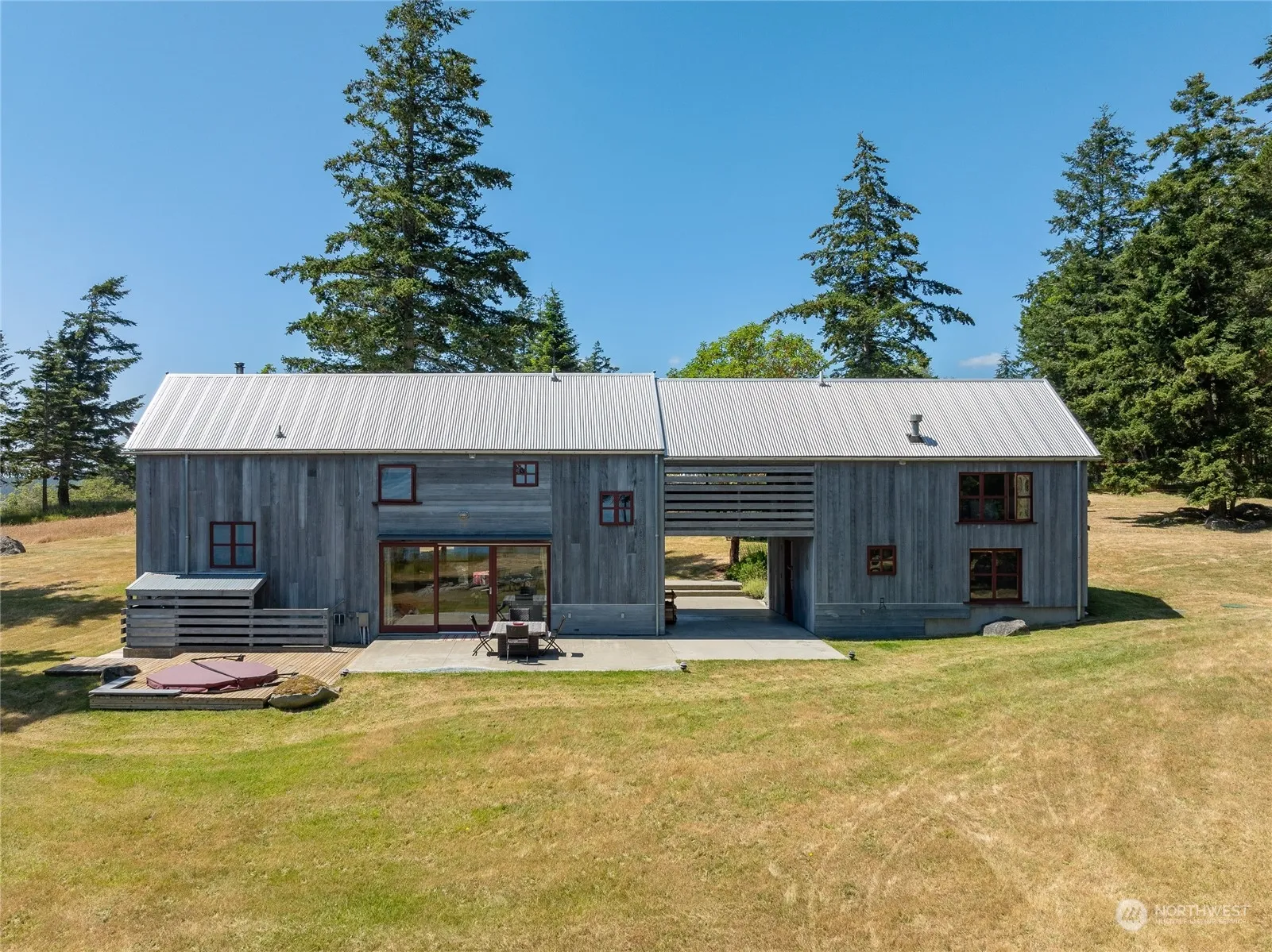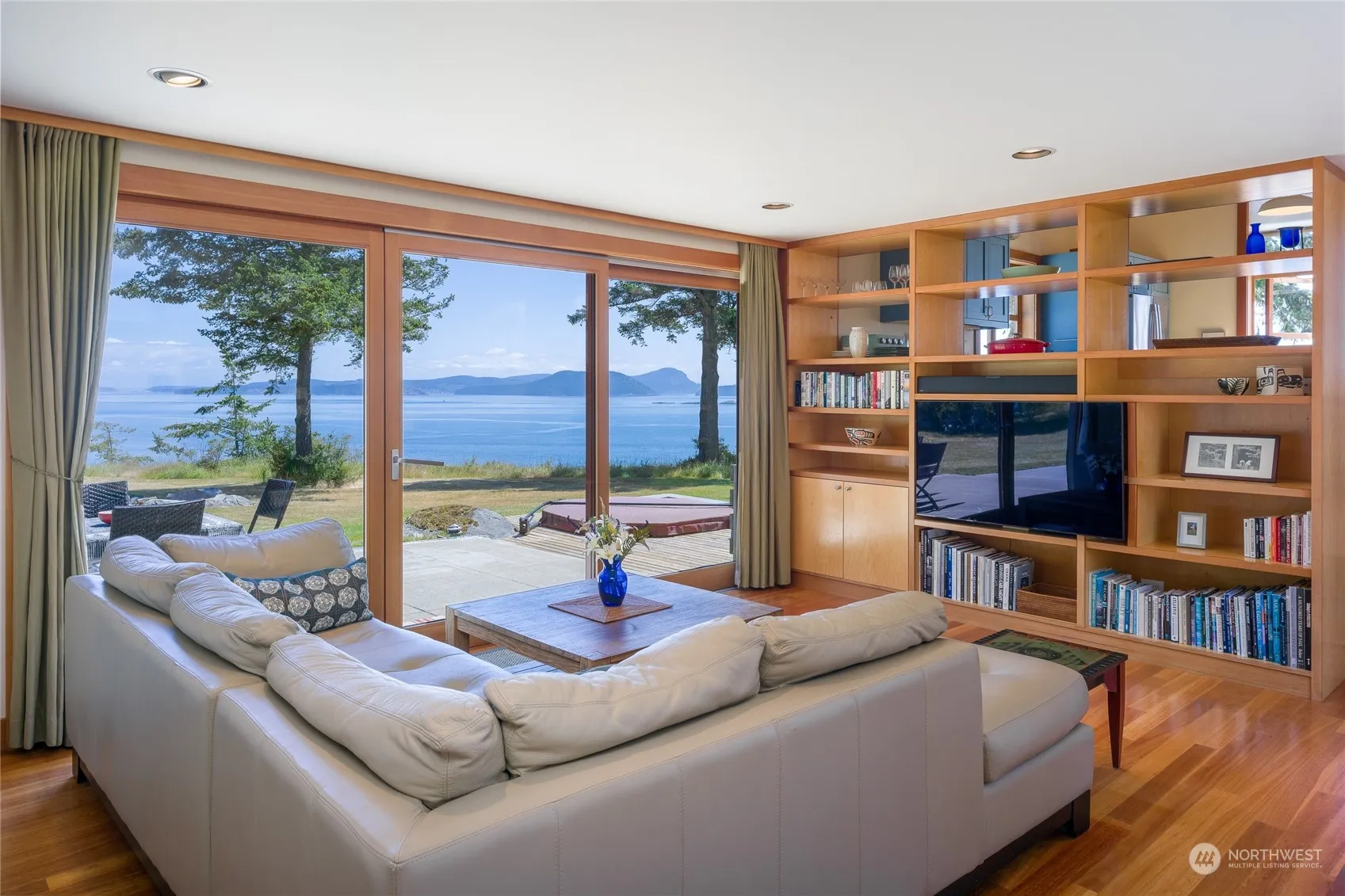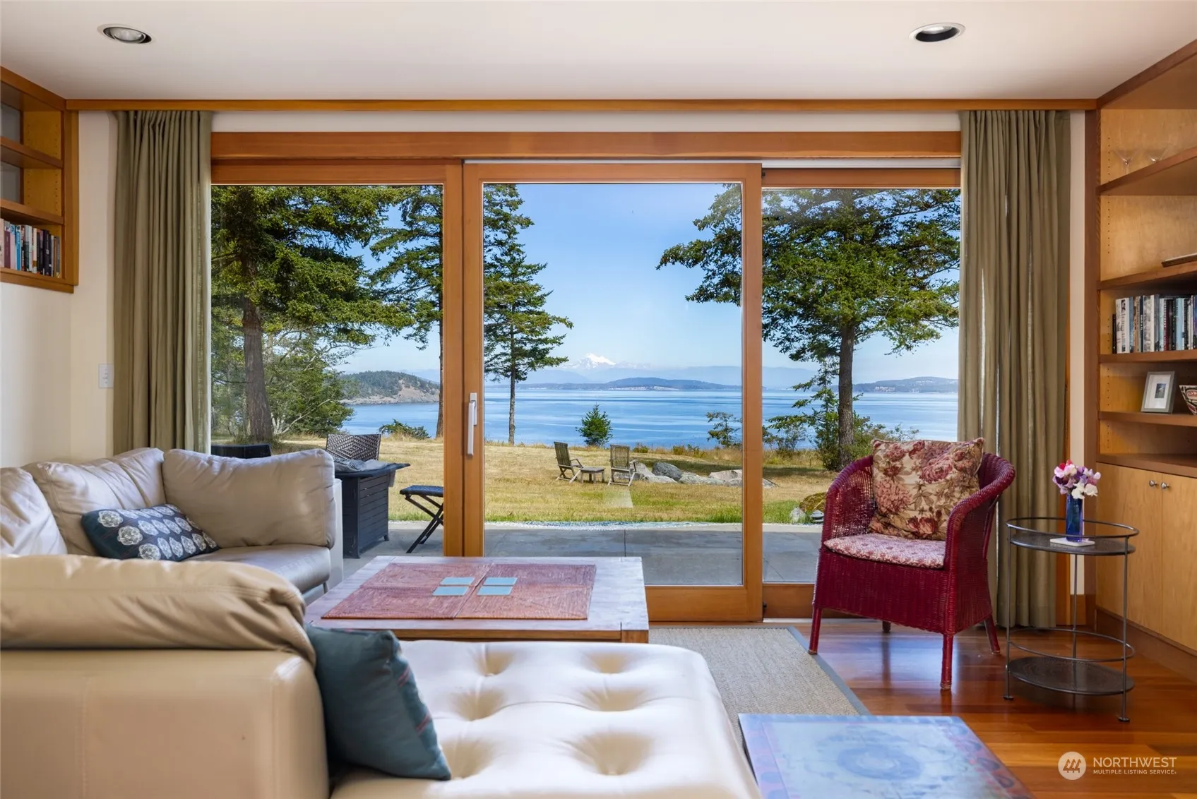 Beautifully designed & constructed Decatur Island waterfront home on 4 acres. Spectacular water & mountain views, with all-day sun. Custom features include hardwood floors, hot tub, patio/BBQ area & heat-pump HVAC. The primary suite, connected to main house by a covered catwalk, has ¾ bathroom, large closet & propane fireplace. Main floor bedroom adjoins a full bath, laundry area & home office. Upstairs, two cozy rooms share a ¾ bath & sitting area. The finished basement has a bunkroom, wine cellar & extra storage. As members of the Whitecliff Farm community, owners share 58 acres of forest & meadow with community garden, workshop, lovely trail to beach, historic cabin and own three Decatur Shores lots for dock and airstrip access.
