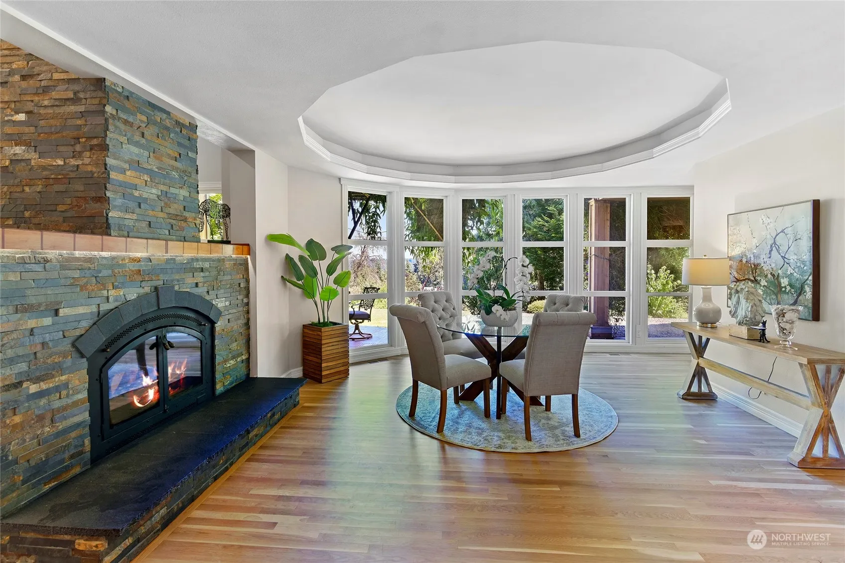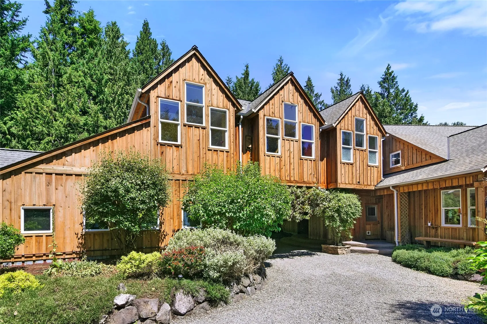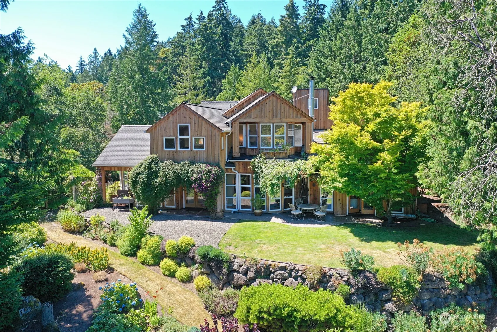 With a brand new detached two-bedroom ADU making a total of 5BR / 3,987 SF of living space, this retreat offers breathtaking views of Pleasant Beach from the office / primary bedroom. Perfectly sited on a sunny acre with well-established English gardens, this desirable compound is near coveted Point White Pier & Gazzam Lake Nature Preserve. Walls of glass ensure perpetual sunshine, multiple flexible spaces give options for offices & studios, and the lower yard is ideal for field sports. Extensive fruit trees yield 100’s of lbs annually for homemade jams and pies. With brand new carpet, freshly refinished wood floors and income potential in the ADU, this architect’s sanctuary invites you to savor the natural light in serene surroundings.