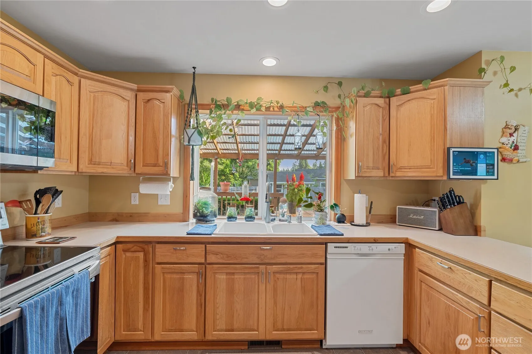 Set at the end of a quiet cul-de-sac, this 3-bedroom home with office offers 2,271 sq ft of comfort and recent updates. The kitchen features a new stove, fridge, and microwave, while the living spaces flow out to a covered back deck, perfect for entertaining. The heat pump and furnace were replaced in 2023, and the roof replaced in 2022. Enjoy grapes, blueberries, garden beds, and a playhouse in the fully fenced, landscaped yard. Dining table, chairs, Echo Show, pellet grill, and gas grill stay with the home! Relax on the covered front porch or unwind in your spacious primary suite with walk-in closet and private bath. Two-car attached garage and pantry add convenience. This is the total package, check it out today!