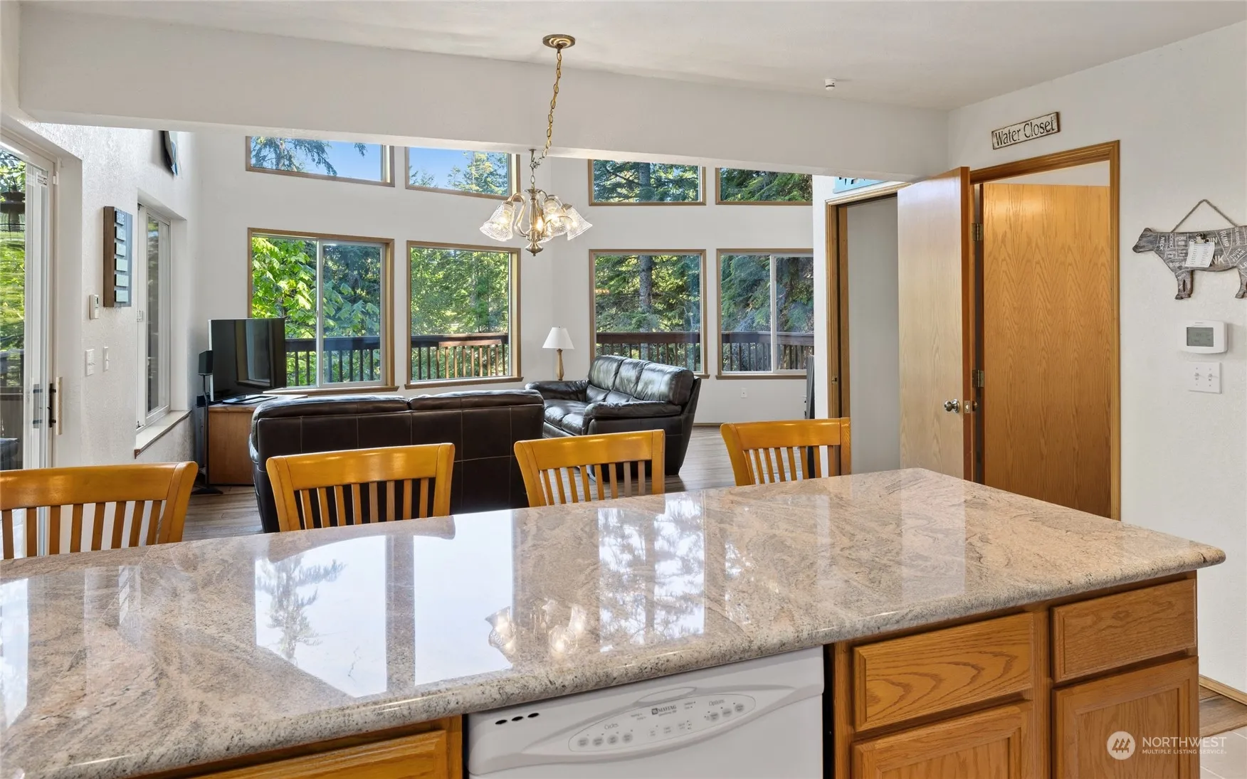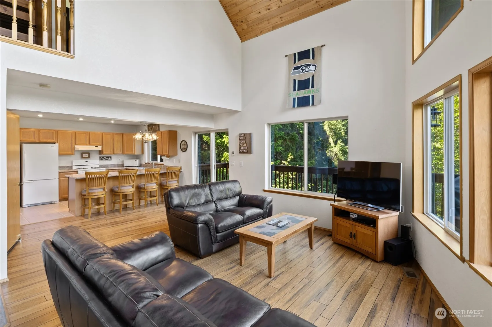 Picture perfect classic chalet at Lake Kachess! This beauty features 2 stories of soaring windows for amazing natural light. The main floor features gorgeous wood t&g ceilings, new bamboo floors, a free standing toasty wood stove, & a lovely kitchen with granite counters + eating bar. Also on main floor- a full bath, laundry w/pantry storage, & access to the wrap around front deck for sunshine & mountain views. Upstairs are 2 nice sized bedrooms with vaulted ceilings! Both have nice closets & share a full bath. The entry ground level has a tiled entry & access to the attached fully finished garage w/workbench + room for your snowmobile or jetski. New roof! Most furnishings included. Members have access to the clubhouse & private boatlaunch!