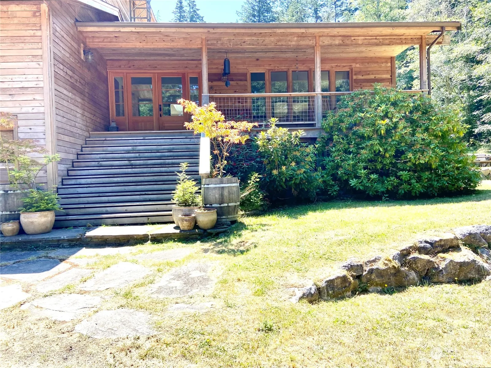 A tree-lined private driveway opens to an elegant cedar farmhouse on 4+ acres w/ gardens, apple/pear orchard, greenhouse/solarium, terraced lawns, cedar hot tub just minutes from town and schools. Practical layout w/ 4 bedrooms/2 baths upstairs, plus 1 bedroom/1 bath suite w/ separate entrance. Two living rooms, one opens to sunny garden and deck through french doors. Kitchen w/ skylights, natural quartzite countertops, breakfast bar counter. Hardwood floors w/ travertine, ceramic tile in bathrooms. Modern heat plus a wood stove. Solar panels and house battery reduce energy costs and keep lights on during winter storms. Three-car garage w/ wood shop, climbing gym, storage loft. Fast internet. Public beach and marina at the end of the road.