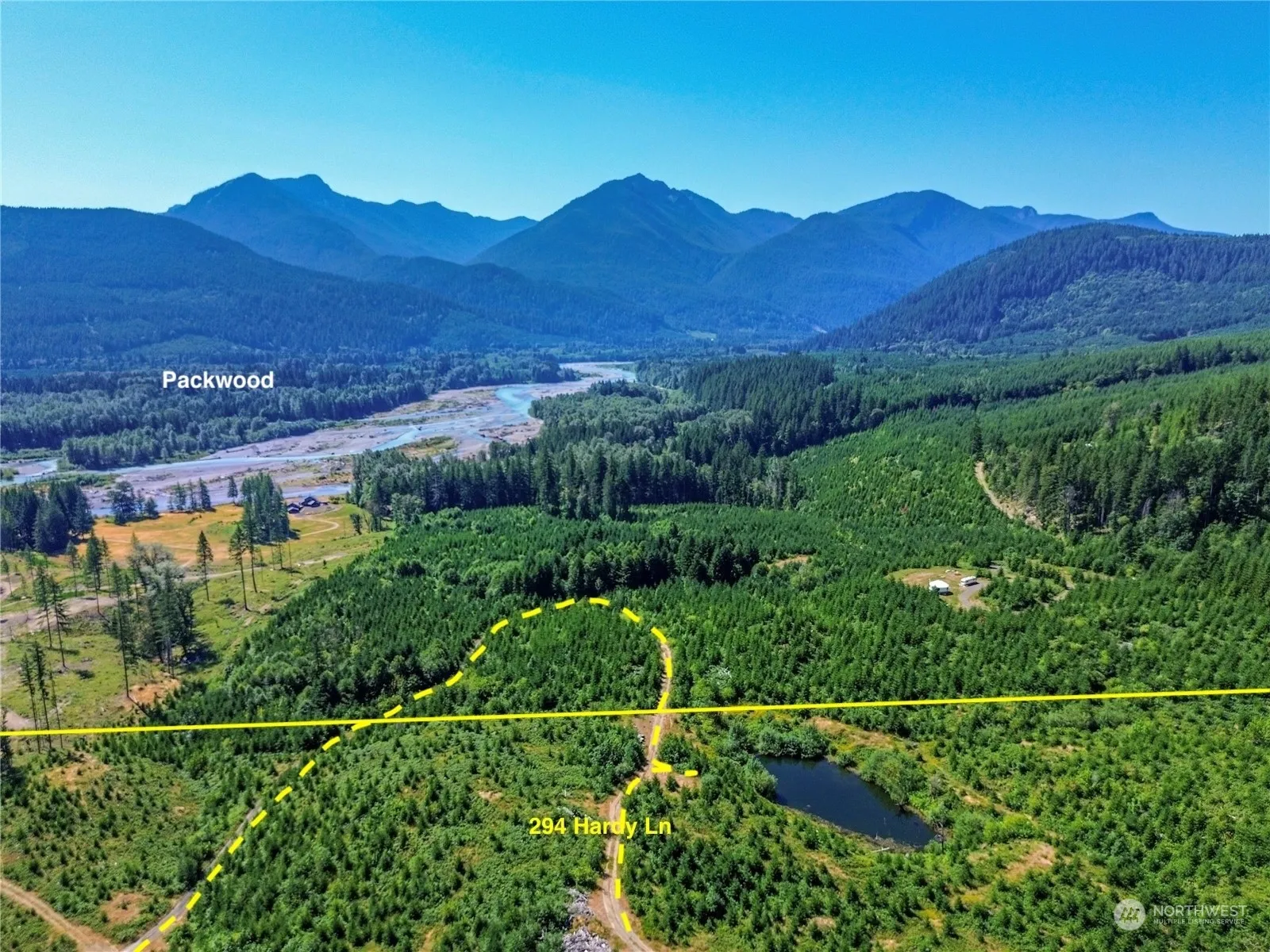 Discover 19+ acres of prime real estate in Packwood, featuring a fish pond that has been restocked several times. Building pads are in place for a stunning Northwest Home and ADU, and this is the ideal spot for your mountain getaway. Enjoy breathtaking 360-degree mountain and valley views, including Mt Rainier, the Goat Rocks, & Tatoosh Range. The property boasts replanted Fir trees under a forest tax designation for low taxes and abundant wildlife. Power on property. Drilled Well installed. Septic is needed. Adjacent to public land, less than 10 minutes from local amenities, close to White Pass Ski Area and Mount Rainier National Park. Access requires accompaniment by the listing agent; do not walk around the gates on private properties.