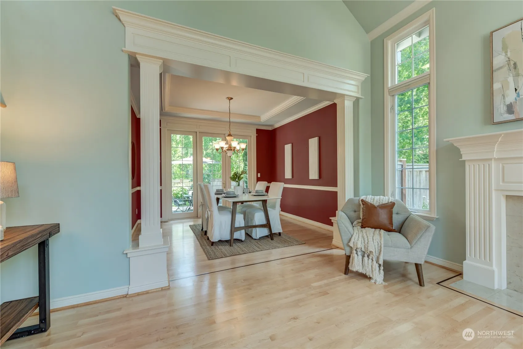 Stellar Community of River Crossing & Exceptional Construction by Buchan Homes. Just a walk away from Mill Creek Town Center w/all its amenities & corner greenbelt lot. Highlights include all solid surface flooring throughout– including refinished hrdwds. Gorgeous updated kitchen w/custom cabinets w/pull outs, new double ovens, quartz counters, center island, wine fridge, ss appl, breakfast nook. Vaulted ceiling & crown molding in beautiful liv rm w/gas frplc. Coffered ceiling in din rm French door to patio. River rock frplc & built-in cabinets in large fam rm. Primary suite w/elegant 5-piece bth & walk-in closet. 1 guest bdrm w/en-suite full bath. Tranquil backyard fully fenced w/patio. AC/heat pump & 50 yr roof. Great Mill Creek Schools!