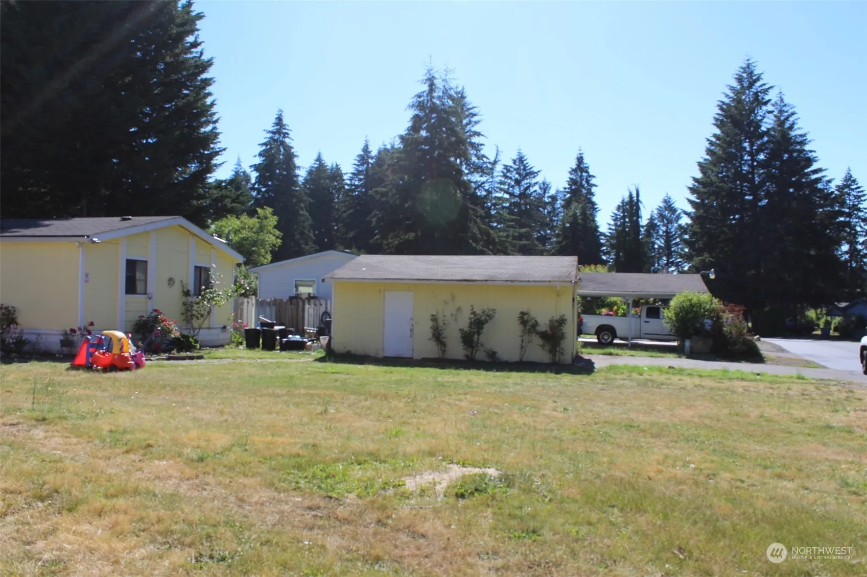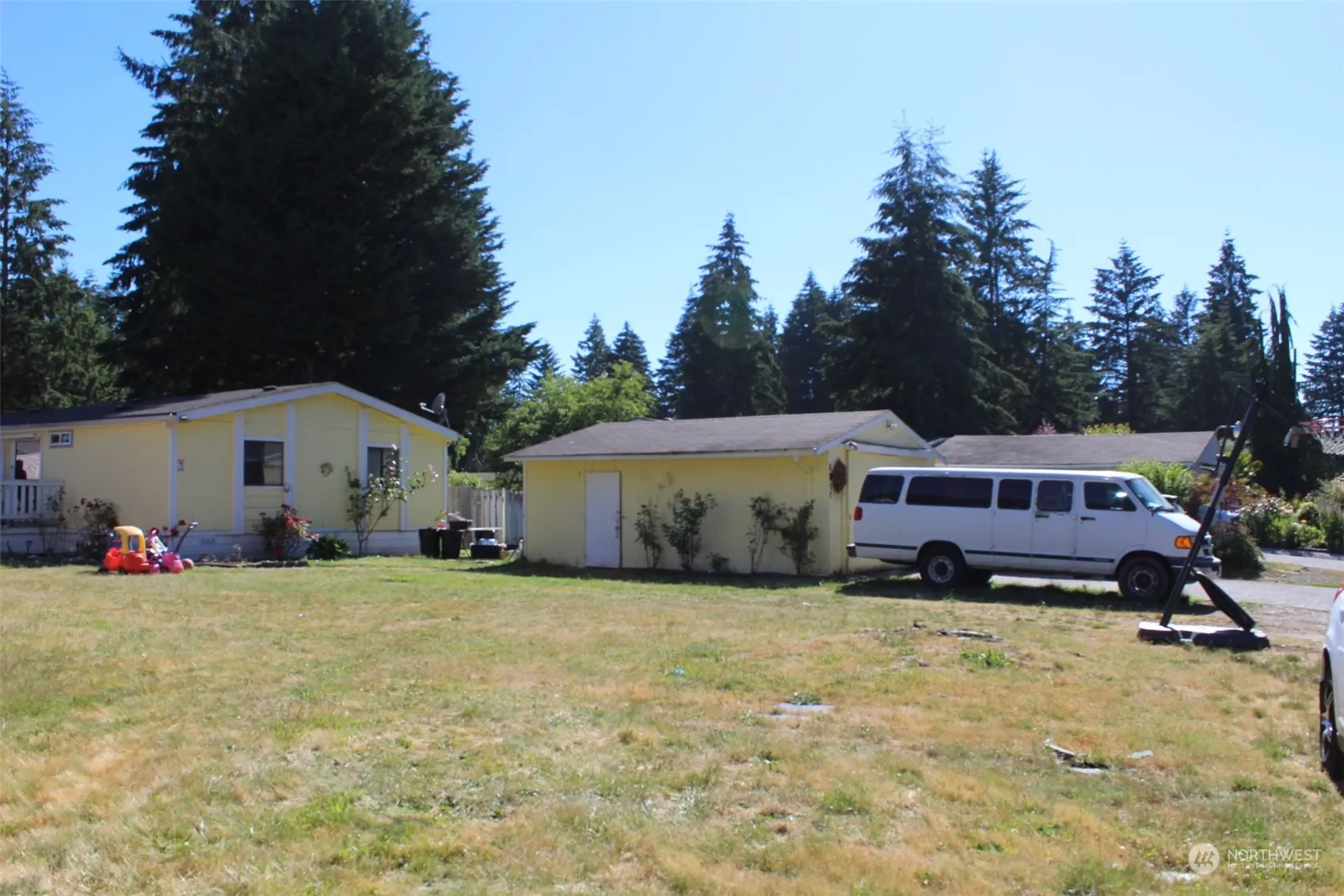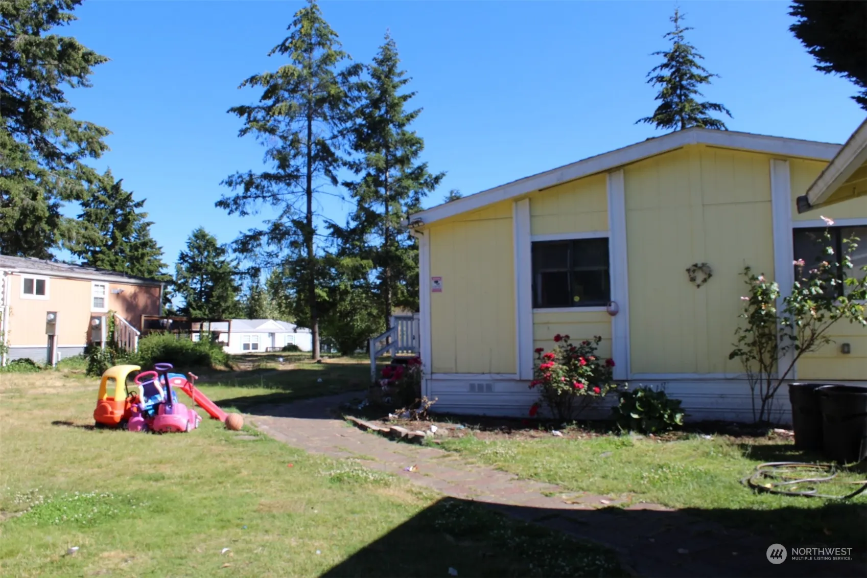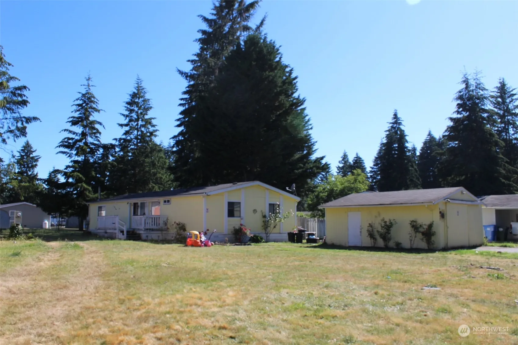 This manufactured home is located in an all-ages mobile home park. 3 bedrooms plus a bonus room and two bathrooms with standing showers. It features a huge lot, a detached two car garage and an additional shed in the back. The house needs TLC to spark again, it’s ready for a new owner. It’s approximately 1,800 sq ft. Plenty of cabinets, space and the backyard is enormous.