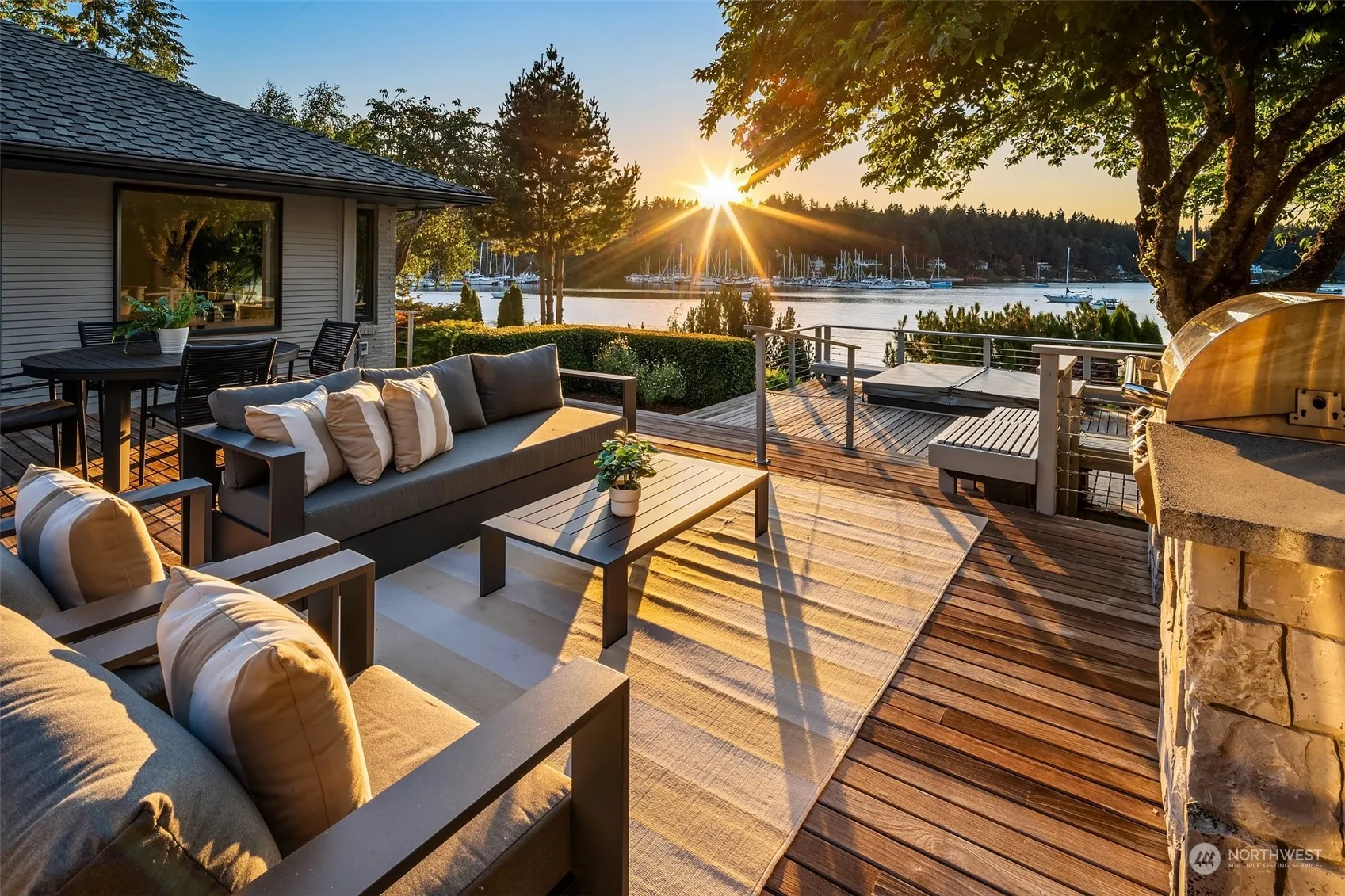 Presiding over lovely Quartermaster Harbor, this 5790sf residence is the pinnacle of luxury island living. The private 1ac estate faces west to frame the marina and stunning sunsets. Walk through cascading gardens to reach 130ft of easily accessible waterfront with a waterside deck. Inside, the midcentury design is backdropped by walls of windows that fill high-design spaces with light. The functional layout delivers multiple entertaining spaces including a sunken living room, a deckside lounge area, and a large media/rec room. The kitchen with Subzero and Wolf appliances is adjacent to a bar that opens to almost 600 feet of terraced Ipe decking where a waterside hot tub and outdoor living spaces are perfectly positioned to take in the view