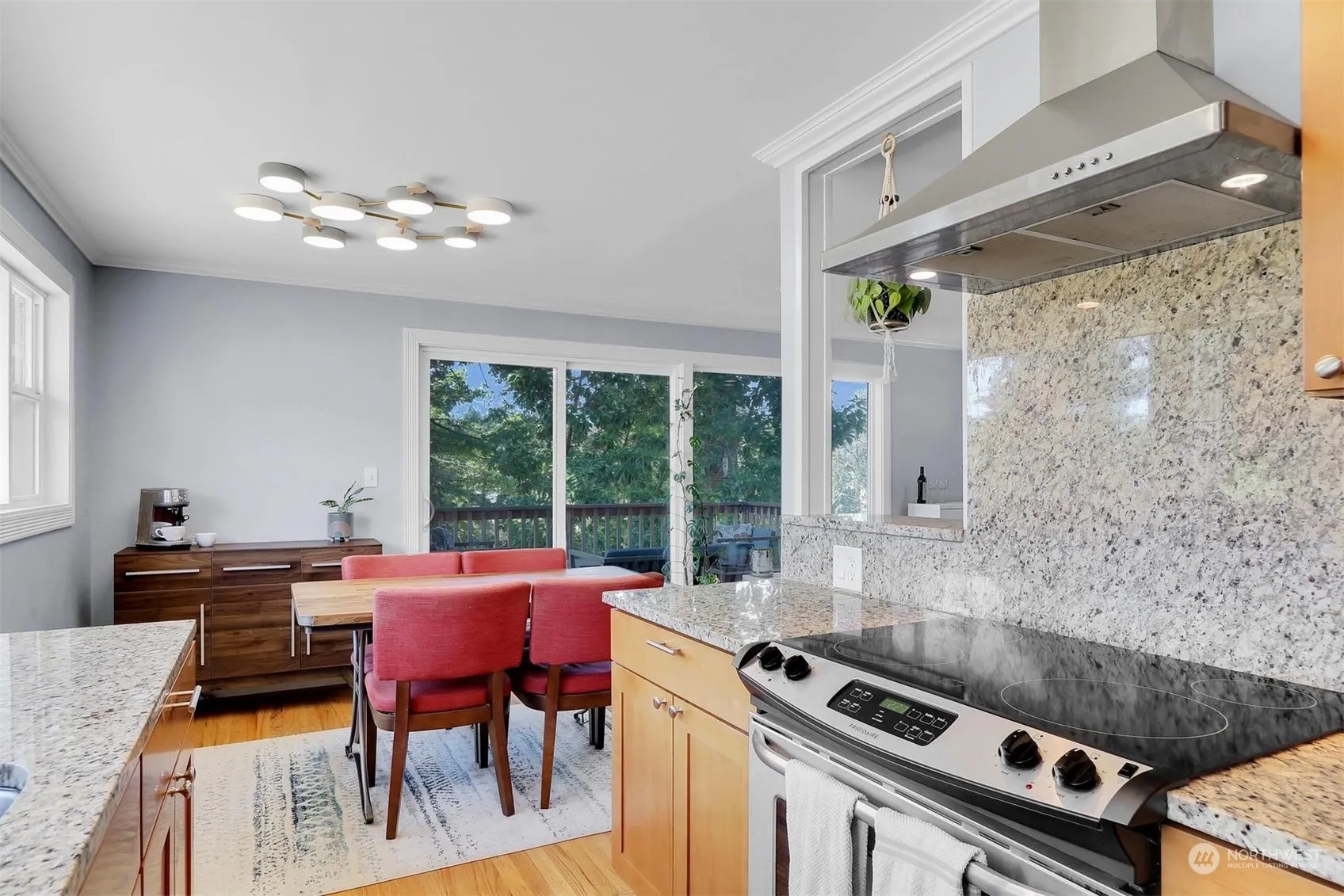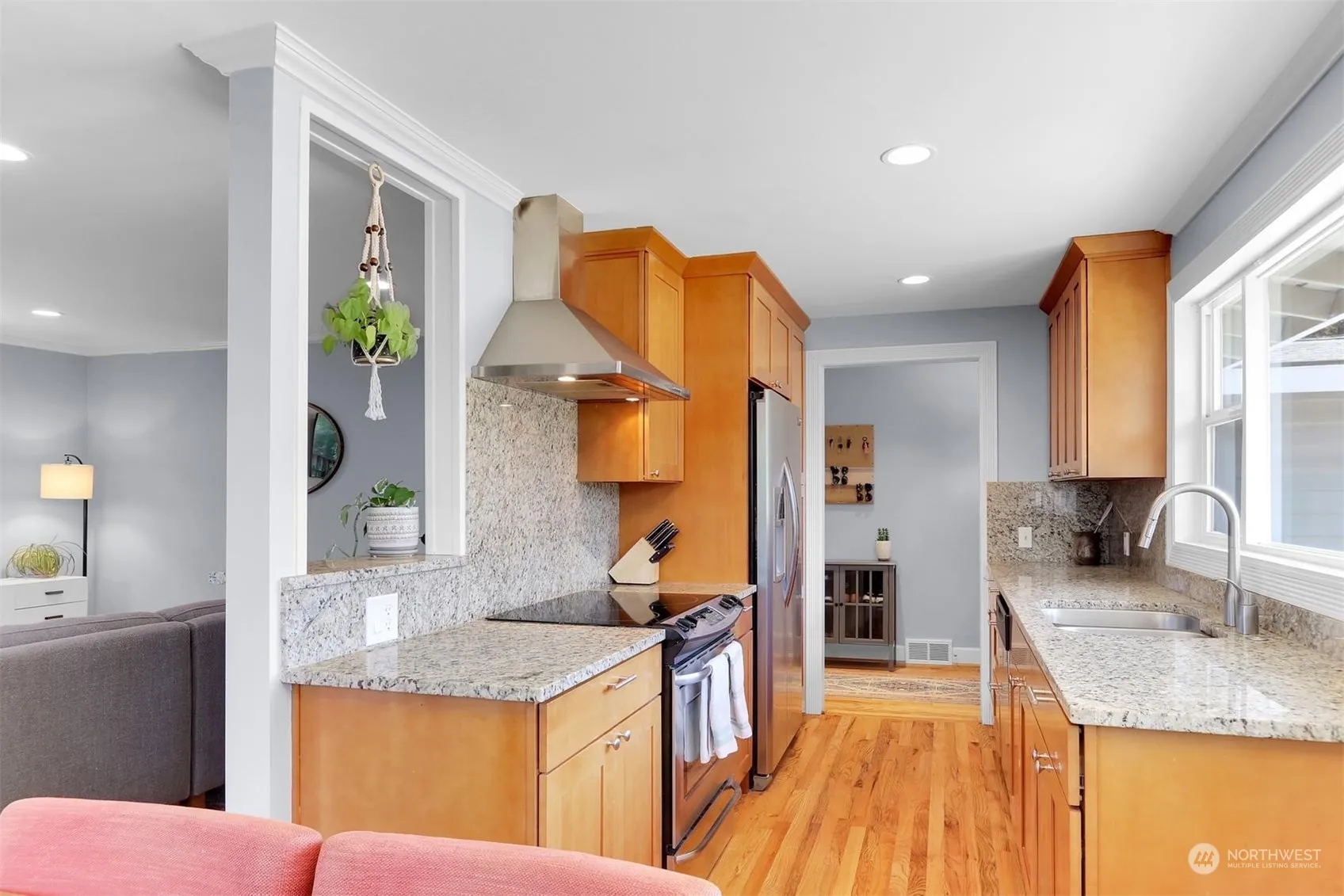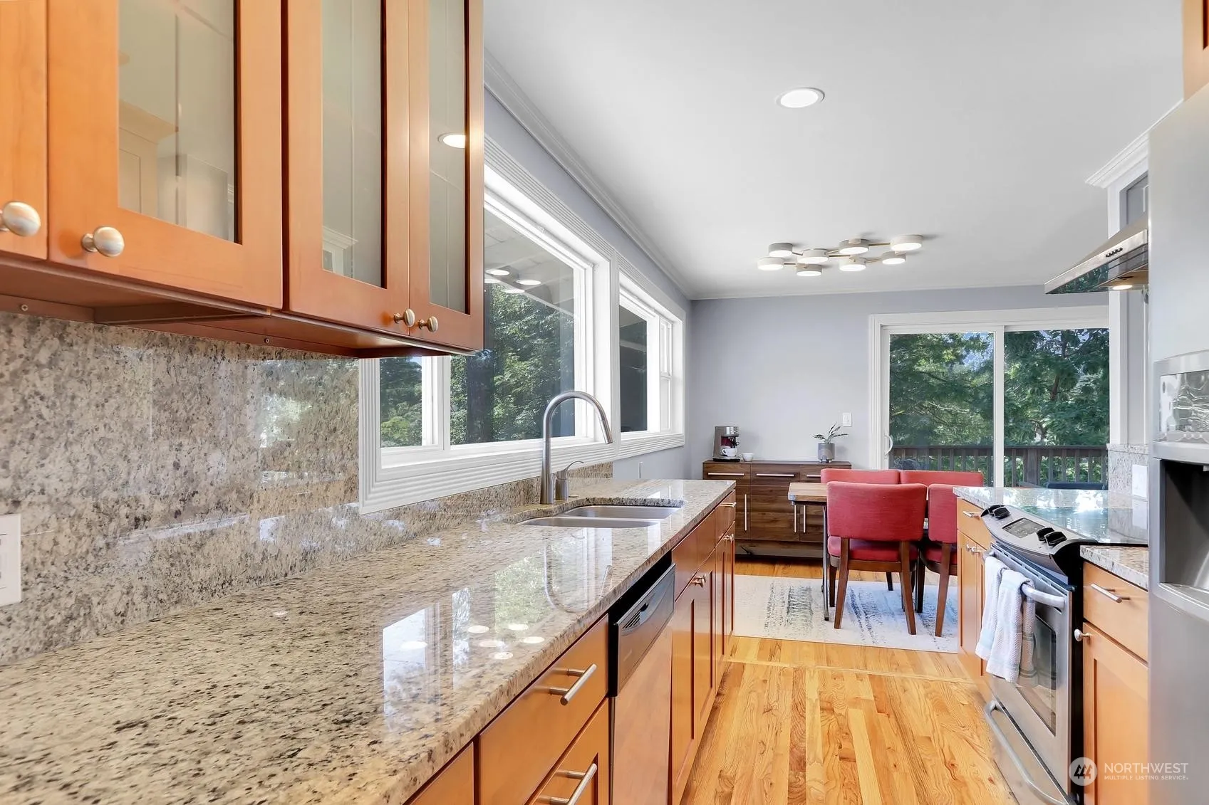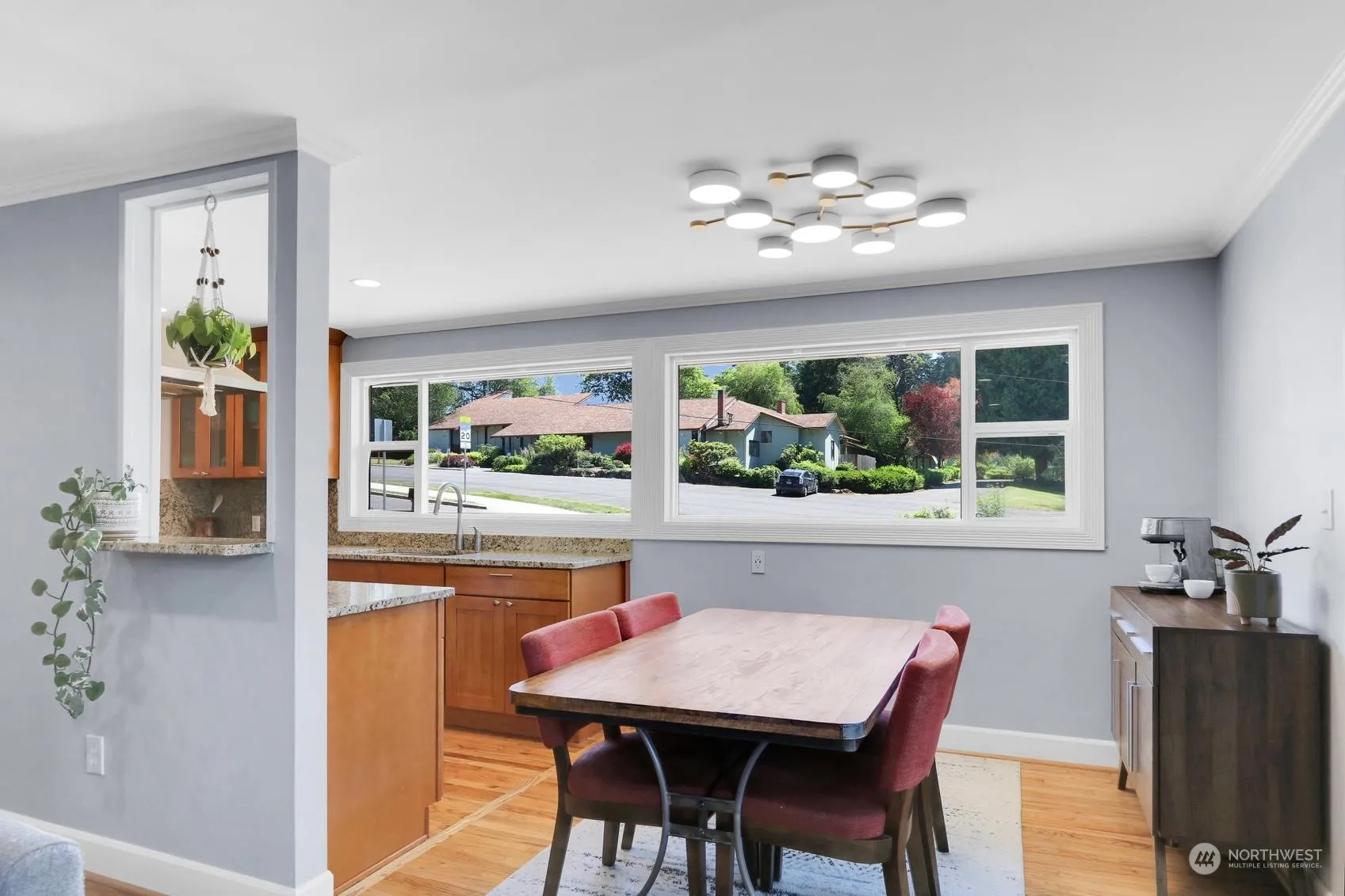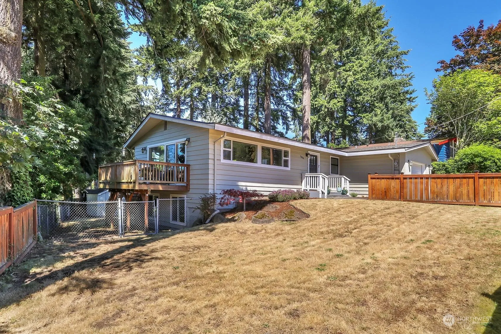This beautifully kept midcentury daylight basement rambler checks all the boxes. Refinished gleaming hardwoods, spacious bedrooms, & an elegant living room opens to your dining nook & gorgeous kitchen. Natural light fills the home & the deck invites you to a quiet sunny afternoon. Downstairs you will find the family room with a cozy wood burning fireplace, private primary bedroom with updated en suite complete with radiant floors & large customized walk in closet! The level back yard is ready to entertain with hot tub, gazebo, lights, & terraced garden spaces. Complete with a chicken coop & storage shed. Ideally located, just moments away from Aurora Village and transit center, walking distance to schools & interurban trail. House has AC