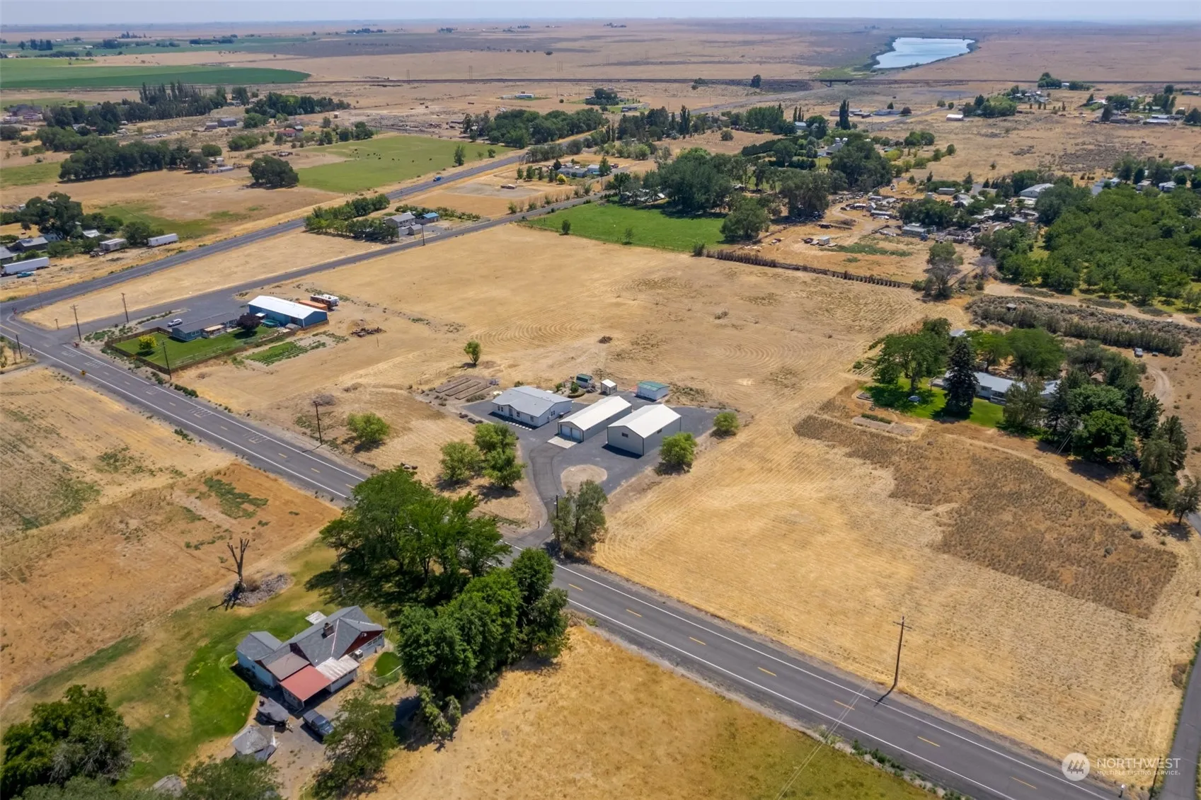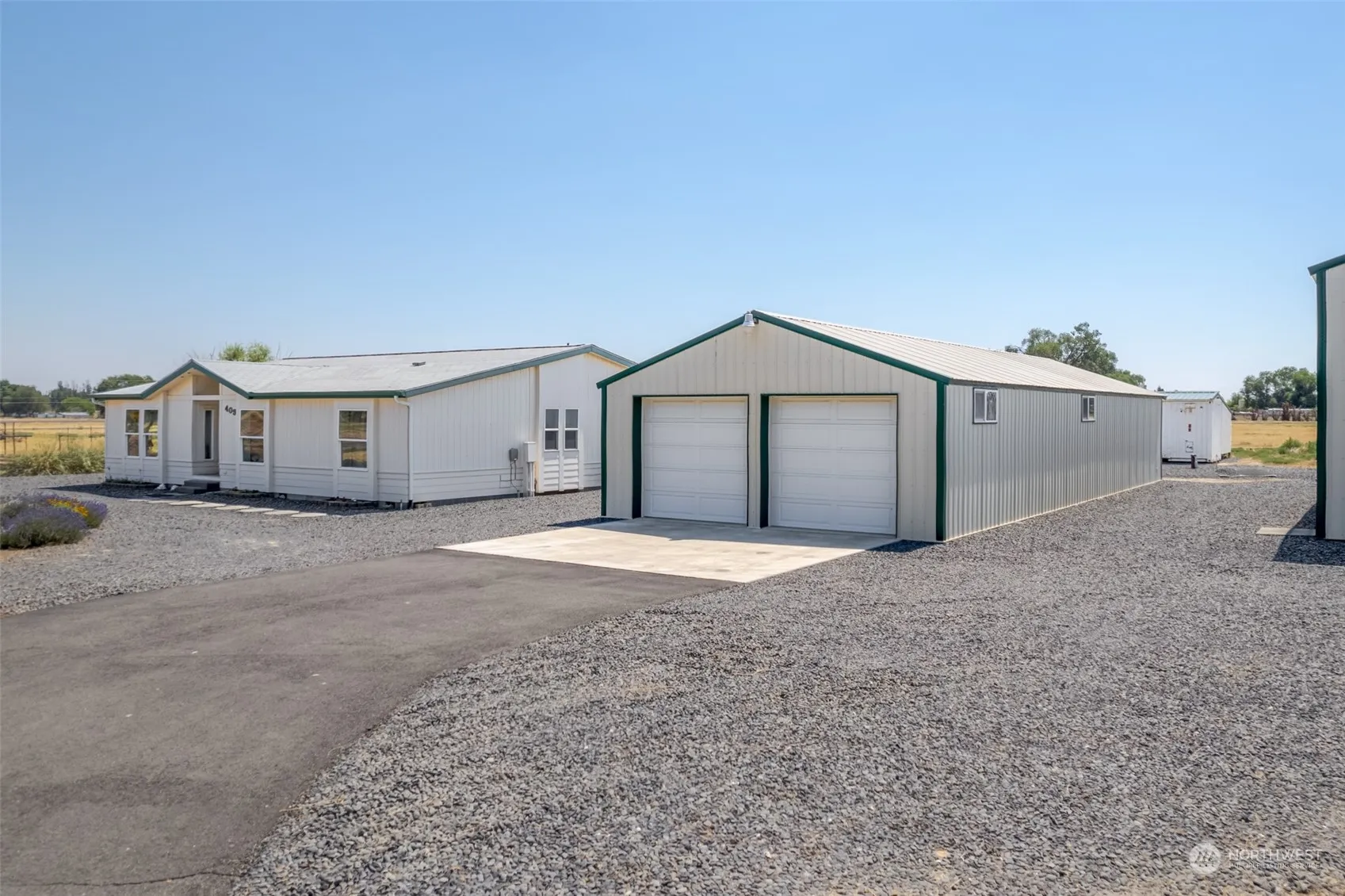 Great 3 bedroom 2 bathroom home on 5 acres! This property offers the perfect blend of comfort and space. Large primary suite with corner tub, double sinks and large vanity. 2 living spacious rooms and the laundry room off the back porch for convenience. Featuring 2 detached units, a double gar garage approximately 1440 square feet with automatic doors and large work area separated. Huge RV shop with gravel flooring, 3 bays and doors for parking and loft storage! Wonderful zero scape landscaping. Plenty of garden space, greenhouse and storage sheds. This is an outdoor paradise.