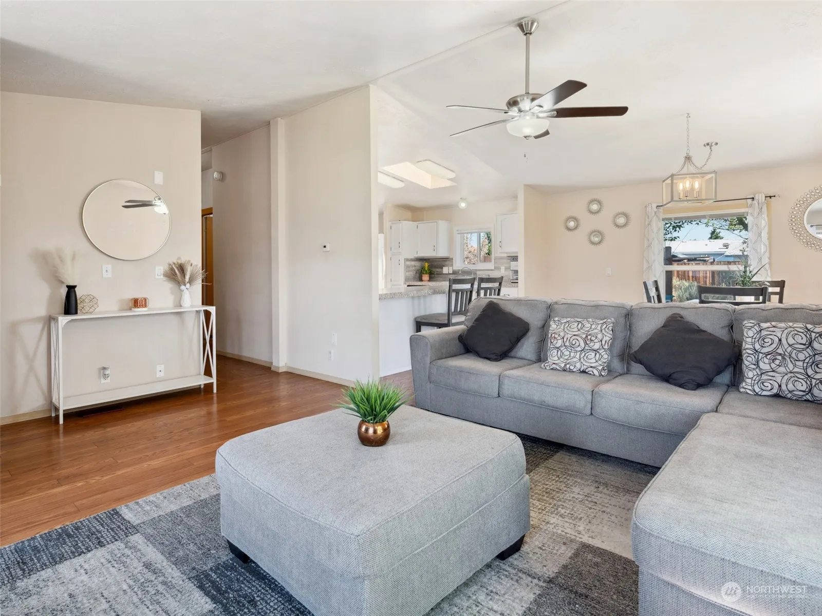 Discover relaxed living in Desert Aire with this inviting 2 bedroom, 2 bath home with 1,188 SF of living space. A comfortable retreat with laminate flooring throughout, spacious kitchen with upgraded appliances, skylights, abundant storage, ceiling fans, designer fixtures, & vaulted ceilings. Primary suite with attached bath + dual sinks & walk-in closet as well. Enjoy the convenience of a massive 1,185 SF detached garage with 3-bays, ample parking, use it as a shop, or to store all the toys! Residents benefit from access to community amenities including Golf course, airfield, community pool and park, tennis courts, gym, walking trails and boat launch! 300+ Days of Sunshine a year!