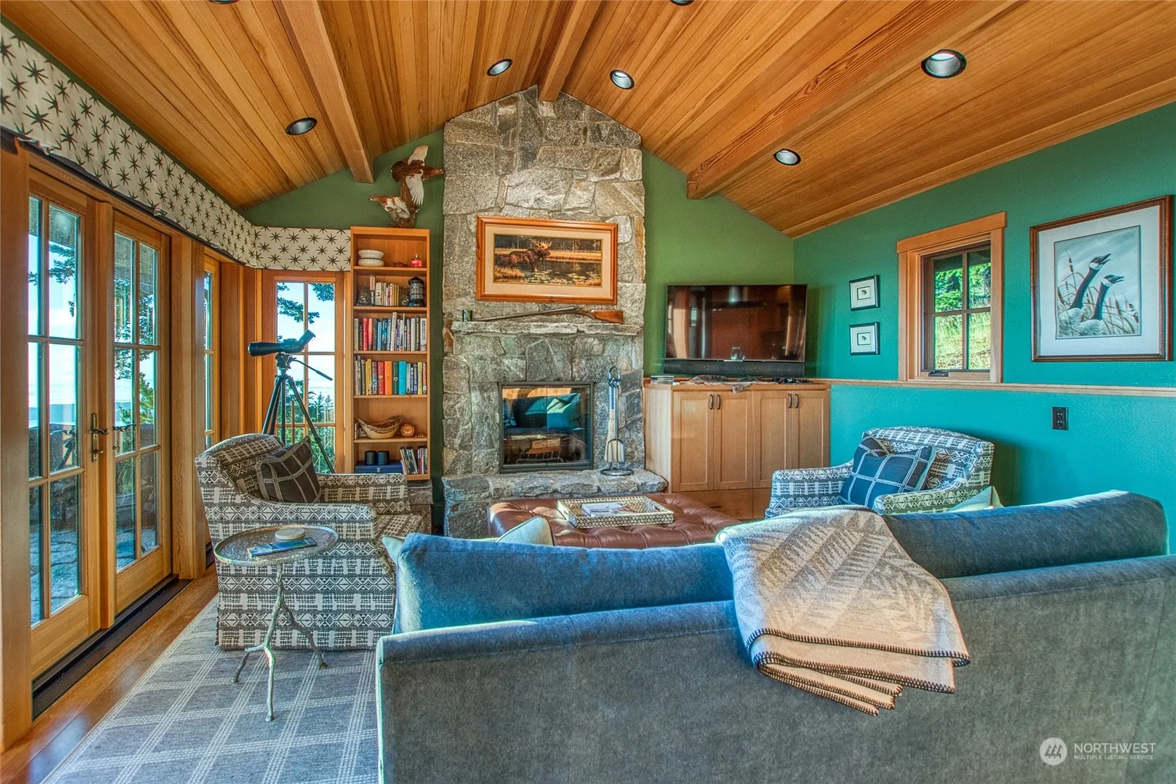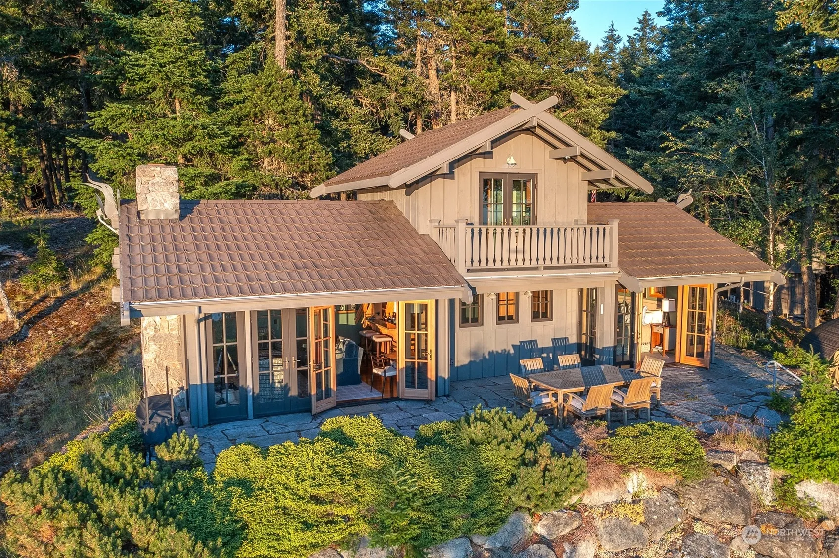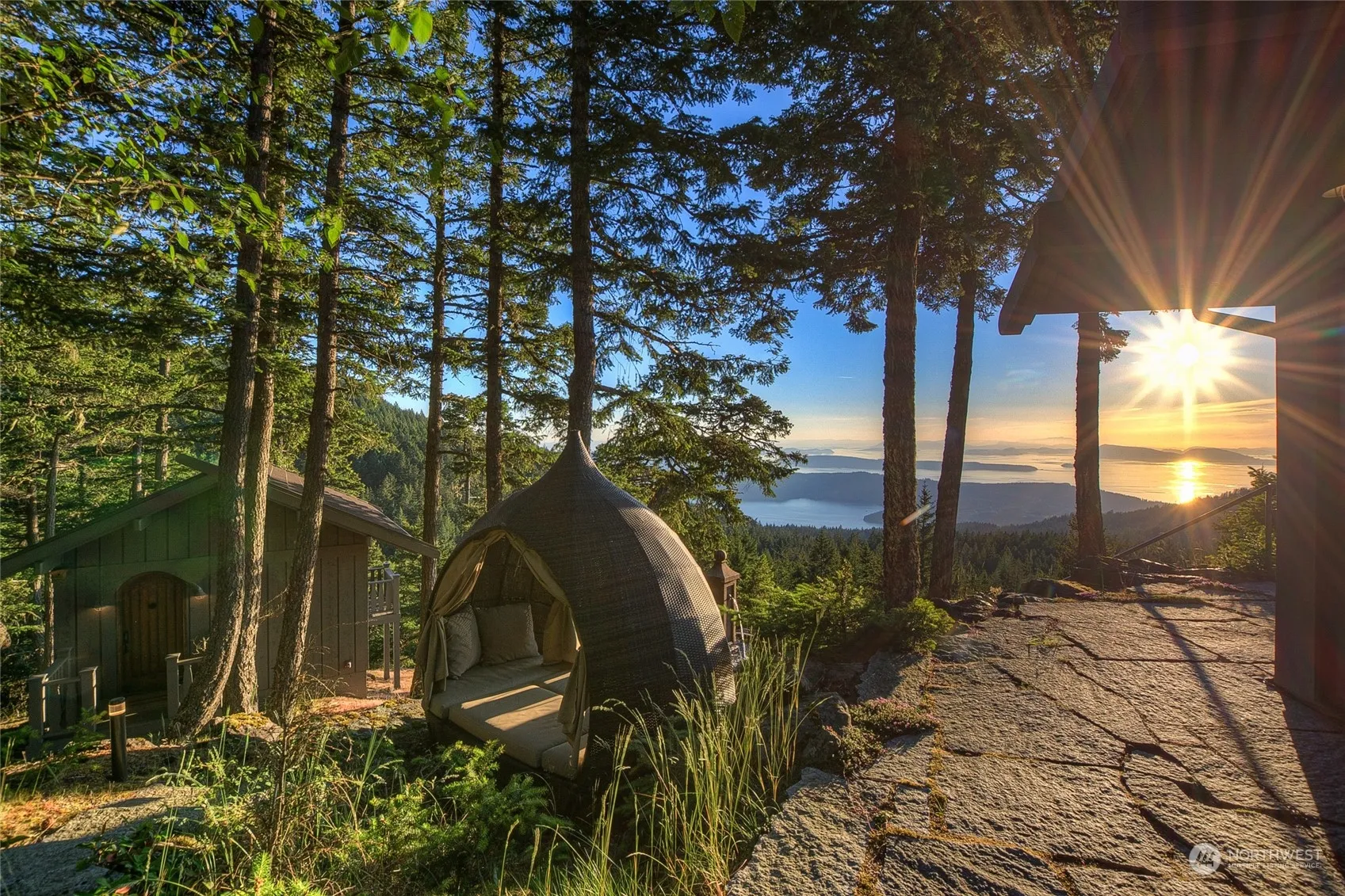 You have arrived. Left the busy life at the bottom of the mountain. Magic in the forest welcomes you at the top. Upon arrival the view pulls you in. You know you are somewhere special. This very unique property is located at one of the highest elevations in the San Juan Islands. You will feel like you are floating on top of the world. The structures are well thought out, designed to give space when you need it, but also share moments with the ones you want to be with. Three distinctly different structures: Main Home with full kitchen, fireplace, primary bedroom ensuite, upper office/deck + 1.5 bath; Sauna Cottage with 1 bedroom/full bath, studio kitchen and new Harvia Sauna; And the Blue Cottage with open bedroom/ensuite +viewing deck.