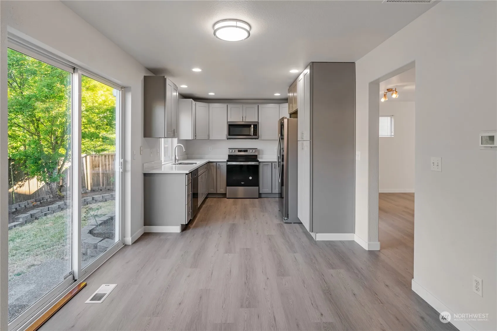 Move in ready in Sedona gated community. The home comes with a newly remodeled kitchen, all new stainless steel appliances, bathrooms, flooring, interior paint and much more. Downstairs boast of big living room, family room and half bathroom. Upstairs features primary bedroom with walk in closet, two more rooms and the utility room. Low maintenance sizeable flat yard with Turf Shed. With little to maintain for years to come, you cannot go wrong on this one!
