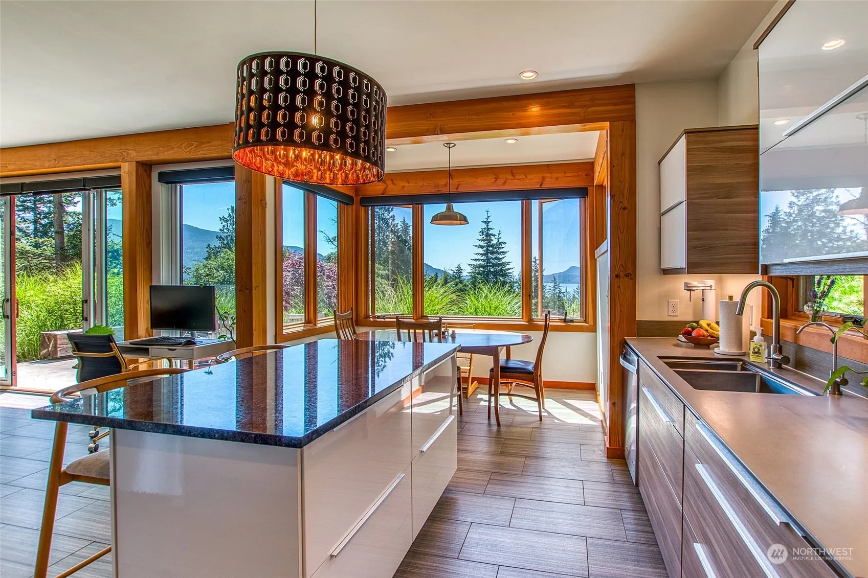 Elegant and bright 3 bedroom, 2 bath 1700 sq. ft. home on .42 acres near Eastsound Village. This modern Pacific Northwest contemporary design is filled with sunlight and warm fir trim details creating an inviting and relaxing home. Paths, patios and decks allow you to fully enjoy this property. Mature and lush gardens lead to a rooftop deck for outdoor dining and entertaining located over a detached two car garage. Enjoy this peaceful and convenient location near town with all of the Eastsound Village amenities. Nearby public waterfront park and schools. Features include: solar panels, radiant heat Marazzi porcelain tile floors and metal roof. Eastsound Sewer, Eastsound Water, high-speed interenet.