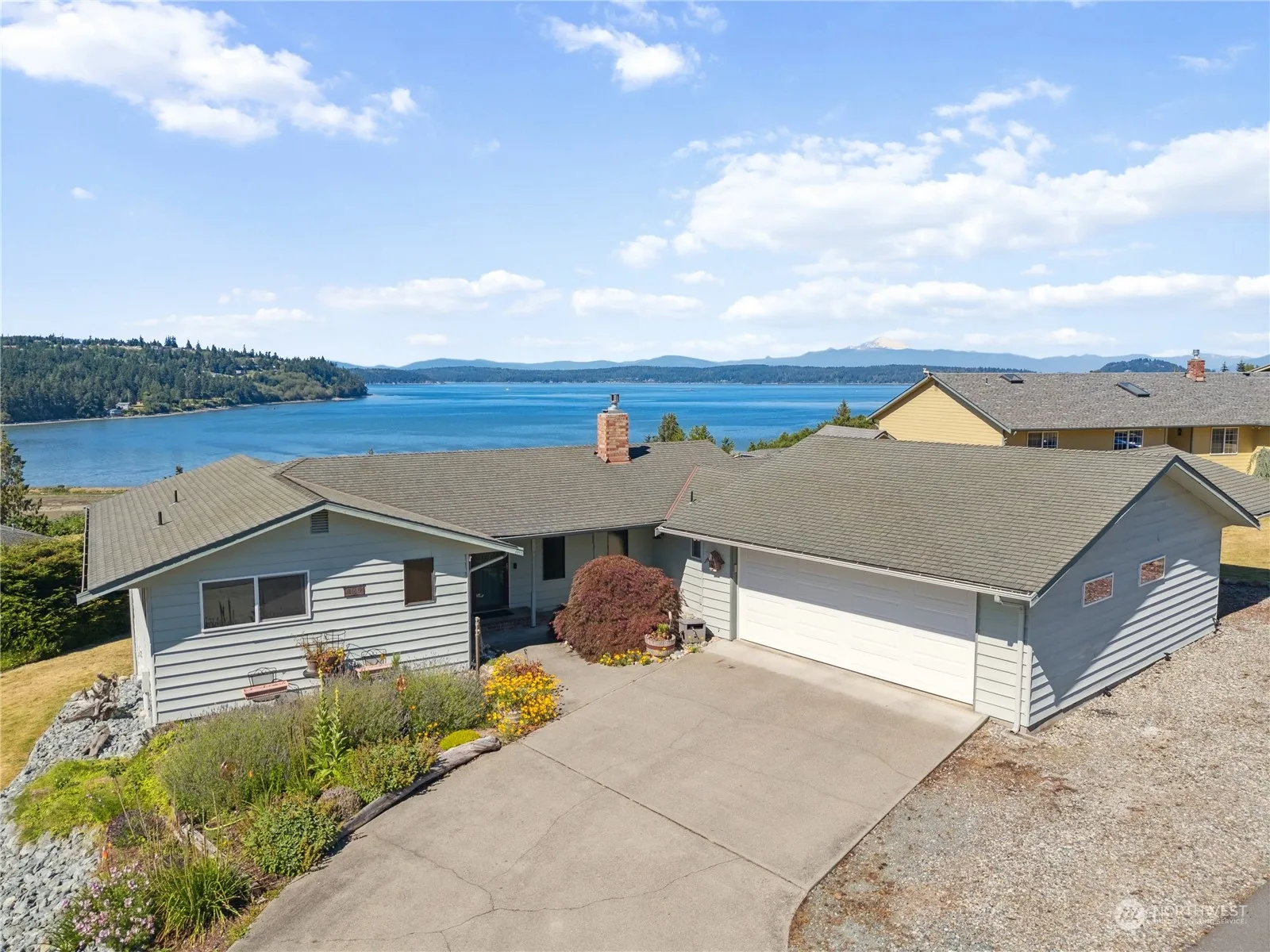 Imagine waking up to breathtaking views of Mount Baker & Dugualla Bay every morning from your own corner lot retreat. This recently updated home offers modern comforts including new windows, vinyl plank flooring, a cozy stone gas fireplace, and a heat pump/AC for year-round comfort. Light, bright & open concept living, dining & kitchen, boasting a cook island, ss appliances, & a convenient walk-in pantry. The lower-level surprises with a spacious multipurpose room perfect for a rec room or guest suite. Step outside onto the deck to soak in the panoramic views or take a stroll to the community beach with a clubhouse just steps away. Discover the perfect blend of modern amenities and serene coastal living in this spacious Whidbey Island gem.