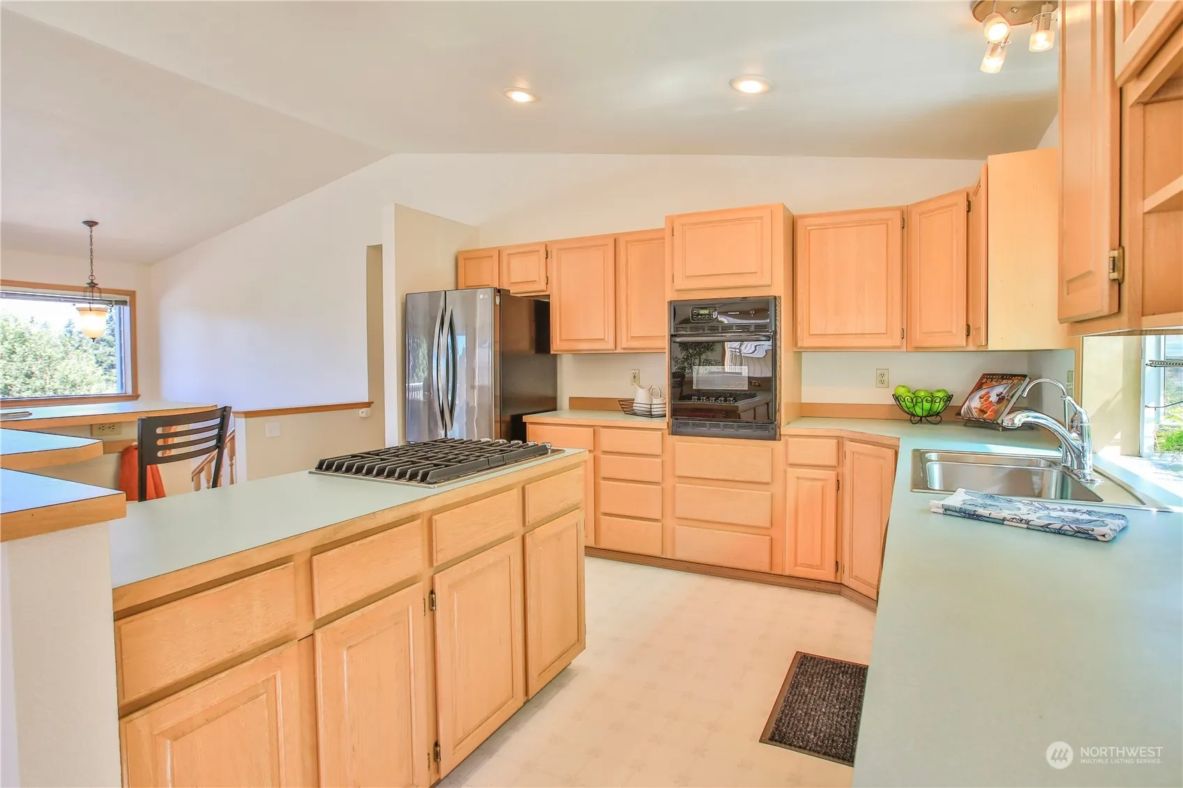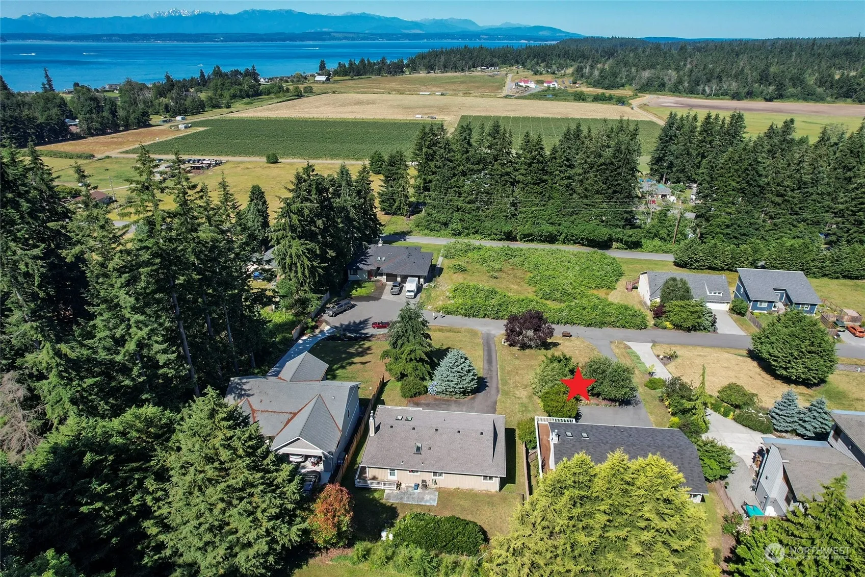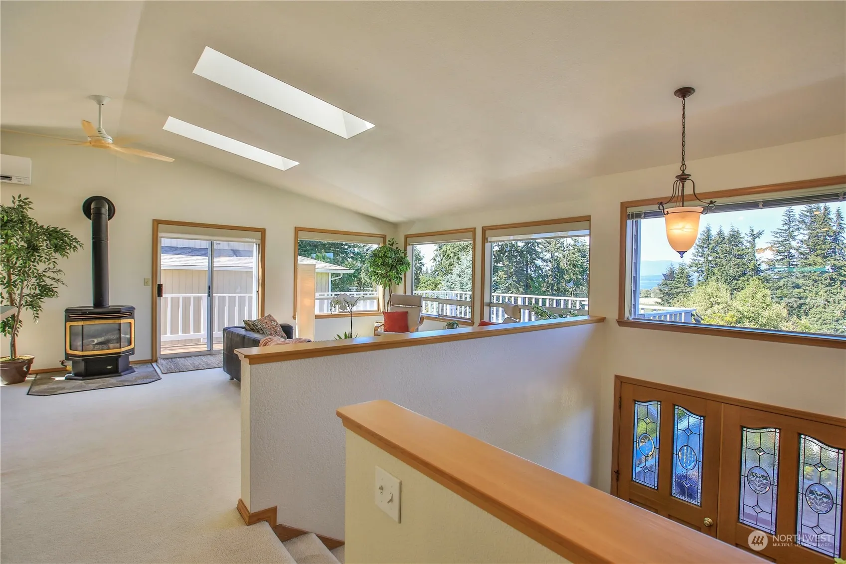 Light, bright, westerly views of shipping lanes and Olympics and sunsets from this Northwest home. Light-filled, spacious great room with vaulted ceilings, skylights, propane stove plus mini-split for optimal heating and cooling. Sliding door opens to wrap-around view deck. Expansive kitchen with breakfast bar and dining area opens onto private, back deck with fruit trees, terraced beds and fenced yard. Water-view, primary bedroom with beautifully updated ensuite bath, second bedroom, office, oversized garage, and plenty of storage. Lower level, separate unit with view patio has good rental history. Conveniently near Freeland services and bus.