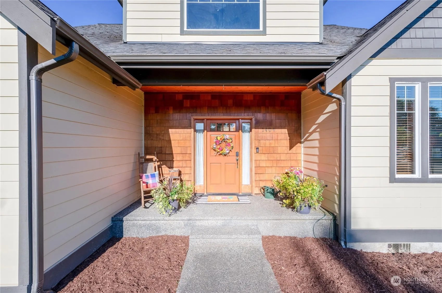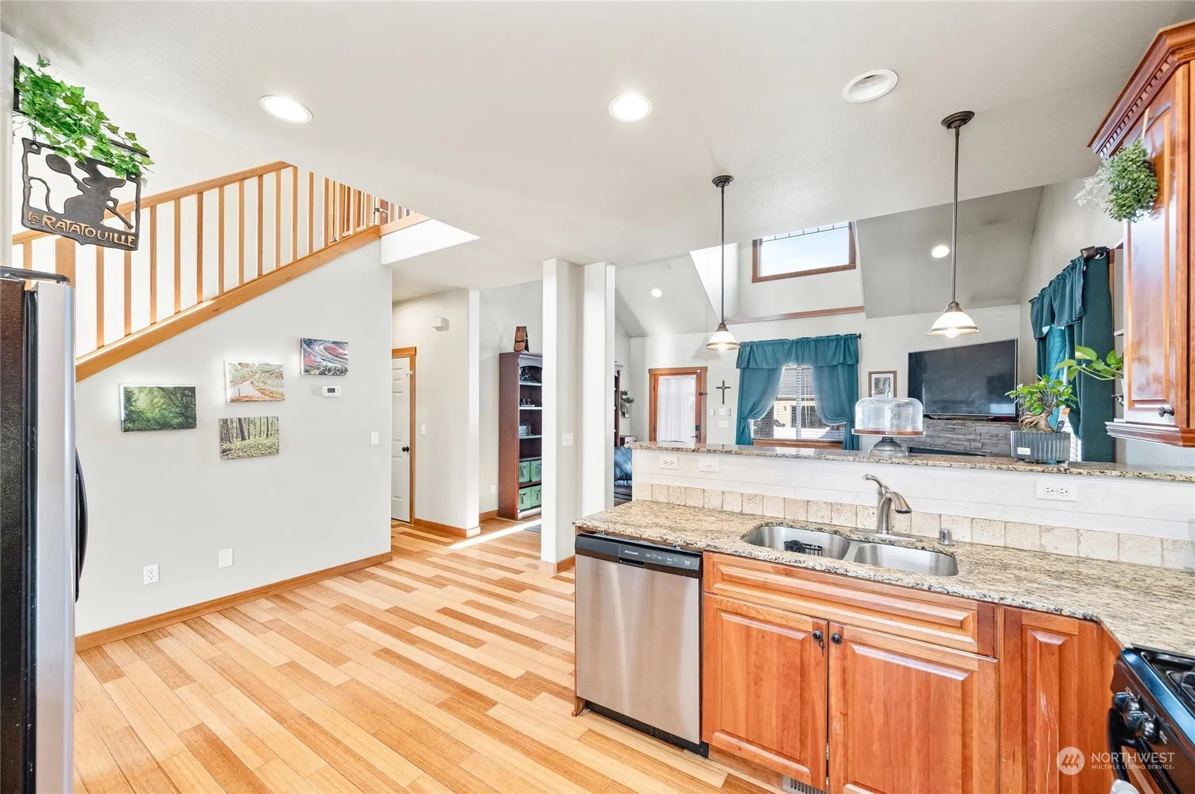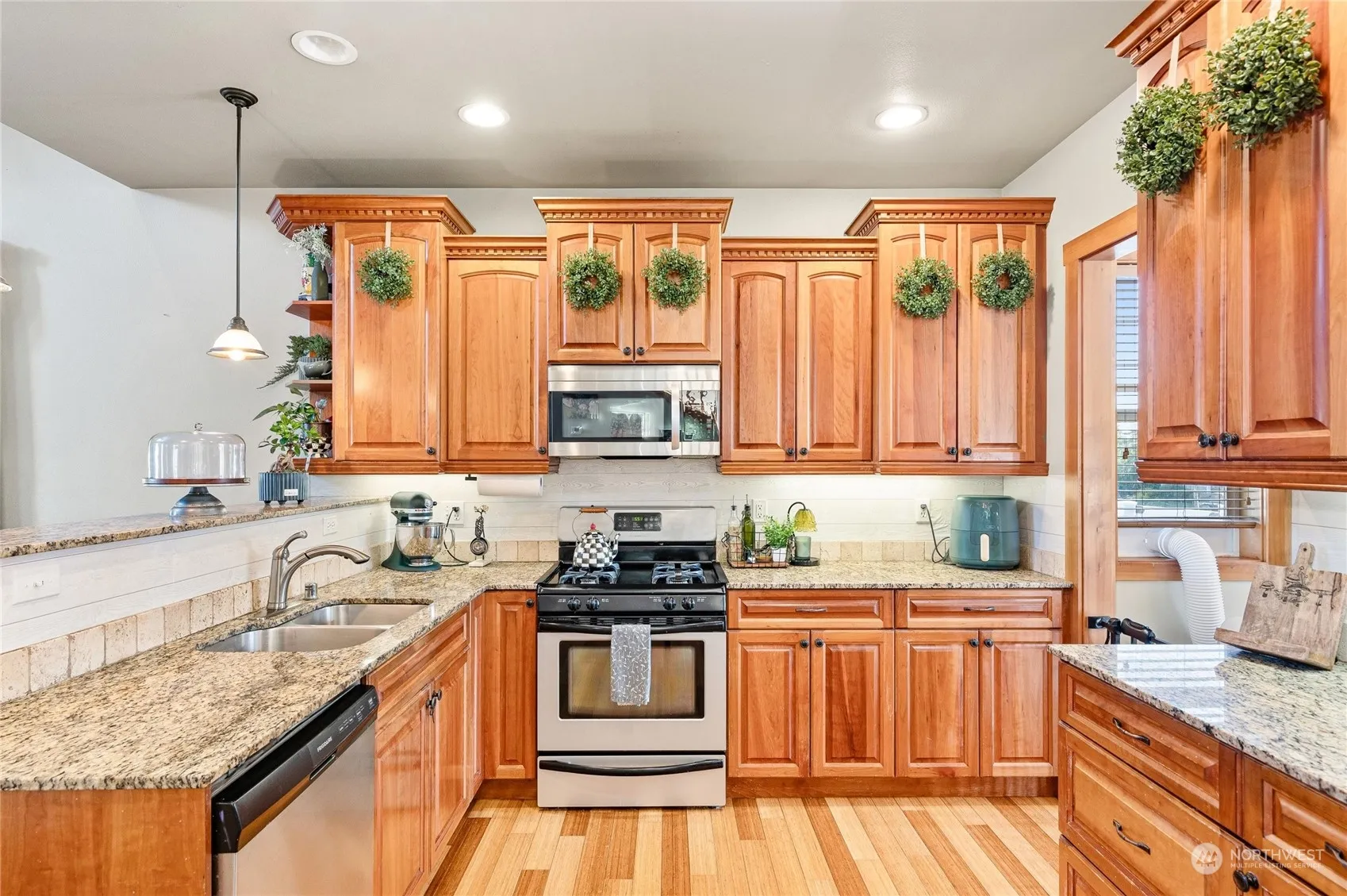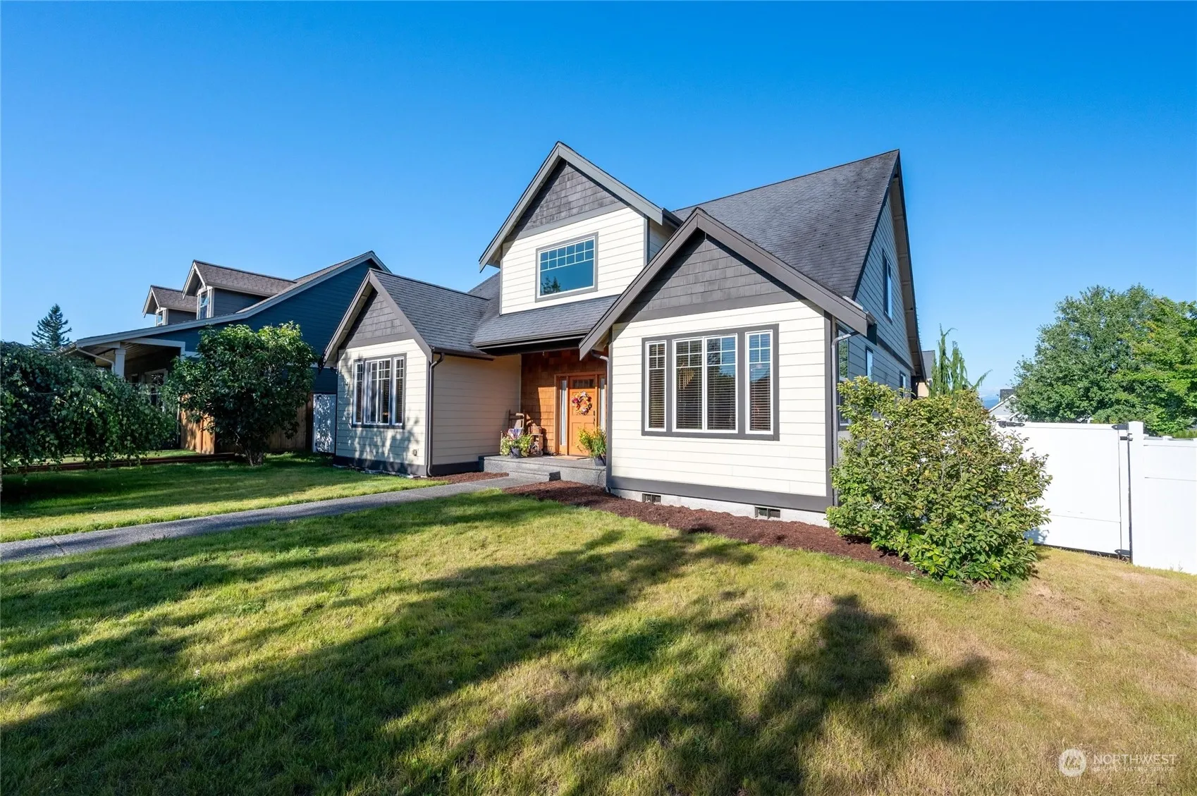Stunningly crafted home perfectly positioned on an expansive corner lot with custom features throughout. The open floor plan boasts cherry cabinets, granite countertops, and stainless steel appliances. The main floor features extensive bamboo flooring, vaulted ceilings, a cozy gas fireplace, and a spacious patio ideal for entertaining. The primary suite on the main floor includes dual walk-in closets, a double tiled shower, and a luxurious jetted tub. Upstairs, find two additional bedrooms and a bonus room. The landscaped yard features a sports court, providing both beauty and functionality. Welcome to the essence of living in the highly sought-after Lynden neighborhood, where scenic walking trails and charming parks are just steps away.