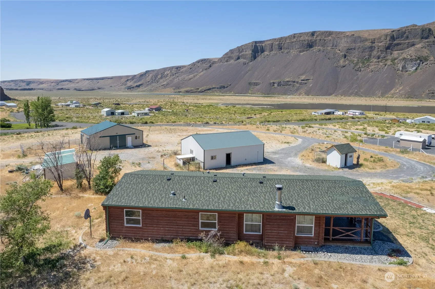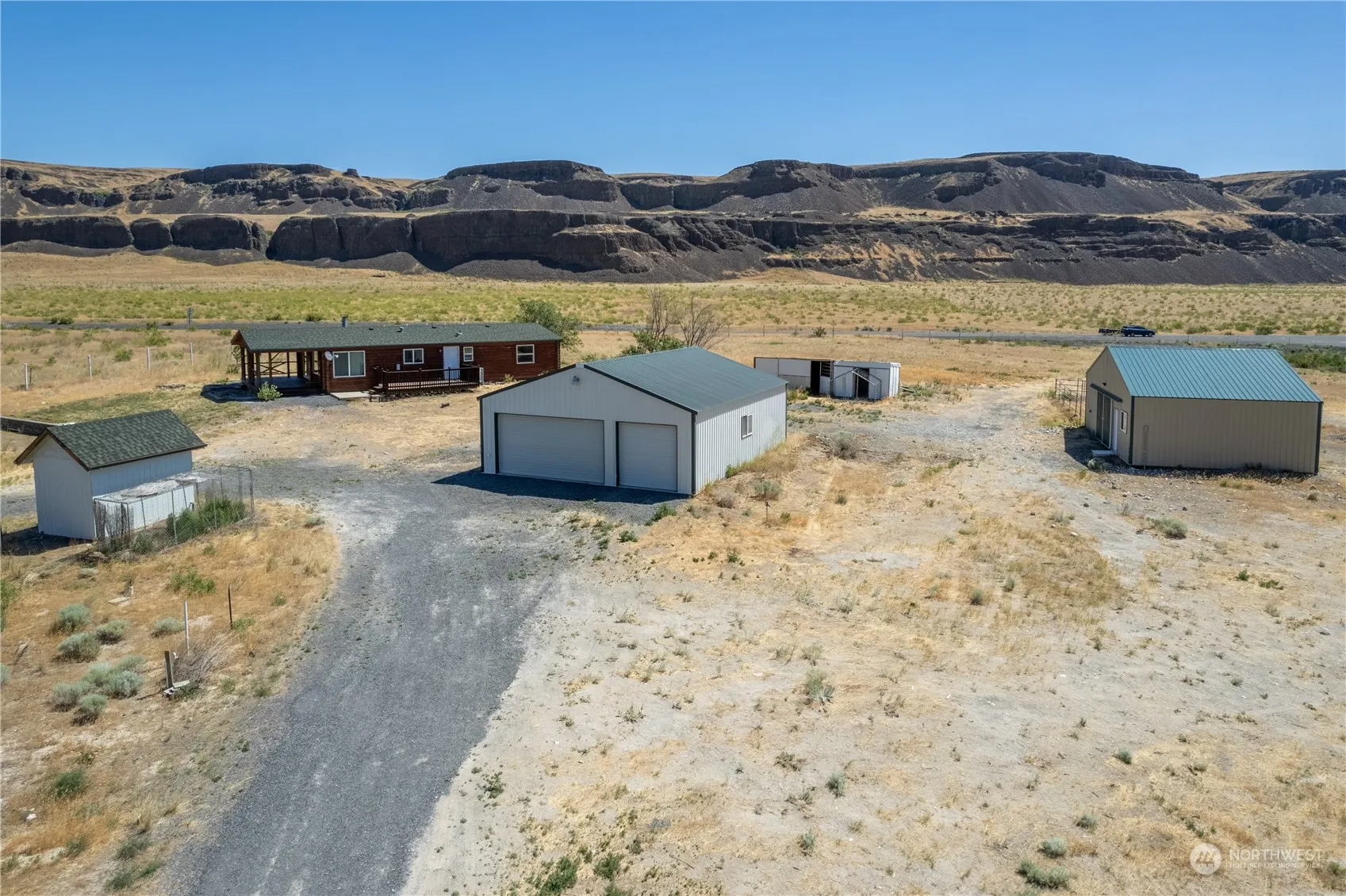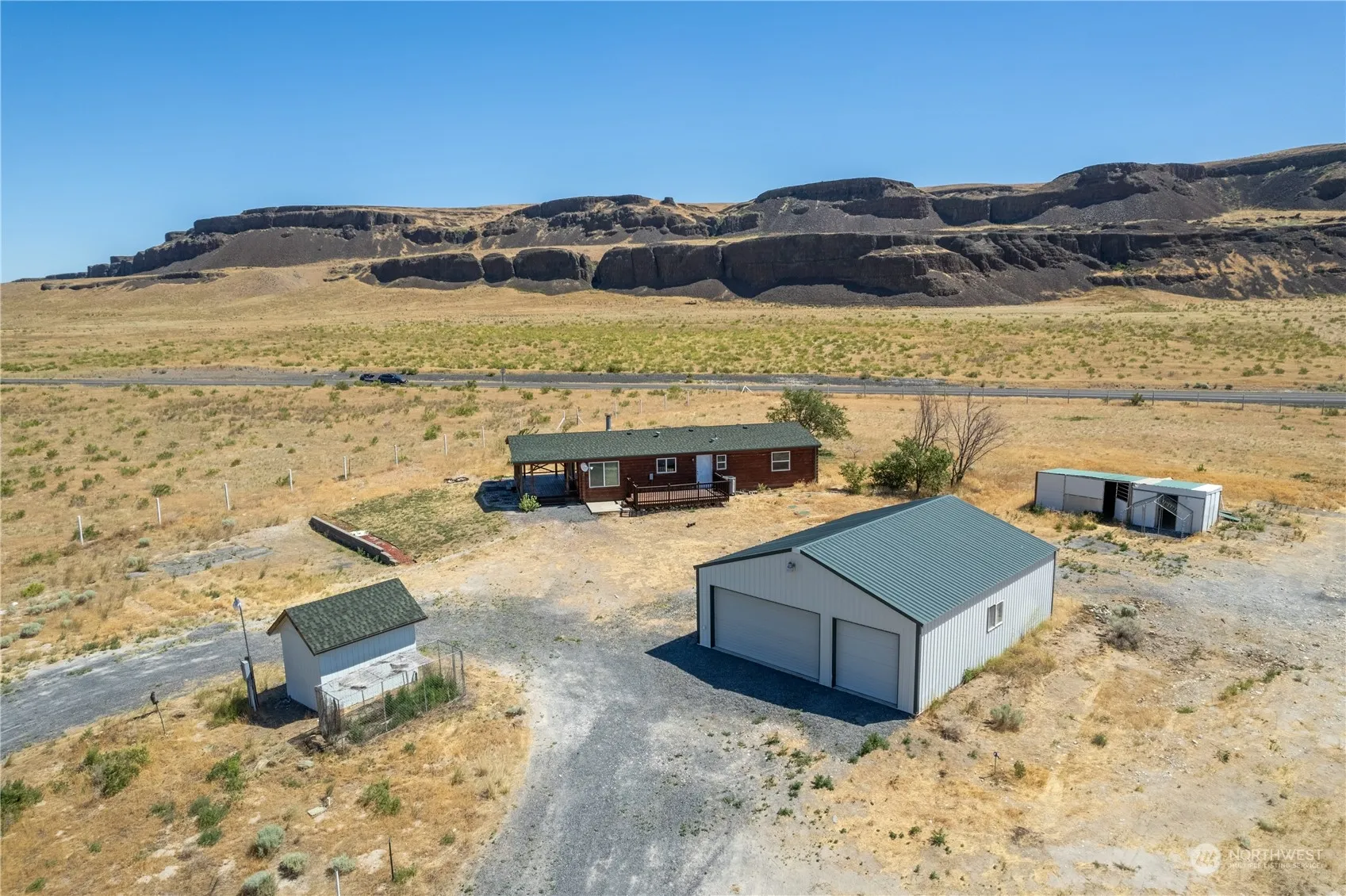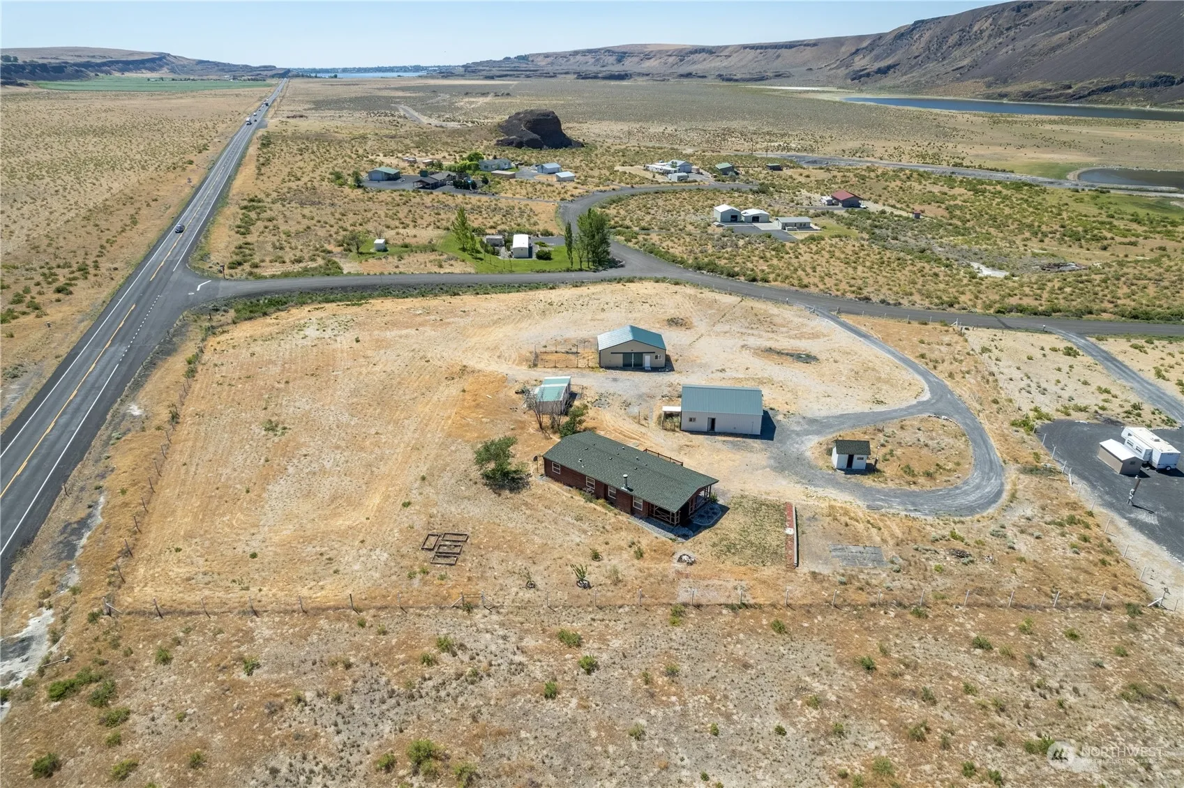 Lake Lenore Living! Enjoy the premier fishing on the nearby lake, countless trails to enjoy, plus so many more adventures ready to be yours! This massive 4 acre lot is fully fenced and includes a shop, new fancy horse barn with custom birthing stalls, and a 1,323 square foot cabin style home. The 3 bed/2 bath home has new laminate flooring, new trim, fresh paint throughout, a new roof and 2 freshly stained decks. Make this your quiet retreat with breathtaking views of Lake Lenore and the cliff faces. Plant pasture for your animals and have yourself a beautiful animal haven.