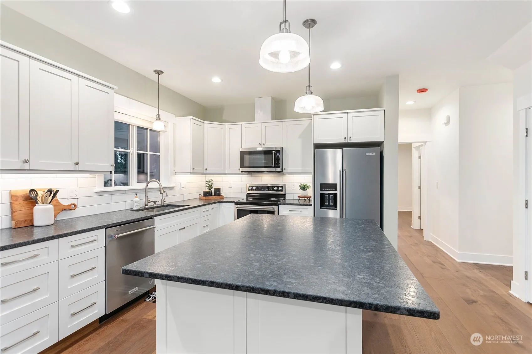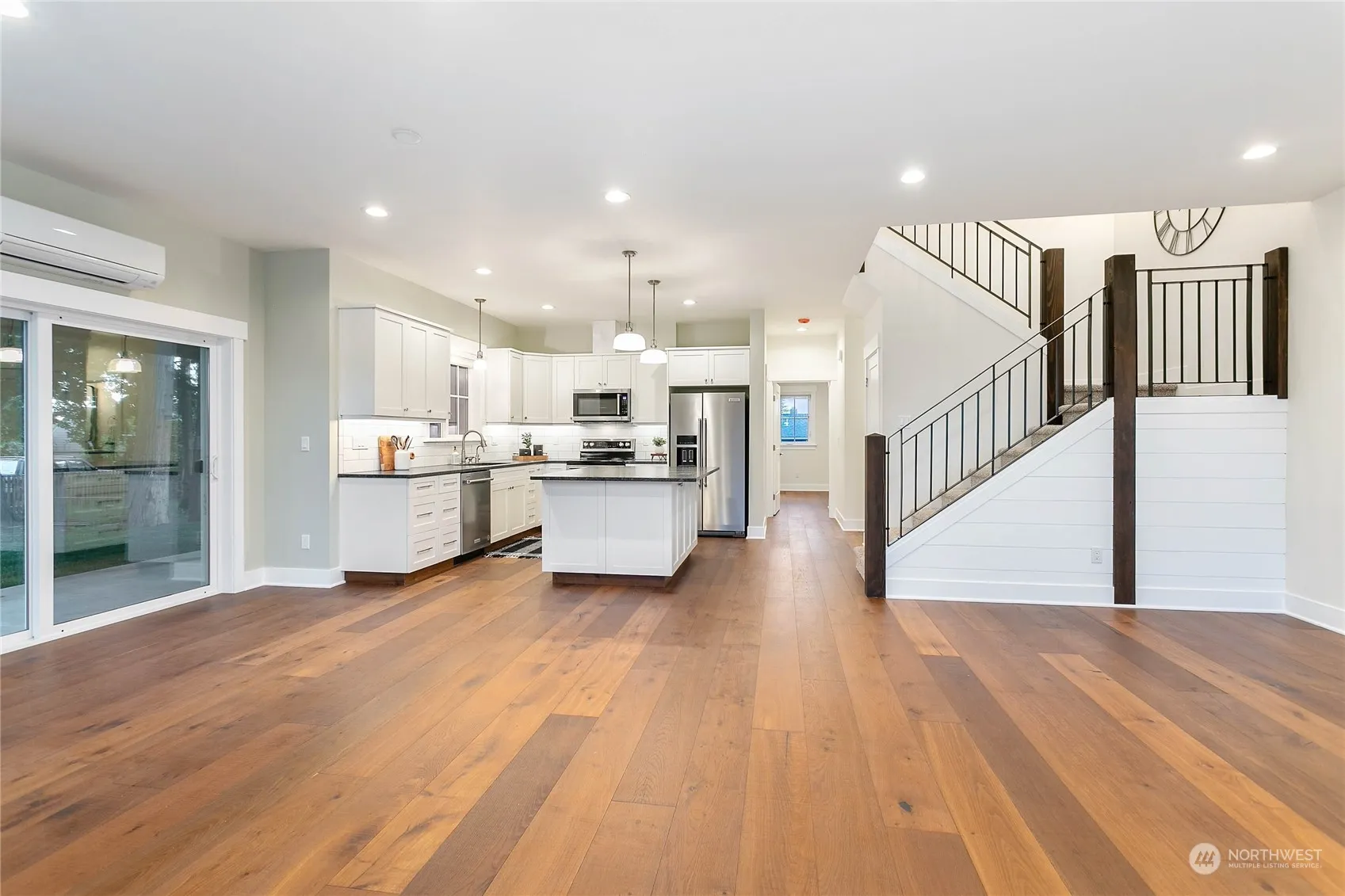 Beautiful 5 BR, home located on a quiet cul-de-sac with mature trees. Walking distance to parks and downtown shopping. 9’ ceilings on both floors. Main floor primary BR with ensuite BA and tiled double shower. Additional powder room on the main. Four BR’s, flex room with skylights, 1 ½ bathrooms and plenty of storage on the second floor. Large great room with white oak engineered hardwood floors, kitchen with brand new Kitchen Aid appliances, granite countertops, large island and ample pantry storage. Spacious laundry room with washer/dryer. Garage with 12’ door will accommodate RV or boat. Mini splits provide heat and AC on both floors. A large, covered patio will be great for entertaining. Easy ADU conversion in garage space.