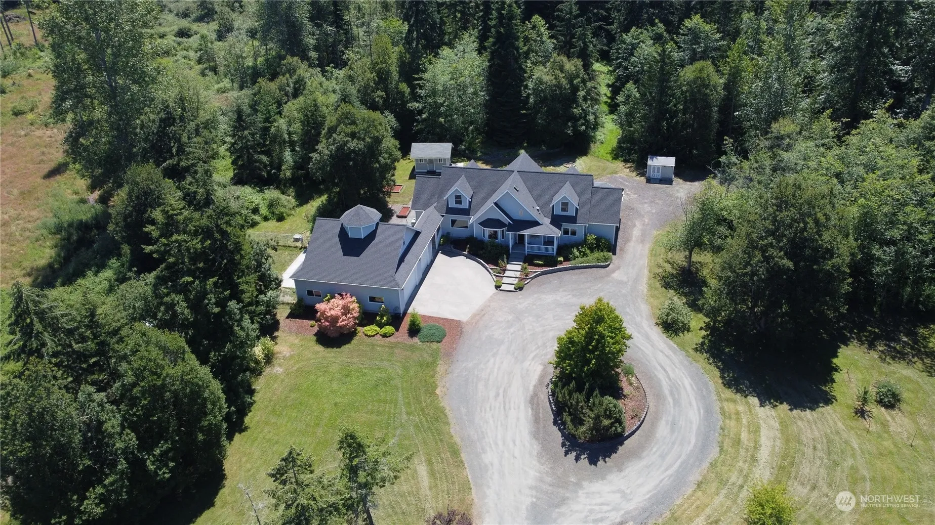 Private, 5 acres estate in a great location! Spacious, custom built home with an open floorplan. 3757 sq. ft featuring an amazing chef’s kitchen with cherry cabinets, double oven w/ warmer drawer, garbage compactor, granite counter tops and beautiful appliances. Separate formal dining room and a breakfast nook. True main floor living with the primary suite, 5 piece primary bath, kitchen, dining, laundry, solarium/sunroom and covered patio all on the main floor. 2 additional bedrooms and a full bath upstairs. Also on the main floor is the 4th bedroom with a separate, exterior entrance, use as a bedroom, media room, office or?? Wired for sound throughout. Huge 1726 sq. ft garage with shop space and 220 power.
