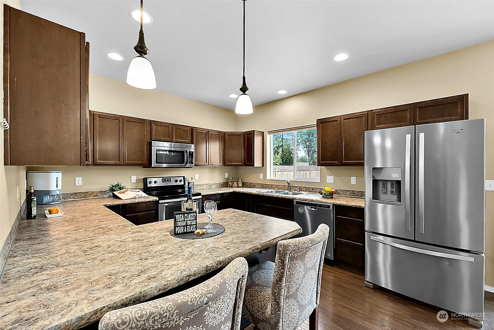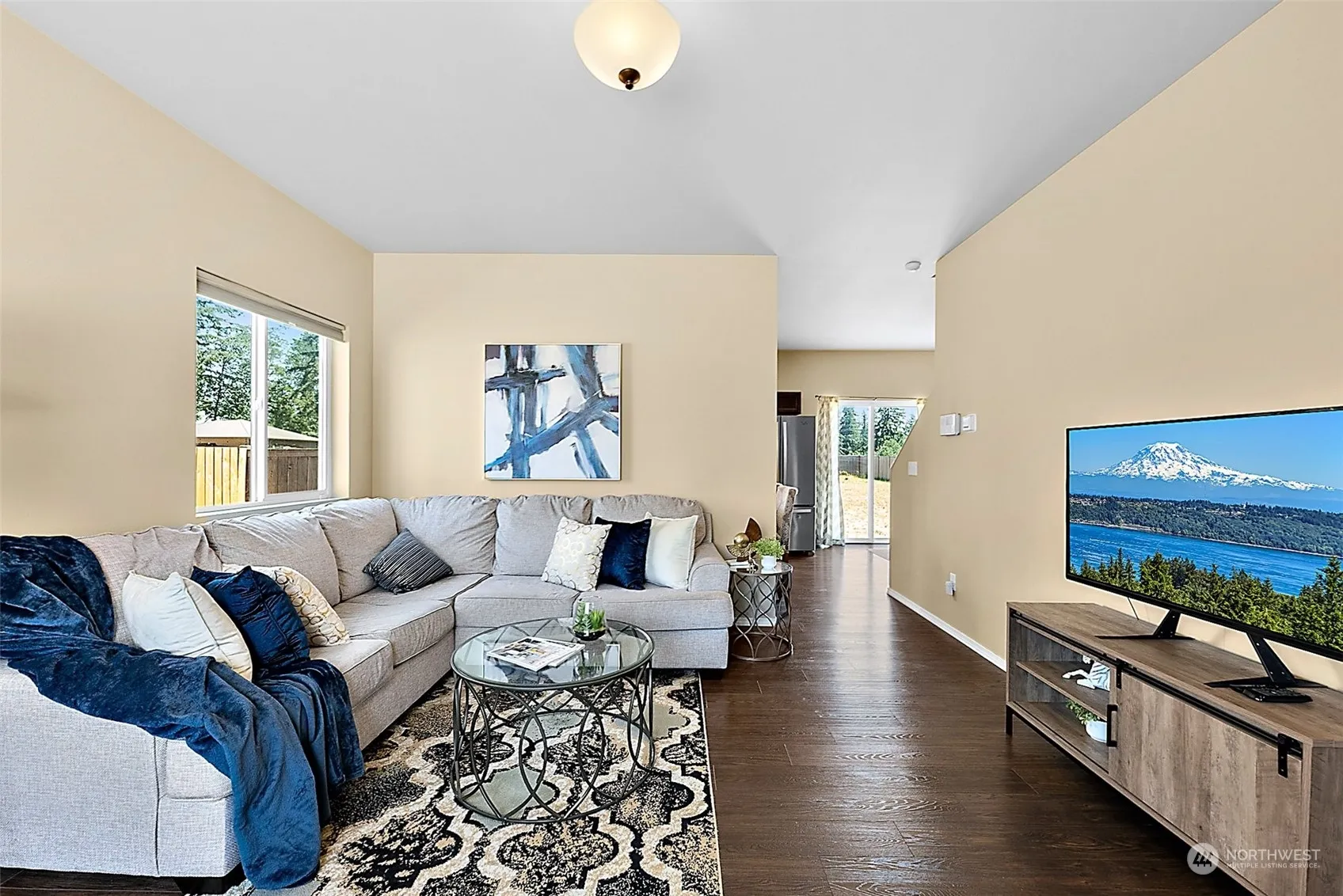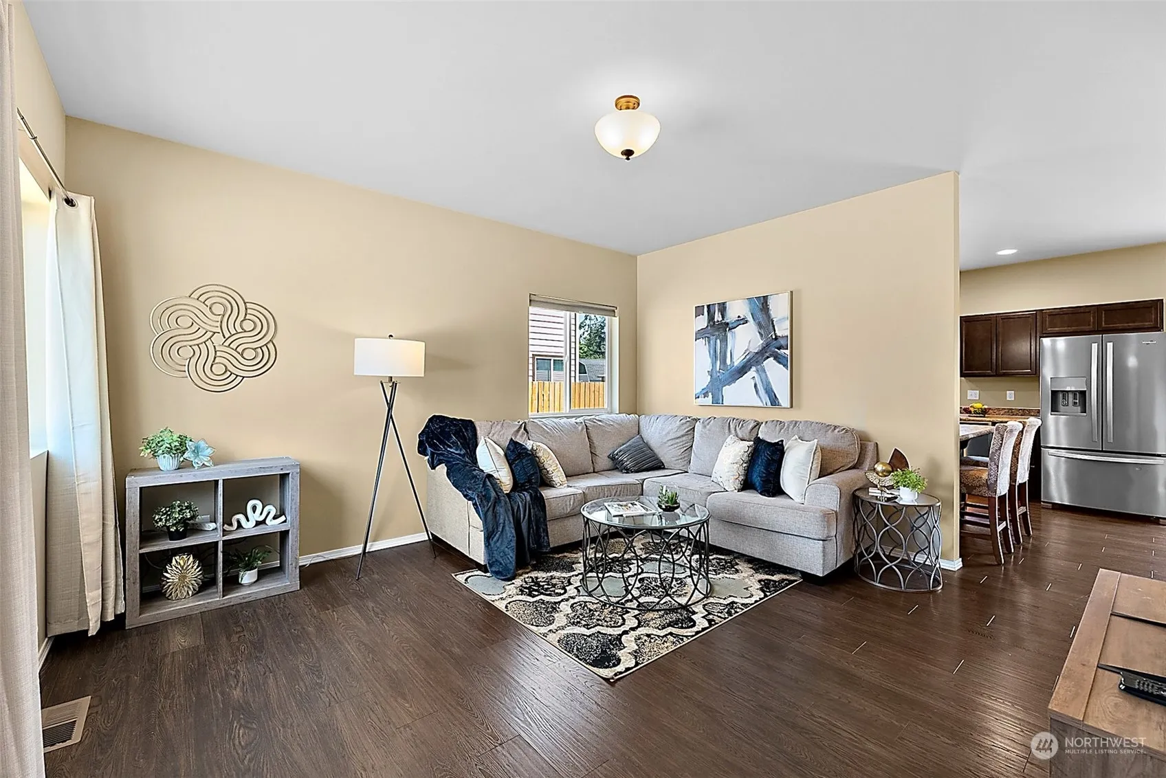 Charming 4 bedroom, 2.5 bath home in the desirable Rainier Heights community. Beautiful laminate wood floors flow seamlessly throughout the first floor to the large, modern kitchen with breakfast bar & SS Whirlpool appliances. Light and bright dining area w/access to outside patio and large fully fenced back yard with oversized patio, perfect for entertaining or simply relaxing in privacy. Upper level boasts primary suite with walk-in closet & 5 piece bath, plus three additional bedrooms and full bathroom. Newer heat pump with AC keeps you in perfect temps year round. Two car garage plus driveway parking & RV/Boat parking. This home also has a great commuting location, just a short drive to JBLM, close to schools, shopping & entertainment.