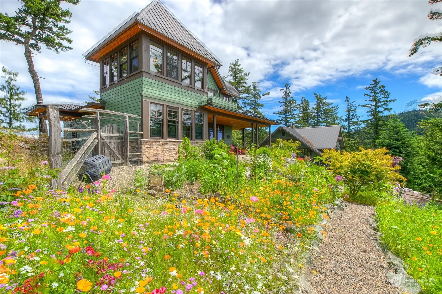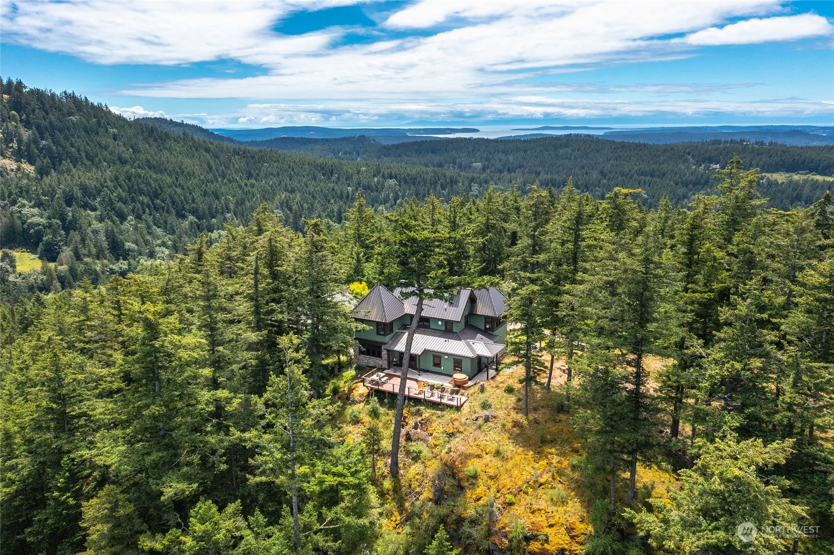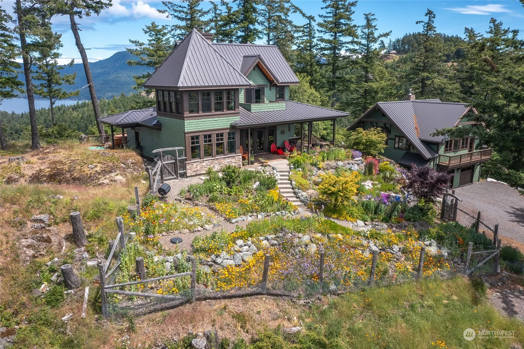 CAPTIVATING MODERN CRAFTSMAN w/killer views, sun & sunsets YEAR-ROUND, radiant floor heating, two primary suites, guesthouse, garage, new exterior paint and a central location 15 minutes to ferry or Eastsound. Two distinctly enchanting vistas: Northerly over East Sound & Georgia Strait to Vancouver & the Rockies; Southwest over West Sound, San Juan & the Olympics. Views from every room, porch, terrace, deck & hot tub! Enjoy a main floor bedroom w/private bath & French doors to the porch & fenced garden. Retreat to a spacious 2nd floor suite w/fireplace, jetted tub, balcony & adjacent “tower” room for office or creative pursuits. AWESOME studio guesthouse w/full kitchen, bath, laundry, loft & balcony over a supersized garage. Come see!