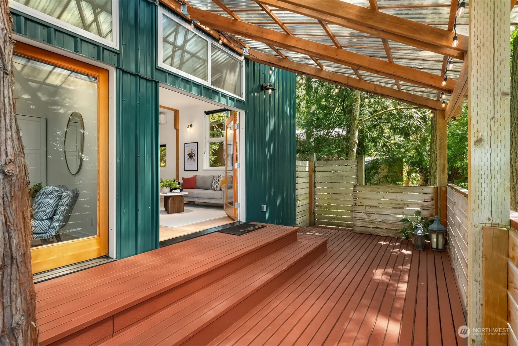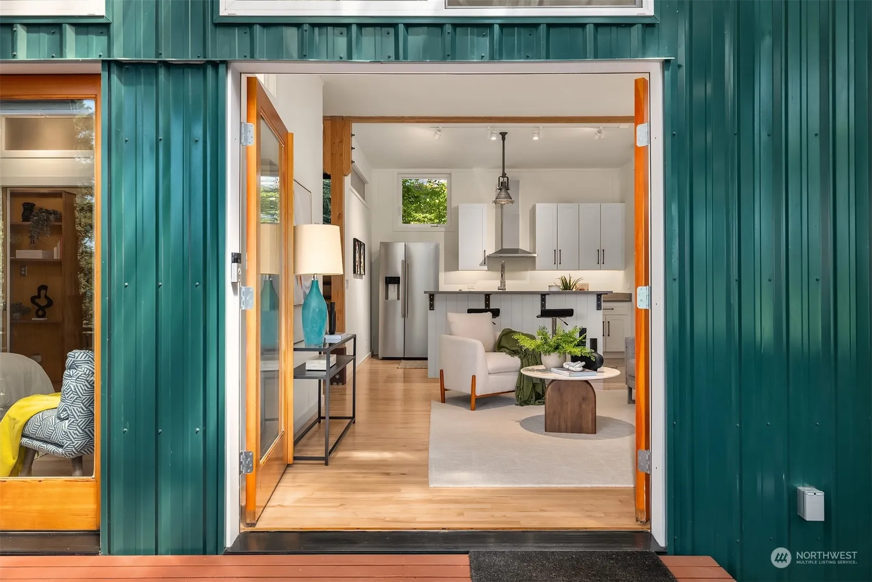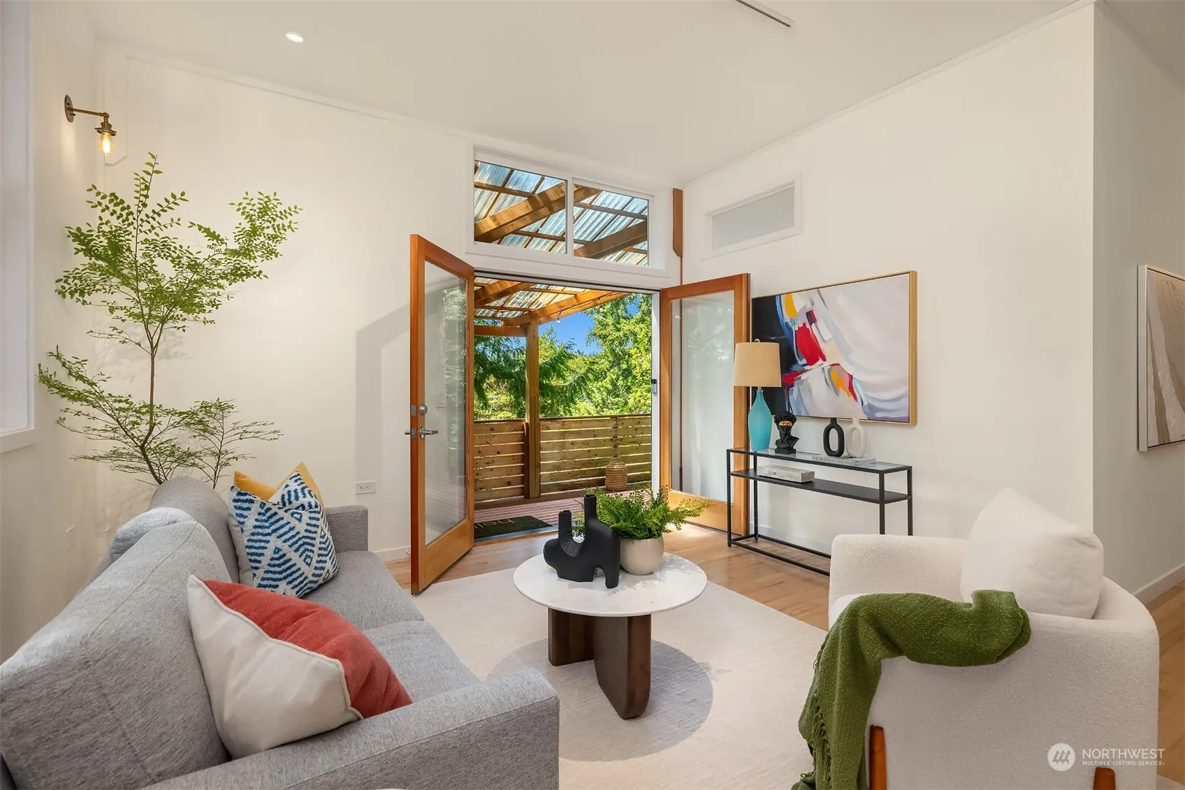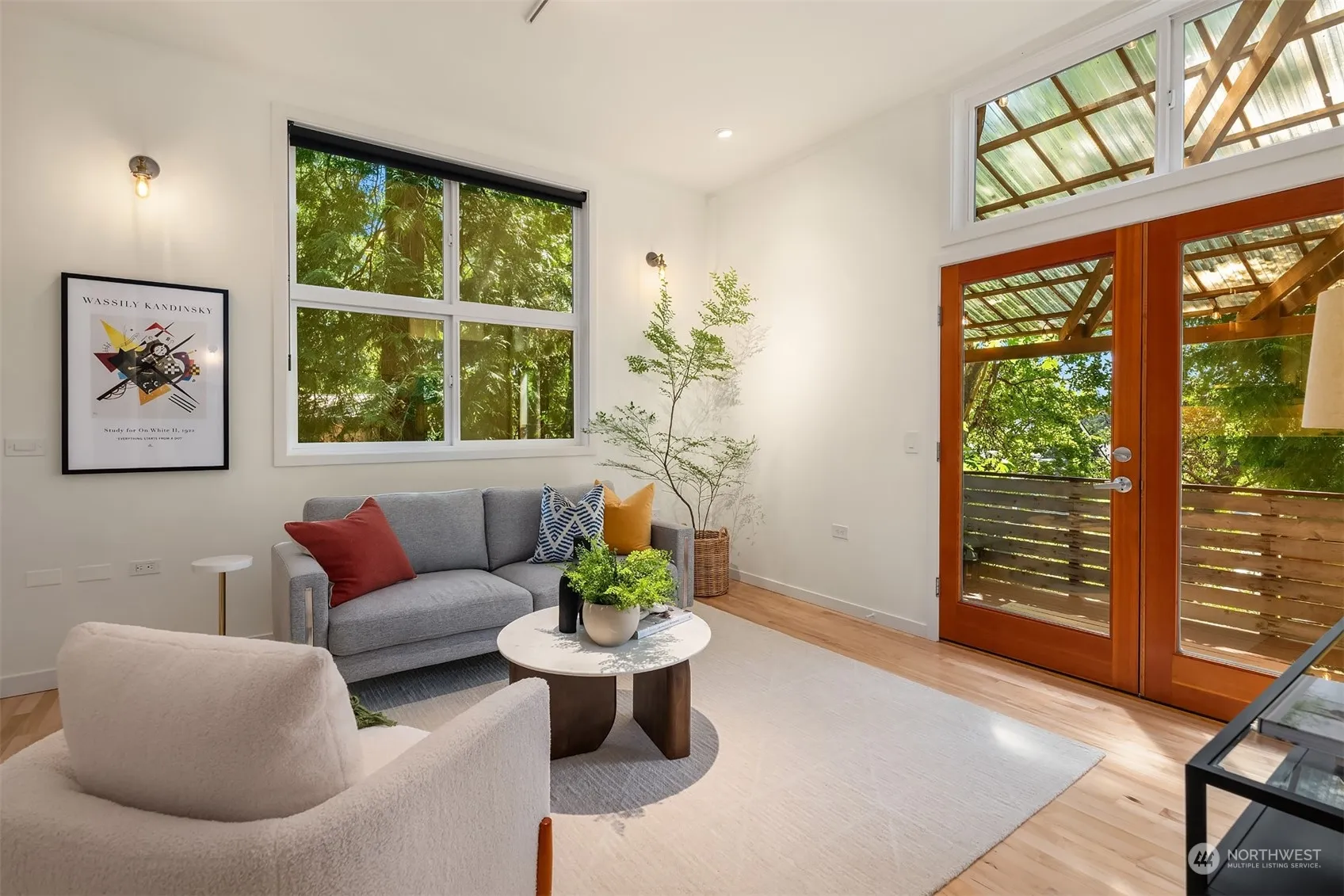 Stylish, Vibrant, Easy, In-Town Living! Two-bedroom NW Modern in a private, serene setting. Vaulted ceilings, soaring windows with transoms and hardwood floors grace the home. French doors open to an expansive covered deck, perfect for dining and entertaining. Stroll along pedestrian trails to the Seattle Ferry, local schools, and parks; restaurants, galleries, shopping, the Performing Arts Center and the BI Museum of Art. This well-maintained home offers a flexible, changeable floor plan, designed to adapt to your unique lifestyle. Updates include the addition of a 2nd bedroom and a study; new kitchen, heating/cooling with a ductless heat pump and EV charging. At the end of a quiet lane, just off of Weaver Dr, welcome to 674 Moji Lane NW!