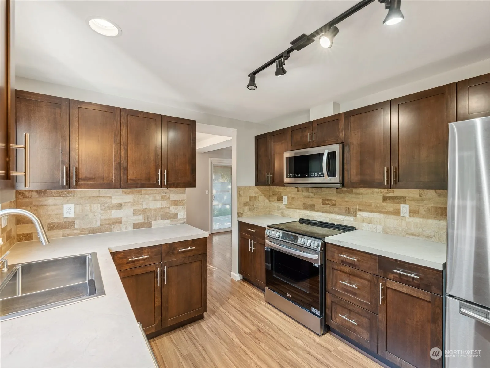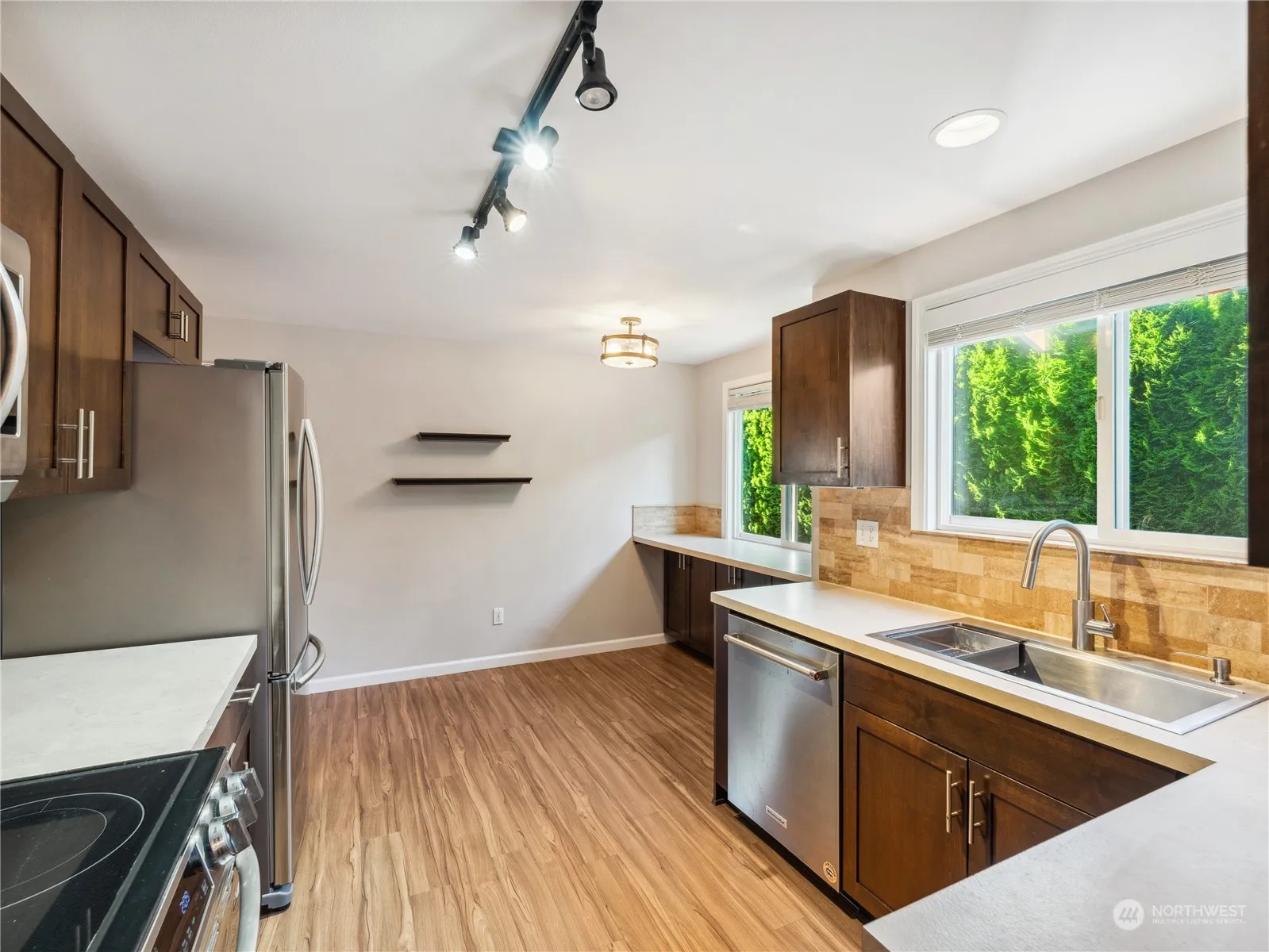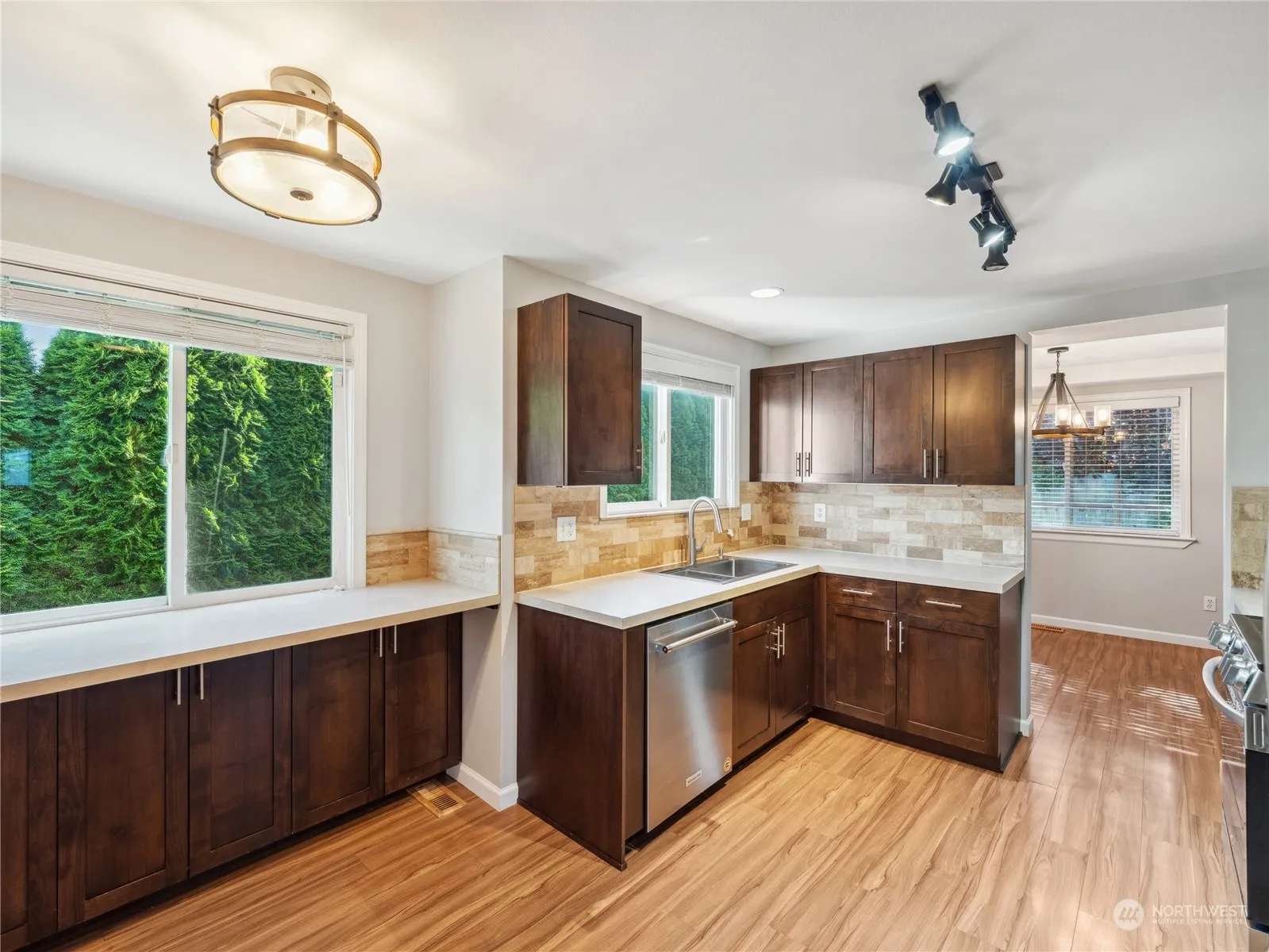 Impeccably maintained and ready for you to move right in, this home boasts beautiful landscaping & hardscaping, complete with privacy shrubs & a fully fenced yard for peace of mind. Inside, the vaulted ceiling living room welcomes you with a cozy gas fireplace, while the spacious kitchen features walnut-colored cabinetry, a built-in buffet, & ample eat-in space. Bedrooms are generously sized, & the updated bathrooms add a touch of modern comfort. Bonus features include a newer roof, updated appliances, & a convenient garden shed with extended covered ports, complemented by a charming paver patio. This home is a perfect blend of comfort, convenience, and style. Home is located outside of the 100-year flood zone. No flood insurance required.