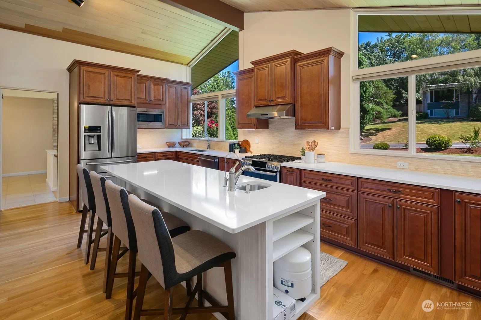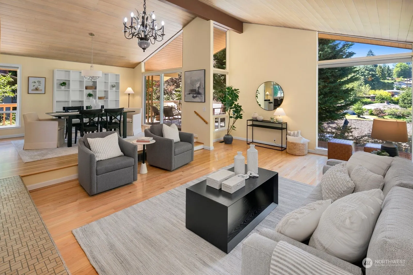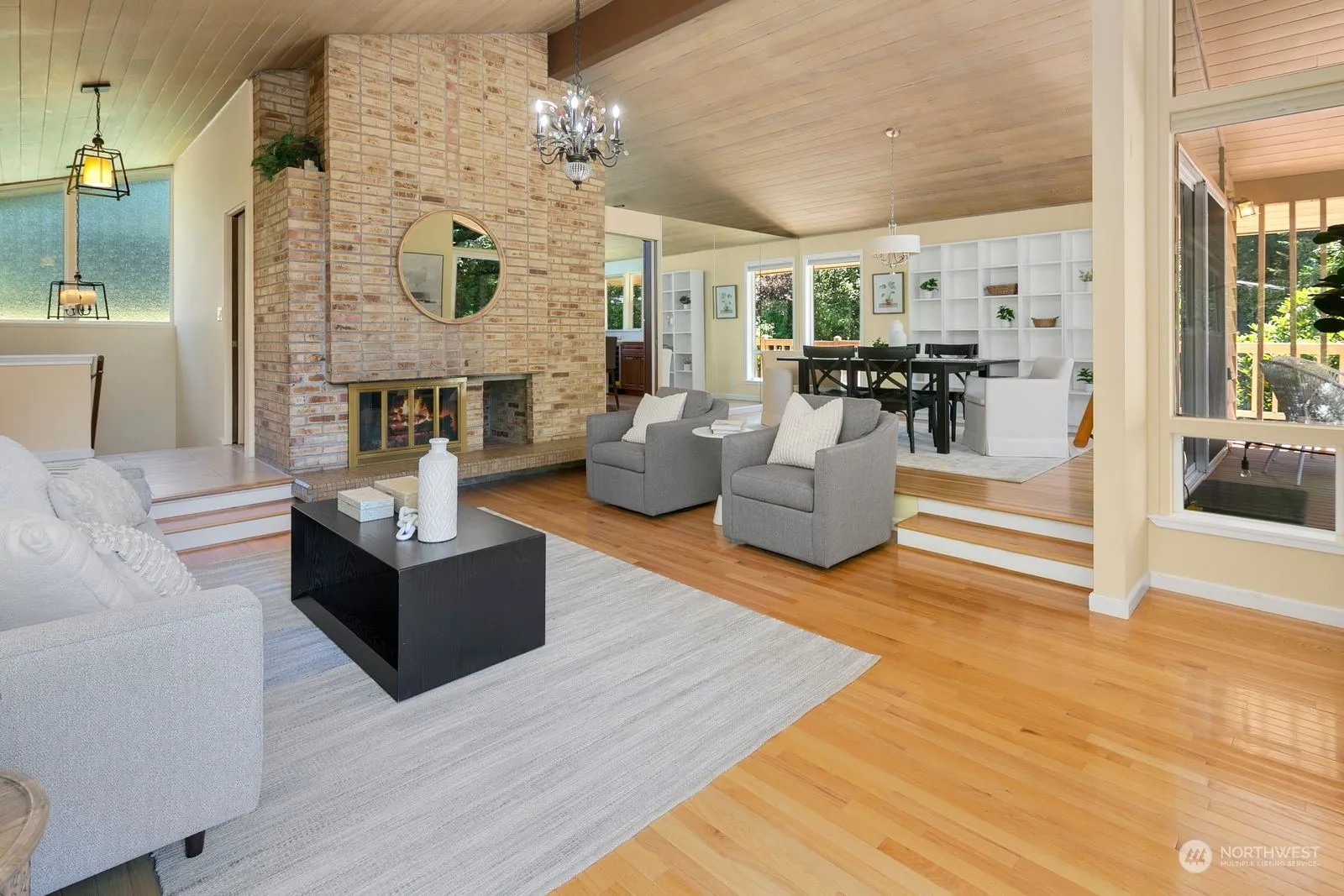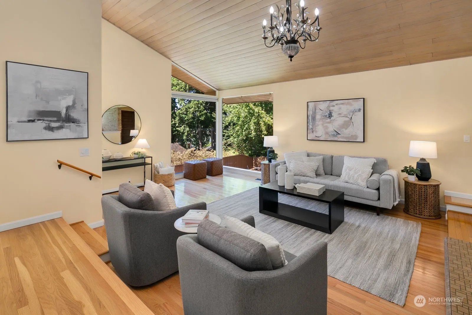 Charming 5 bed mid-century modern home on North End of Mercer Island. Enjoy the quiet & peaceful setting, while being just minutes to schools, swimming pools, & quick access to I-90. Vaulted cedar ceilings, complemented by huge picture windows offering territorial views and tons of natural light. Remodeled kitchen boasts a large island w/ prep sink, abundant designer cabinetry, a beverage cooler & water purifying system. Large slider in formal dining leads to sizable deck for outdoor living. Spacious primary suite, two add’l beds & two updated baths on main. Lower level features a bonus room, two more beds and ¾ bath. Energy efficient AC/Heat pump provides year-round comfort. Re-designed backyard w/ lawn & playground. Excellent MI schools!