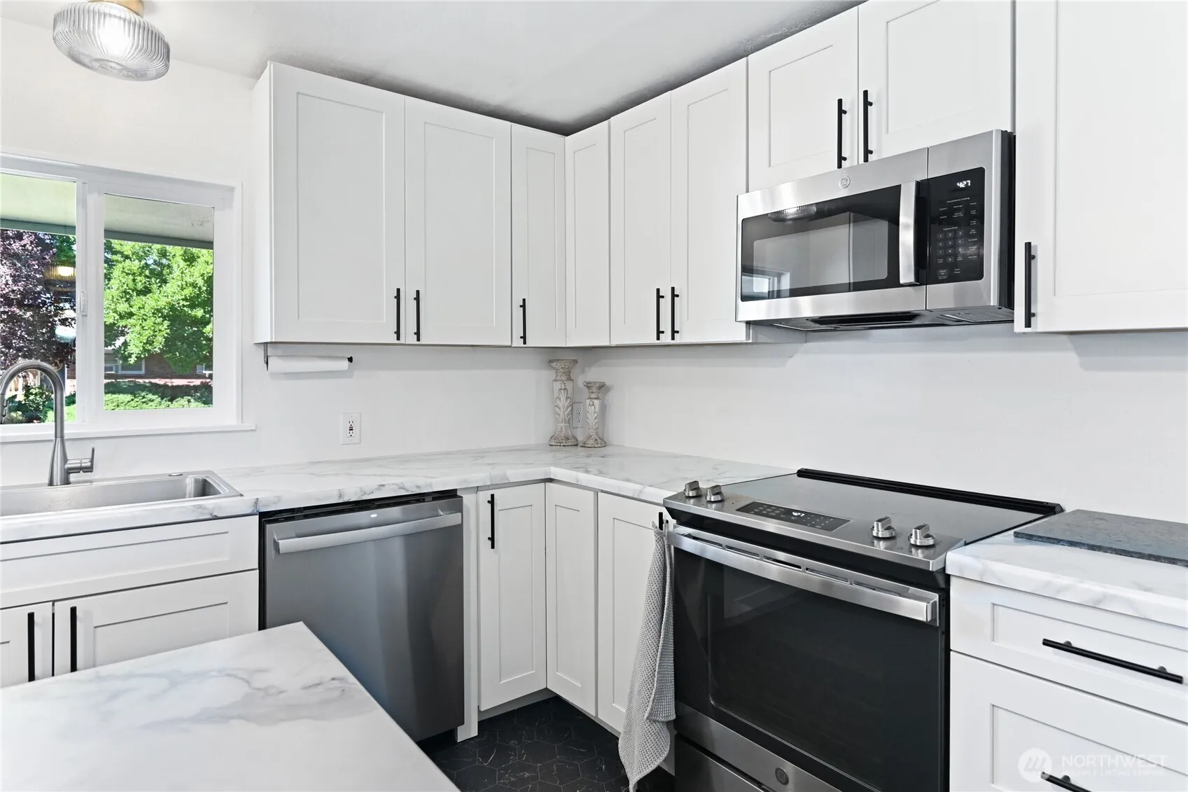 Beautiful, completely updated mid-century rambler with cove ceilings, hardwood floors, lovely fireplace in living rm, brand new kitchen, situated on an oversized .25+/- acre lot right in the heart of Lacey. Remodeled kitchen feels very open featuring a massive island w/plenty of seating, lovely new cabinets w/separate island color, SS appliances, vinyl floors, counters, & lighting. Two separate living spaces off each side of the kitchen gives the home an awesome functional layout. All new windows in front of house provide abundance of natural light. Fully updated bathroom. LVP flooring in living room leads to the utility rm w/built-ins & half bath. Large covered patio out back. Detached garage/shop w/carport. Plenty of parking & RV space.