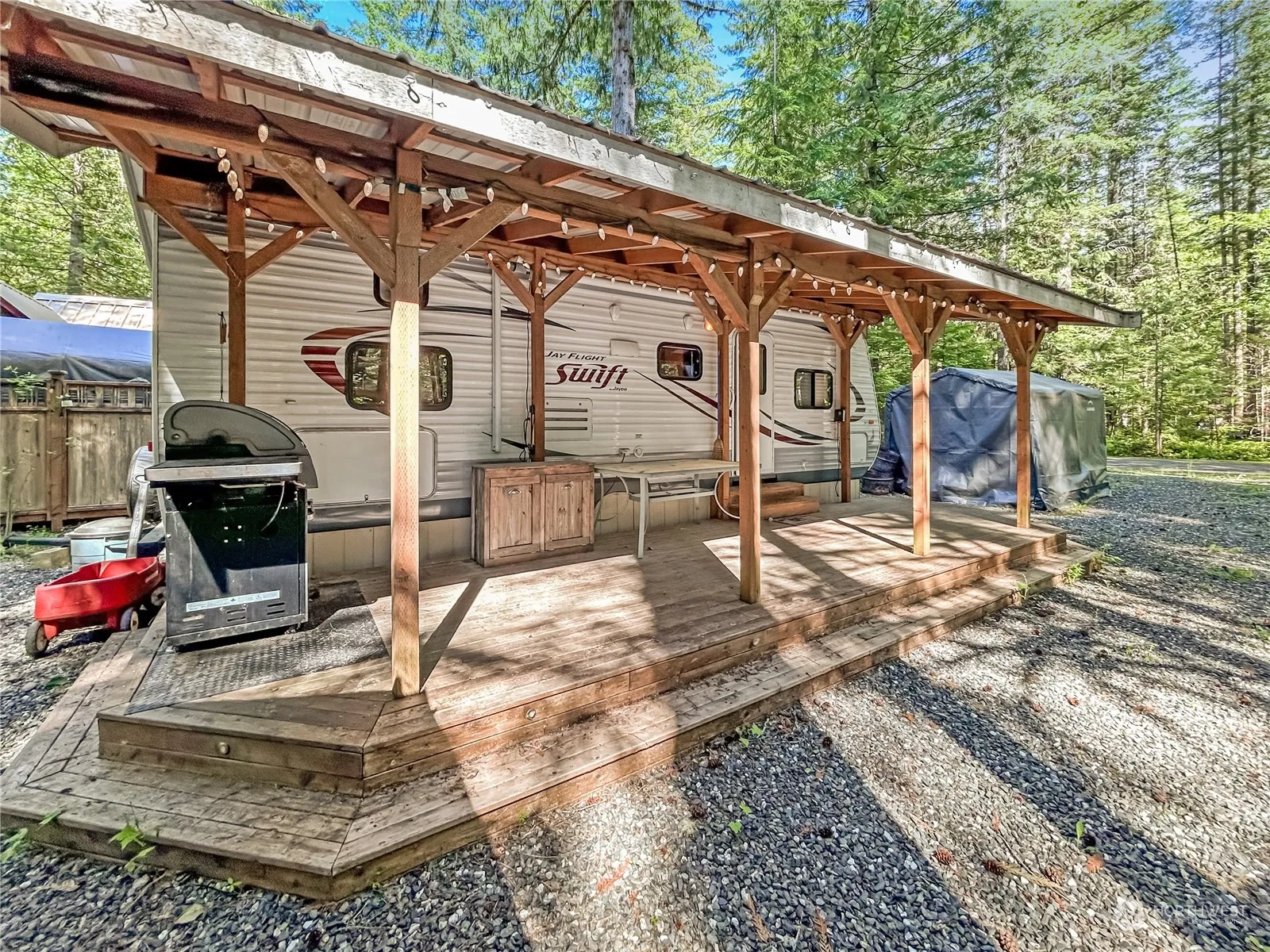 Beautiful 2017 Jayco Jayflight trailer with a metal auxiliary roof and covered deck. The trailer comfortably sleeps 8-10 guests. The lot is well-appointed and includes a golf cart shelter and shed with power. Room to add a gazebo if desired! Trailer features include LED lighting, hardwood maple cabinets, A/C, full bathroom and double bunk beds. Large fire pit area for enjoying late nights of food, friends and s’mores. Community amenities include Nooksack River access, parks, trails, pools, playgrounds, disc golf & year-round events. Gated access w/ 24/7 security. Comes fully furnished & is located just 30 minutes from Bellingham & 15 minutes from the base of Mt. Baker & Silver Lake. Limited to 120 days/year occupancy. No rentals.