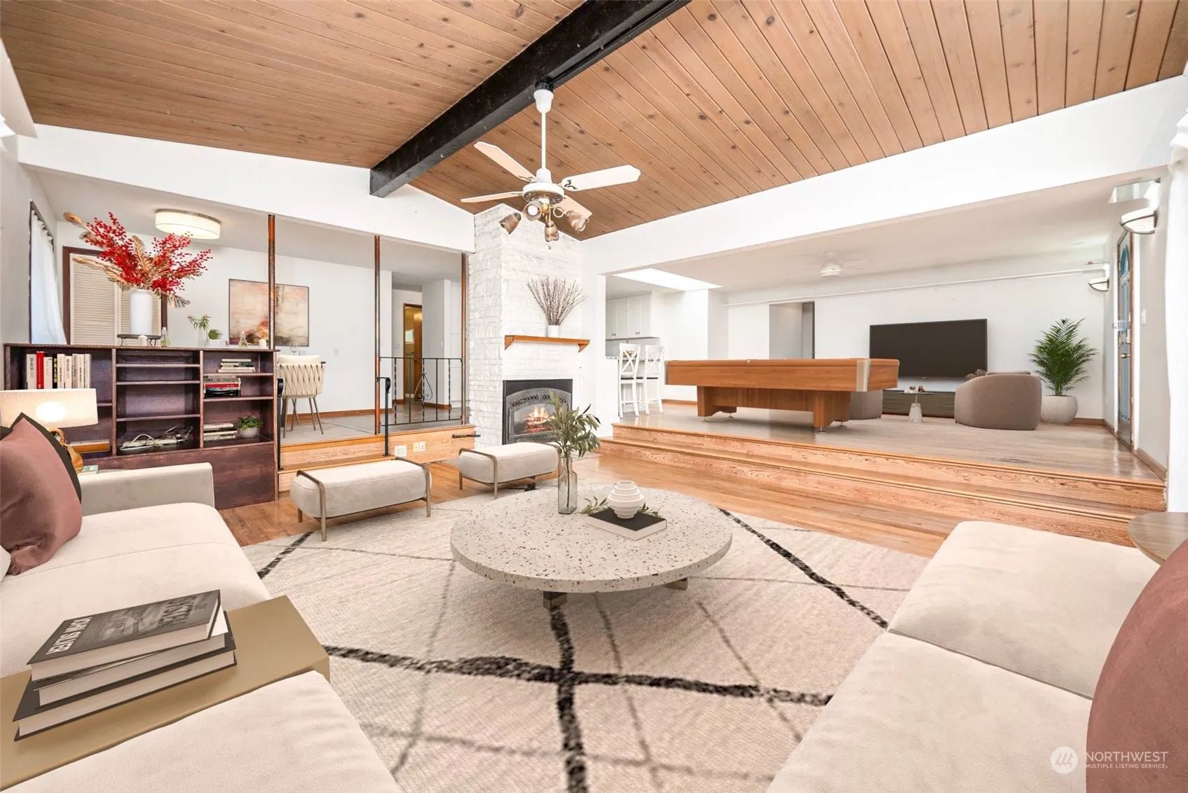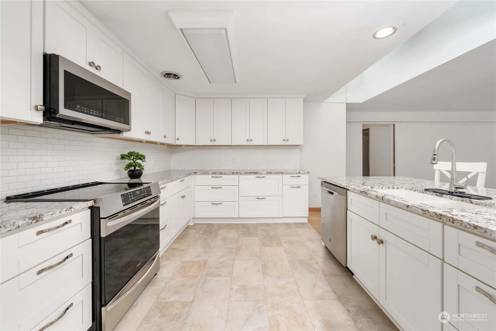 Beautiful spacious rambler with 4 bedrooms, 2.75 baths, and an office at over 2,500sf on one level. Open floor plan w/cathedral ceilings, abundance of natural light, and ample storage. Updated kitchen with granite countertop, soft-closed drawers, top of the line SS appliances, skylight, laminate and hardwood flooring throughout. Large sunken living room with gas fire place. Spacious laundry room with cabinets and folding counter. Additional amenities includes large covered patio, generous 2 car garage, long driveway, and additional off street parking. Easy access to highway, light rail & SeaTac Airport. This home has great potential for AFH conversion.