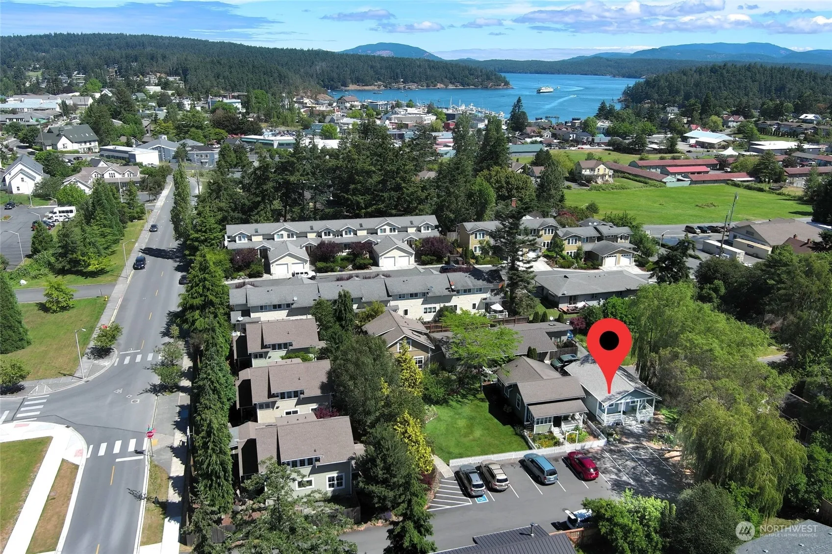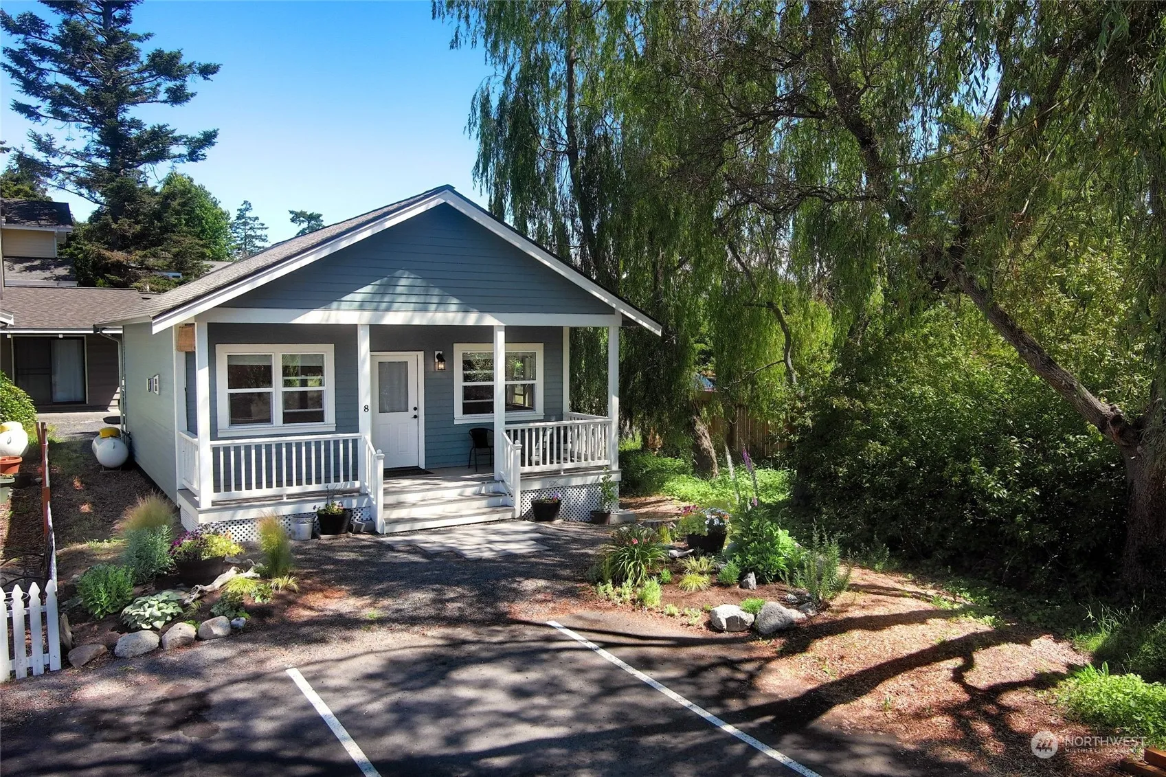 Architect inspired” 55+ In-town Pocket Neighborhood. Stand-alone custom cottages designed for 1 & 2-person households in a private setting. Unit #8 is one level, 598 sq feet, 1-bedroom, w_3/4 bath w/walk-in shower. Open Kitchen (Canyon Creek cabinets). Open concept w/dining area next to great room. Free-standing propane stove in living room. Cottage #8 has outside covered porch entry. Each cottage owns its land on its own separate tax parcel. A perfect size Craftsman Cottage home or use as your island get-away. Live in the heart of Friday Harbor in Privacy & surrounded by mature landscaping. Whichever cottage sells first, (# 3 or # 8) the remaining cottage will not be for sale at this time.