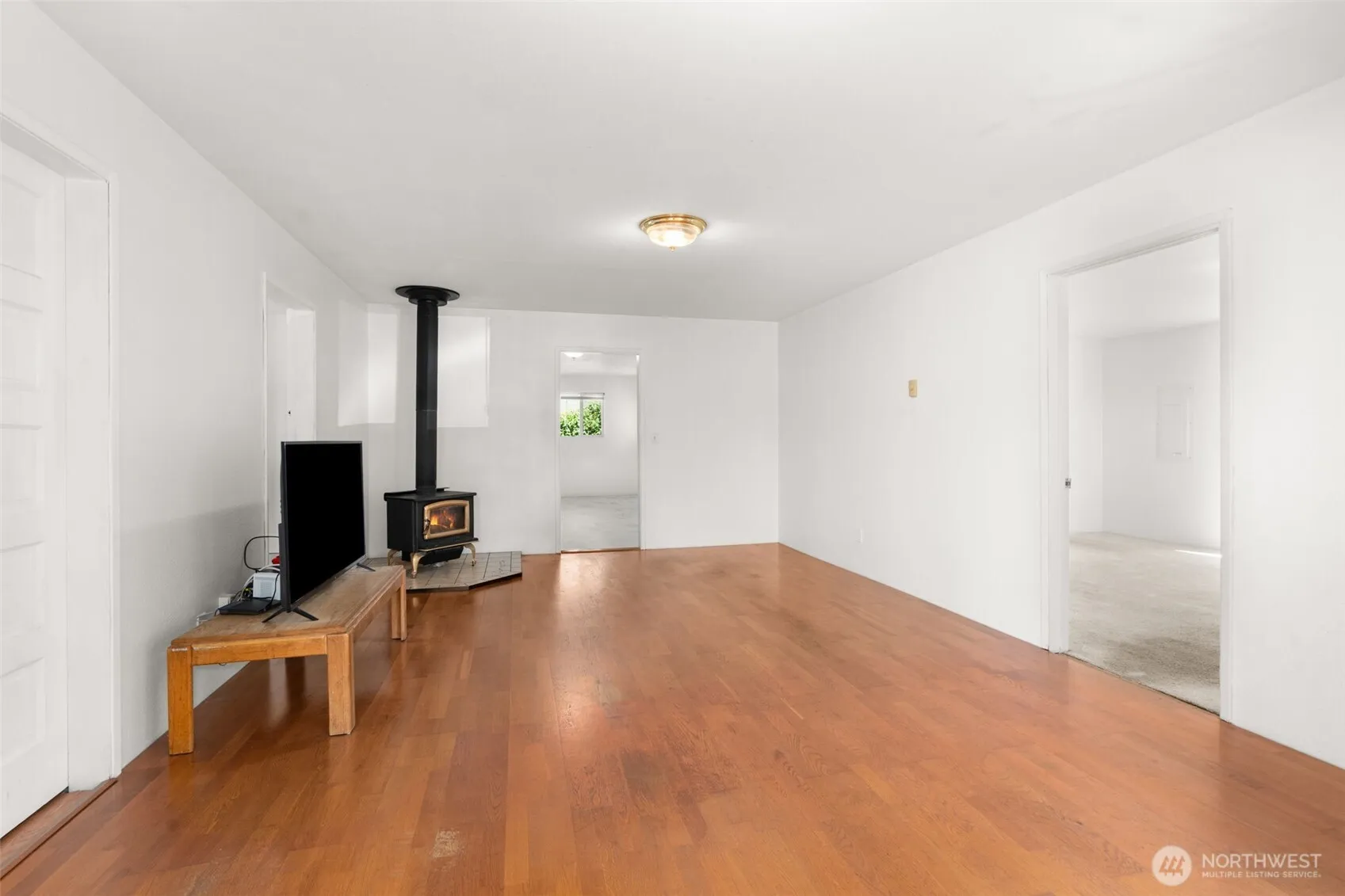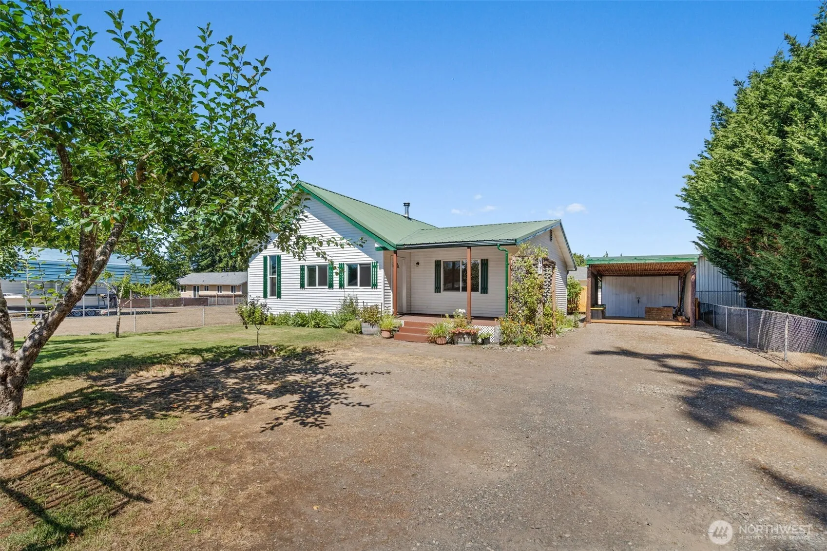 Charming 4-bedroom, 1.75-bath home tucked back from the road in a quiet, well-established neighborhood! Enjoy a spacious open-concept living area with a cozy fireplace and a desirable split-bedroom floor plan with the private primary suite on one side, complete with an adjoining ¾ bath and the additional 3 bedrooms on the opposite side of the living area. The fully fenced yard features a privacy fence in back, garden boxes, a woodshed, and a firepit—perfect for outdoor entertaining. Fruit lovers will appreciate the pear, plum, and apple trees, raspberries and grapes! Covered front deck, large carport with additional storage, and plenty of space for all your needs. A peaceful setting close to schools, parks and I-5.