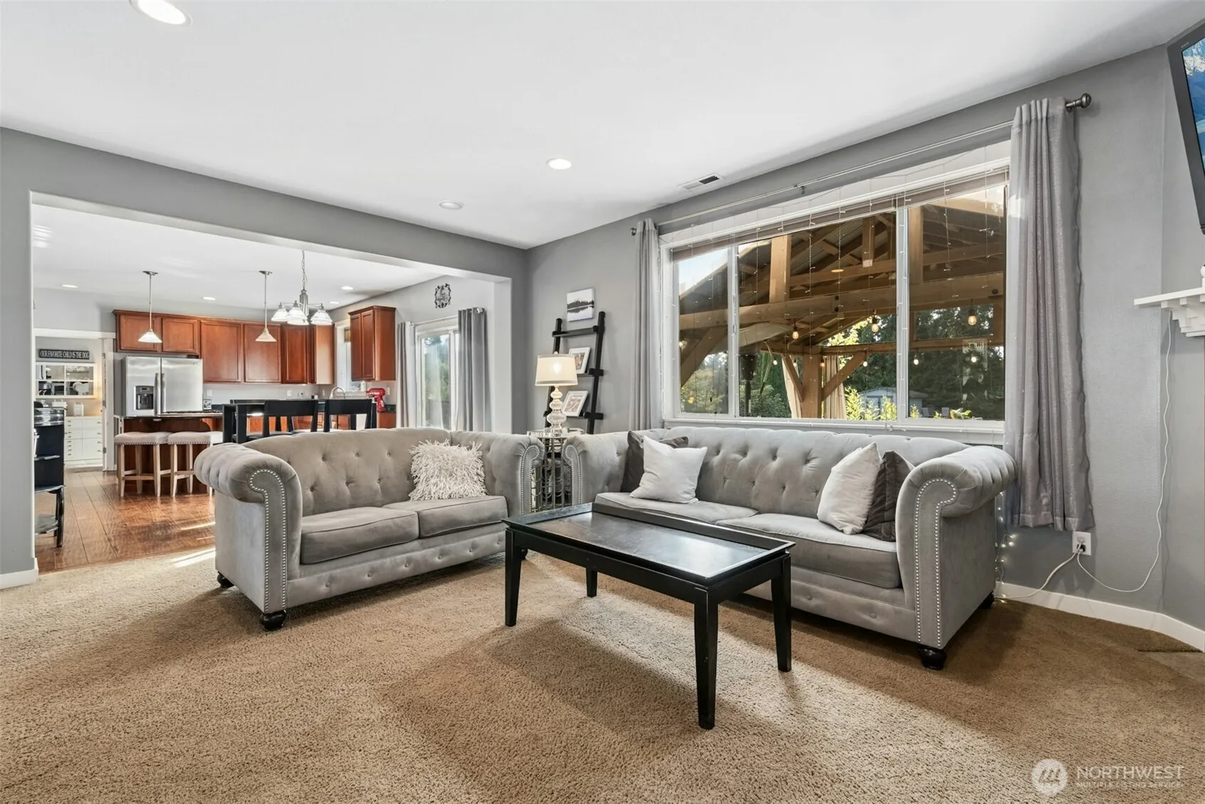 Regal on a spacious 1/2 acre, blending refined comfort with everyday convenience. Inside, thoughtfully designed living spaces, rich wood floors, plush carpet & soaring ceilings. A generous entry to greet guests, a home office then a spacious dining room as you enter. Relax in the fabulous family rm by the cozy gas fireplace or play chef in the fully equipped, gourmet kitchen. The upper level leads you to the primary suite with vaulted ceilings, a romantic fireplace plus a 5 piece, spa inspired bath. 3 more bedrooms, a full bath and a big bonus room with a projector to finish off the upstairs. Outside, expansive grounds invite gatherings, play, or peaceful evenings surrounded by the natural beauty of the PNW! 4 BEDROOM, OFFICE & BONUS ROOM!