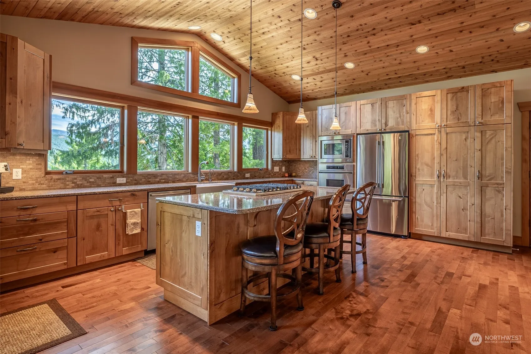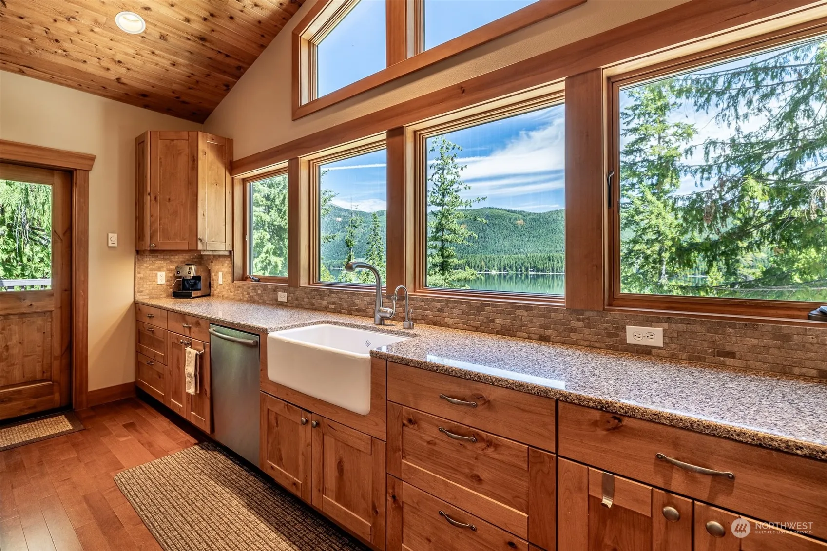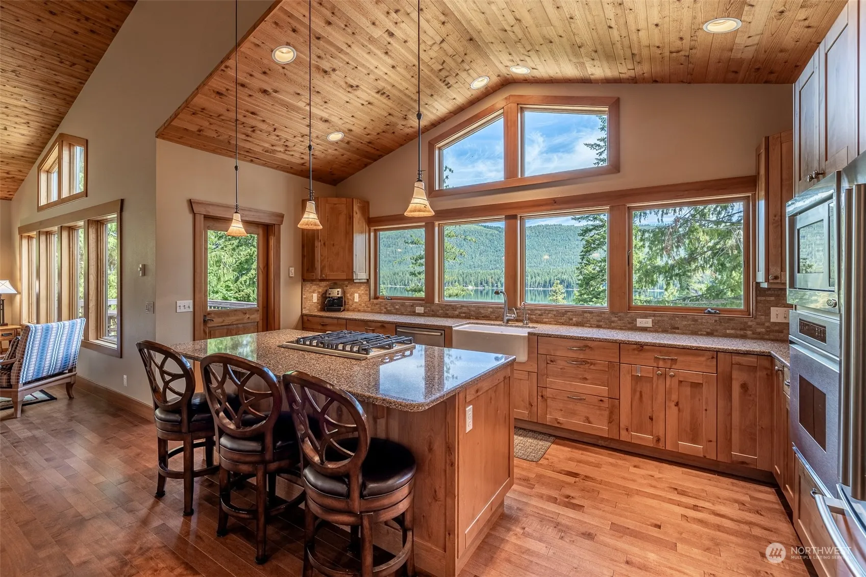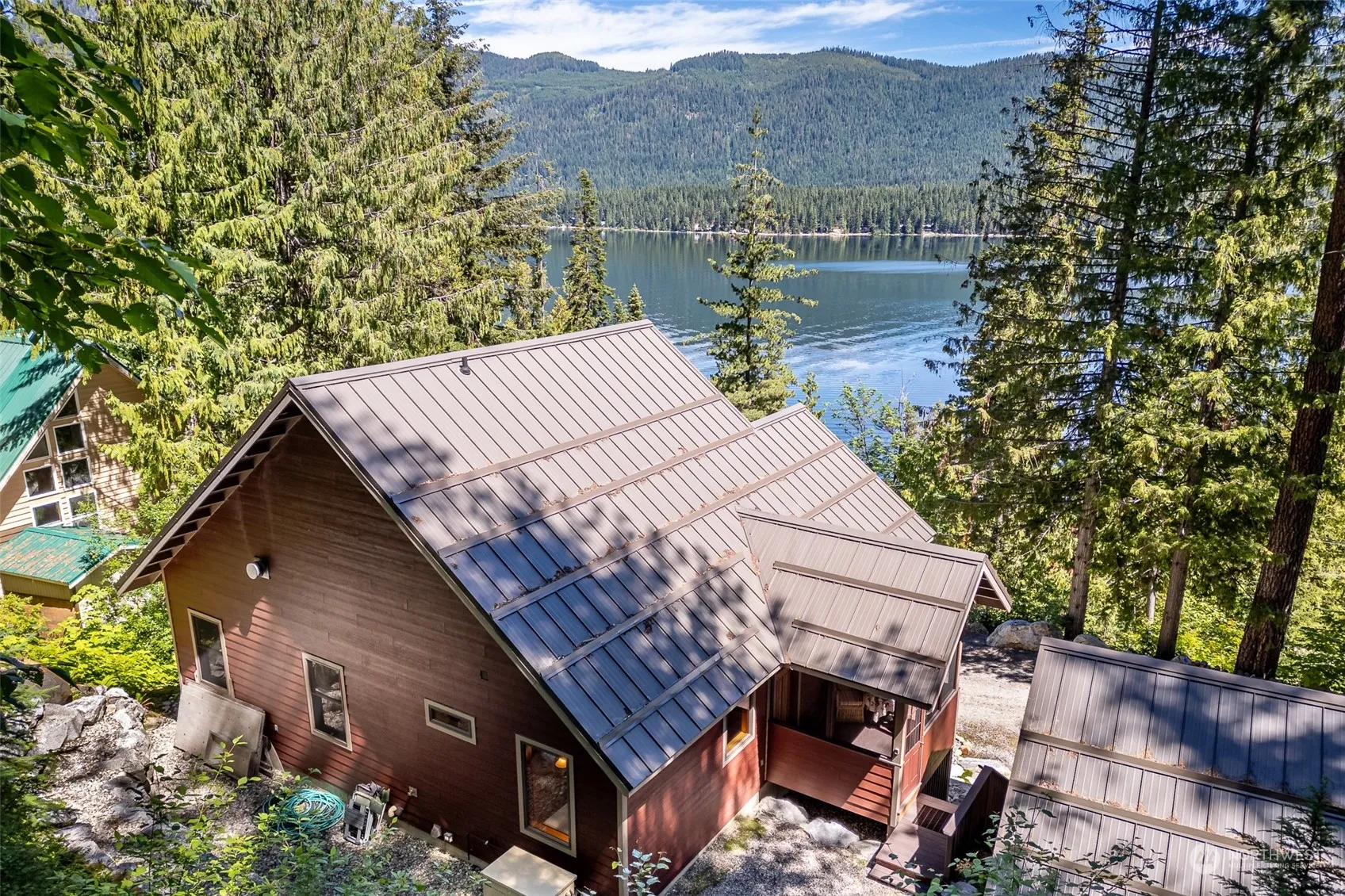 Experience spectacular views from this thoughtfully-designed, fully-furnished home overlooking Lake Wenatchee! The spacious kitchen and lovely great room are perfect for entertaining. Vaulted wood ceilings, log accents, double-sided propane fireplace, and maple hardwood floors enhance the main floor’s charm. The attractive kitchen features a large center island, quartz countertops, Viking propane cooktop, classic farm sink, and alder cabinetry. The lower level features stained concrete floors with radiant heating, three bedrooms, and a cozy nook. Two-car garage for parking and storage, and the property backs up to the National Forest, offering superior privacy. Located just minutes from the State Park, hiking, and x/c trails.