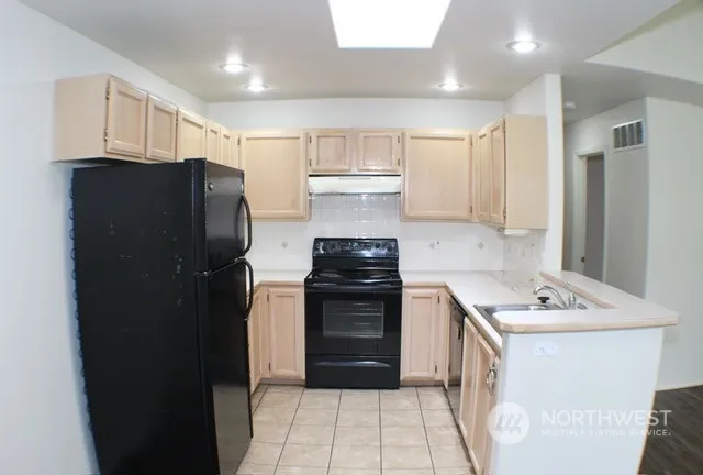 Well maintained condo duplex with one common double wall but no common areas and no HOA dues. Private fenced backyard with storage shed and timed underground sprinklers plus large deck. Single car garage with garage opener. Living room with vaulted ceiling and skylight in kitchen. Seller is the listing agent