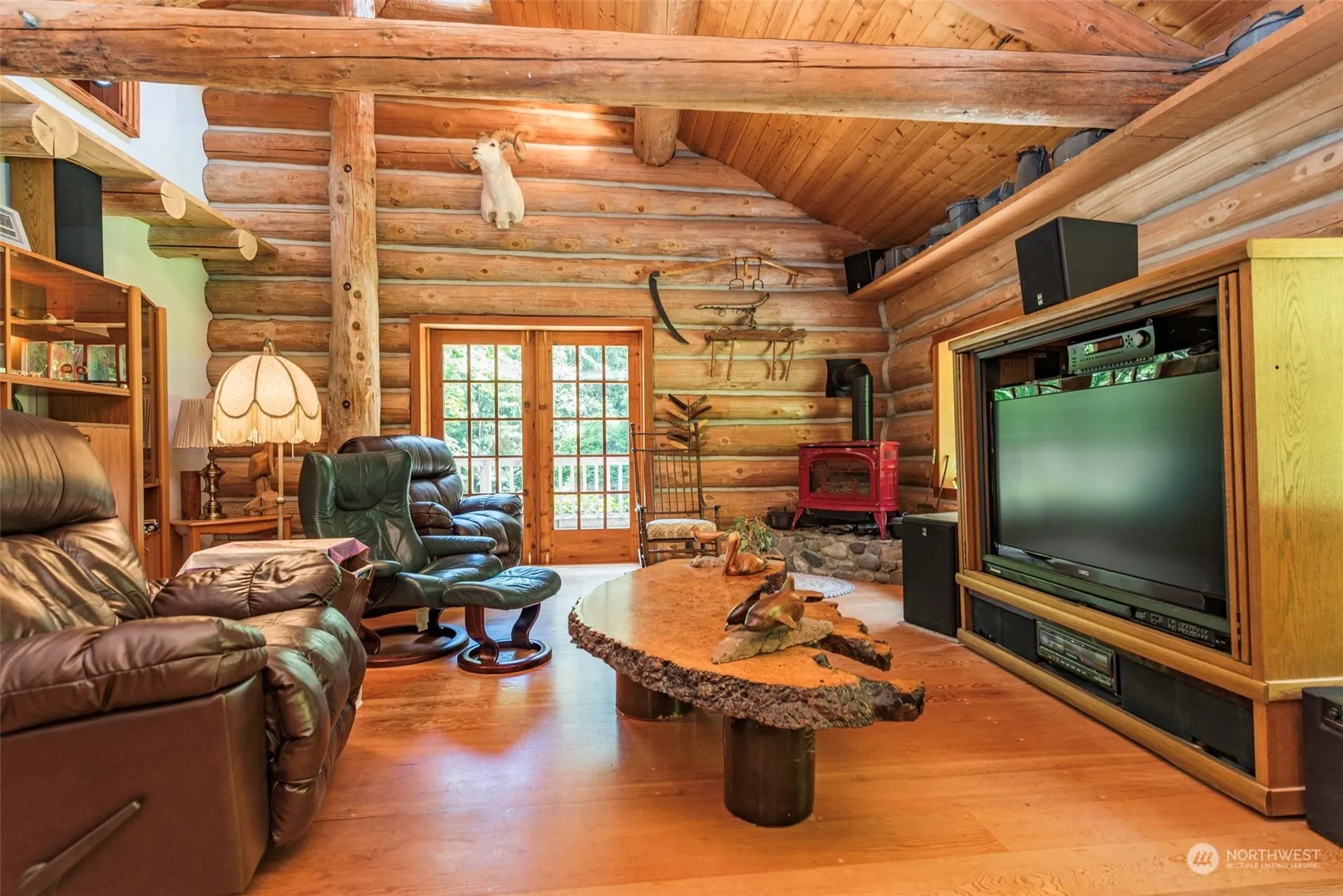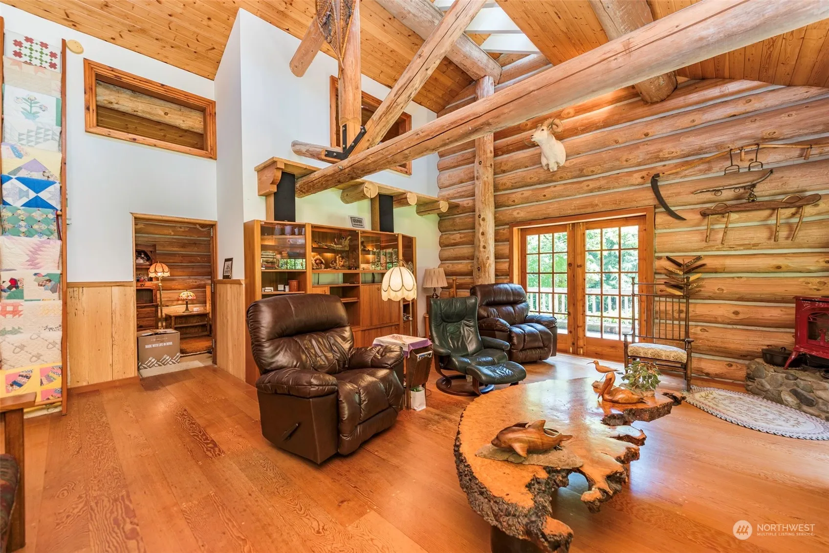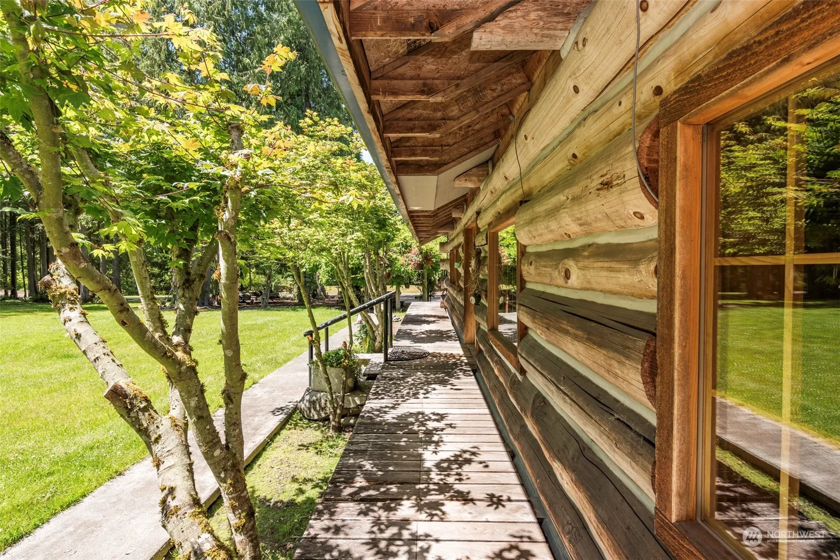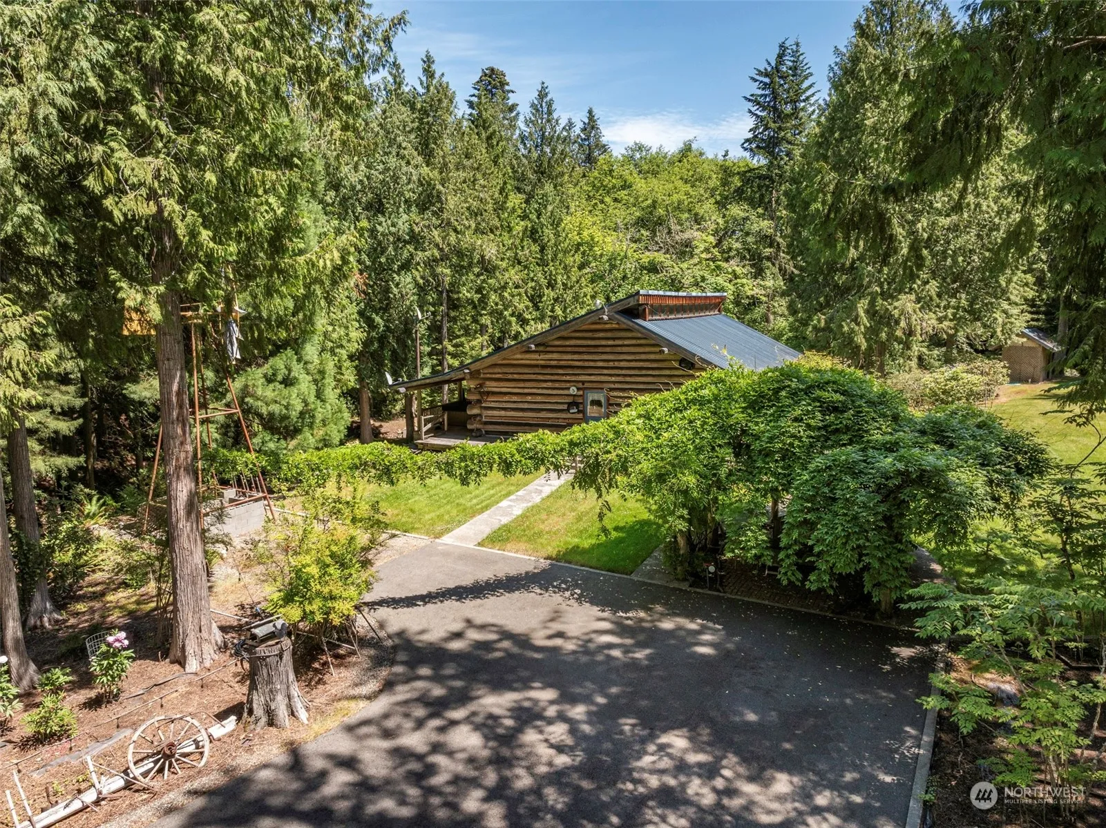 Picture perfect! Charming 2 bed/2.5 bath log home nestled on STUNNING 5 acres with irrigation creek, fern-lined ravine, large meadow, & beautiful cedar trees. Home features great room concept, vaulted ceilings & clerestory windows. Large kitchen with propane stove, copper hood & tons of counterspace. Fir plank T&G floors. French doors lead to wraparound deck with hot tub. 1,750 sq ft shop/garage in basement can fit 5 cars & comes with hydraulic car lift. Paved driveway, pressurized irrigation, full RV hookups. Must see!
