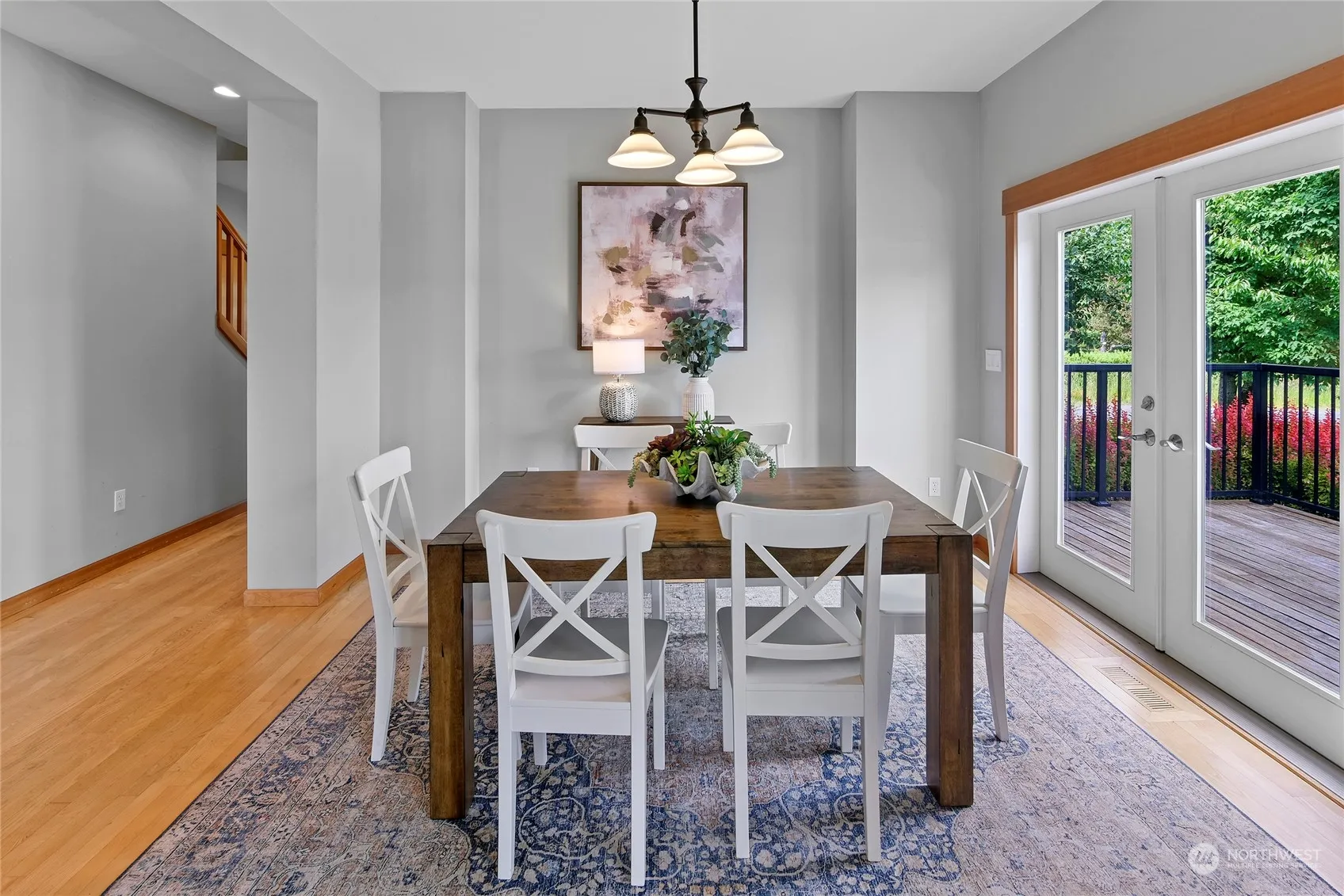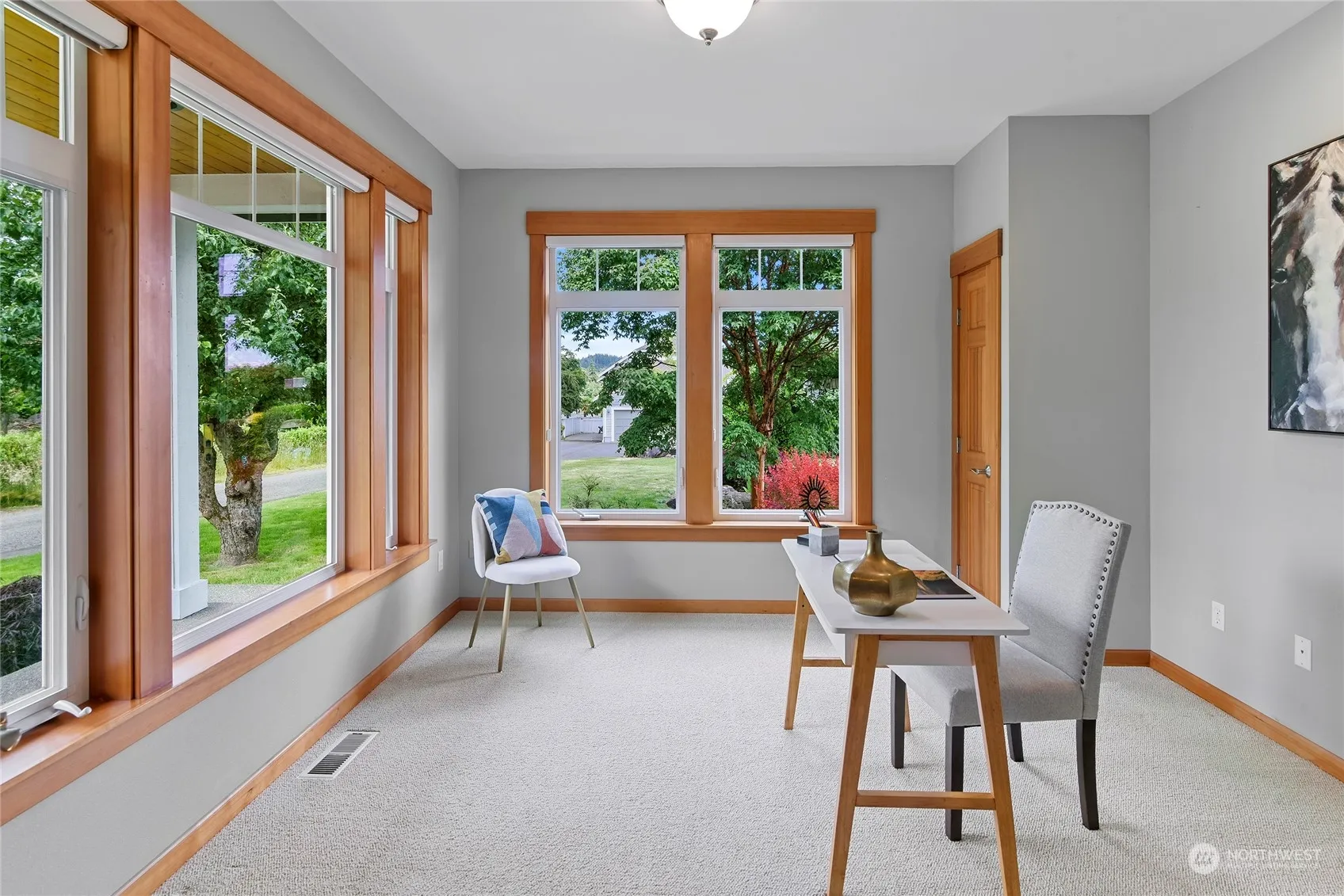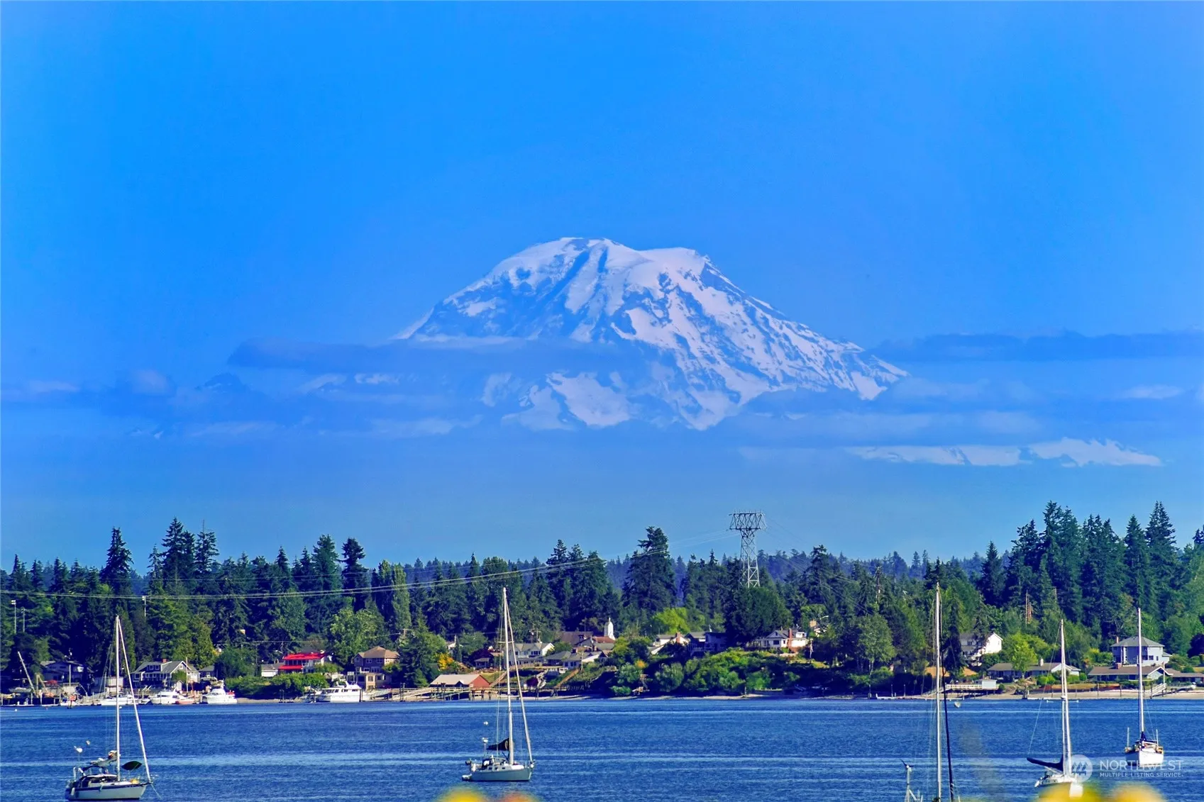 Bright and sunny gem in a lovely “village by the sea” setting, just minutes from charming downtown Poulsbo. With beautiful views of Liberty Bay and Mt. Rainier, this 2,437 sq ft home on .27-acre is a find! Hardwood floors and tall ceilings on the main level with roomy den/office, dining room, living room with a cozy gas fireplace, and spacious kitchen with breakfast nook. Upstairs are 3 bedrooms including the SE-facing primary with views of Mt. Rainier, ensuite bath and walk-in closet, laundry room and large bonus room. Warm wood accents throughout include wood doors, trim, and wood-wrapped windows. Waterside patio with gas fire pit and hot tub is a wonderful spot to relax and entertain. Easy-care yard & oversized 2-car garage with storage.