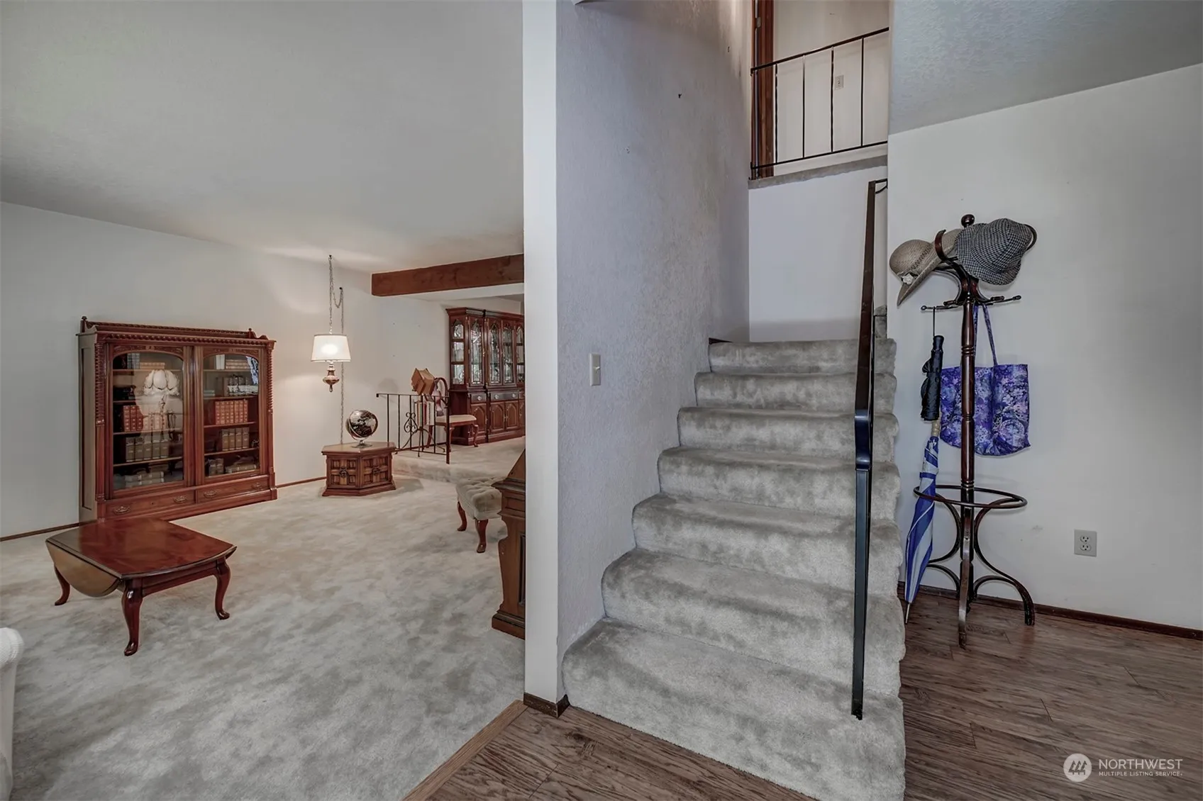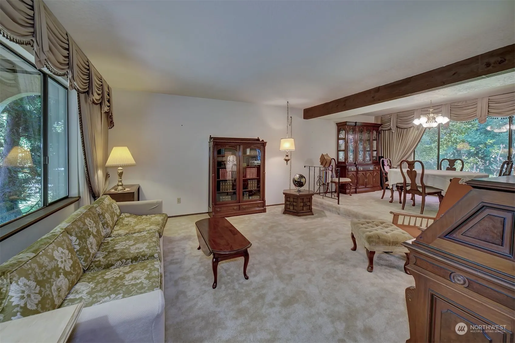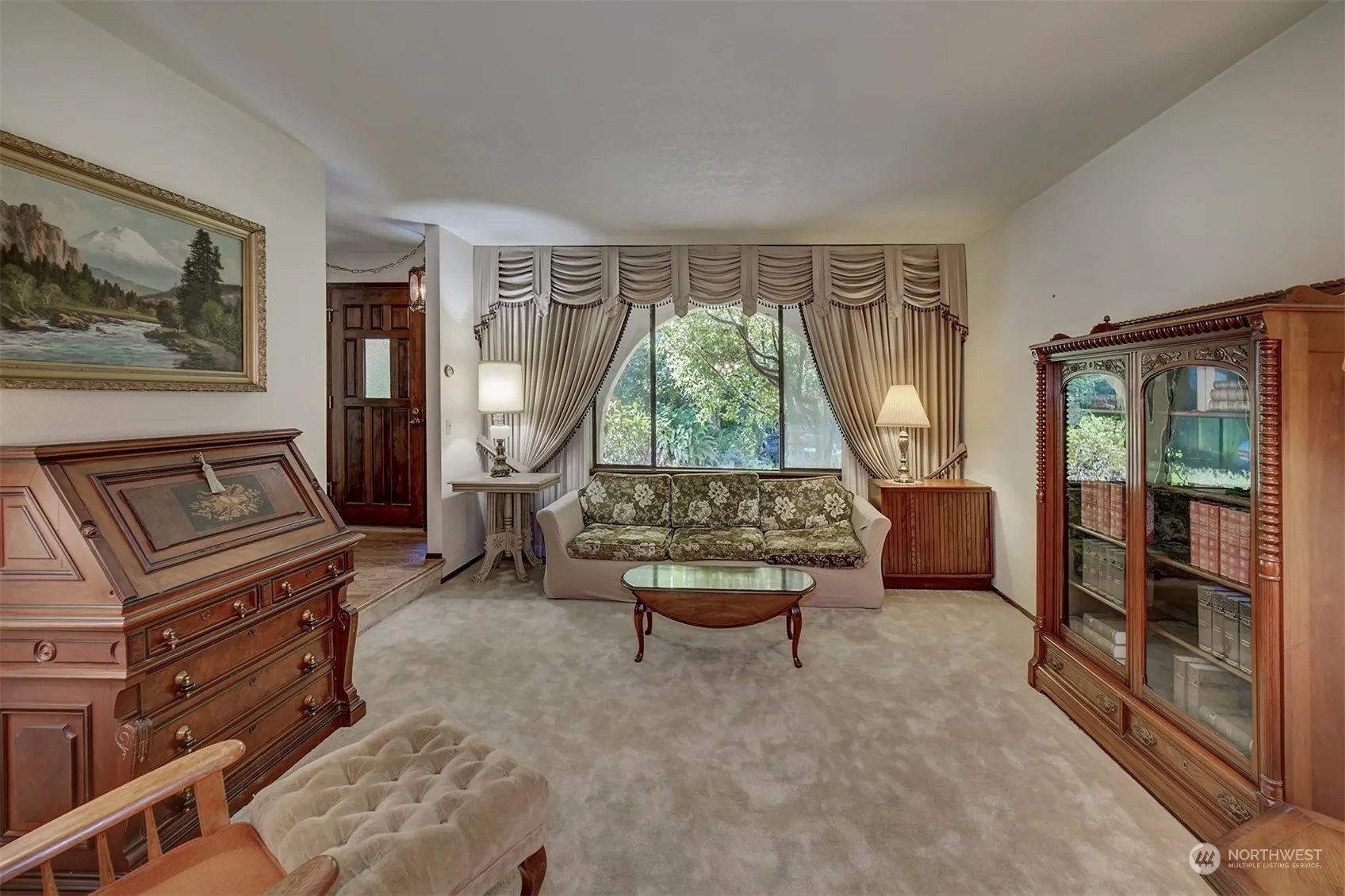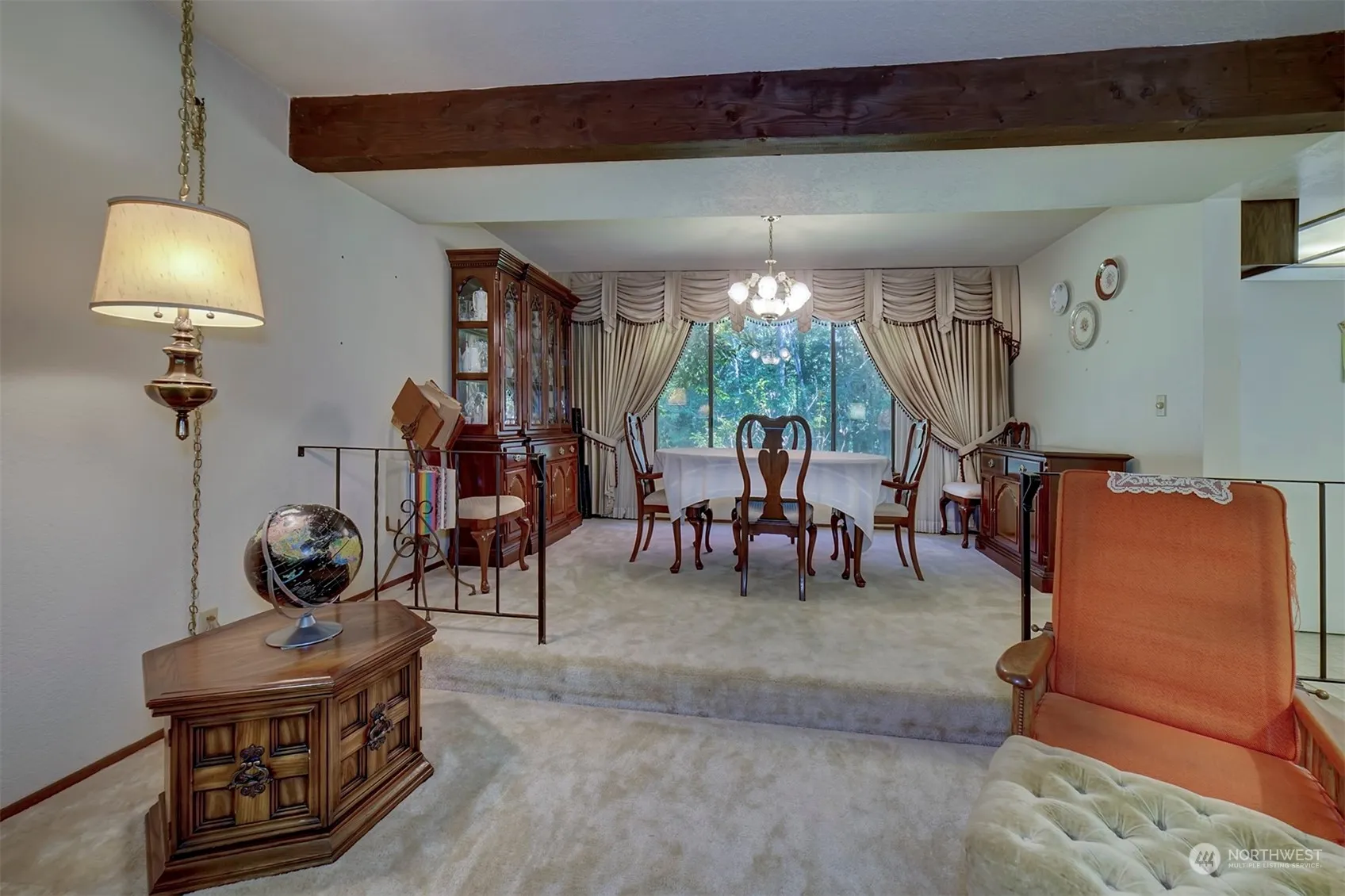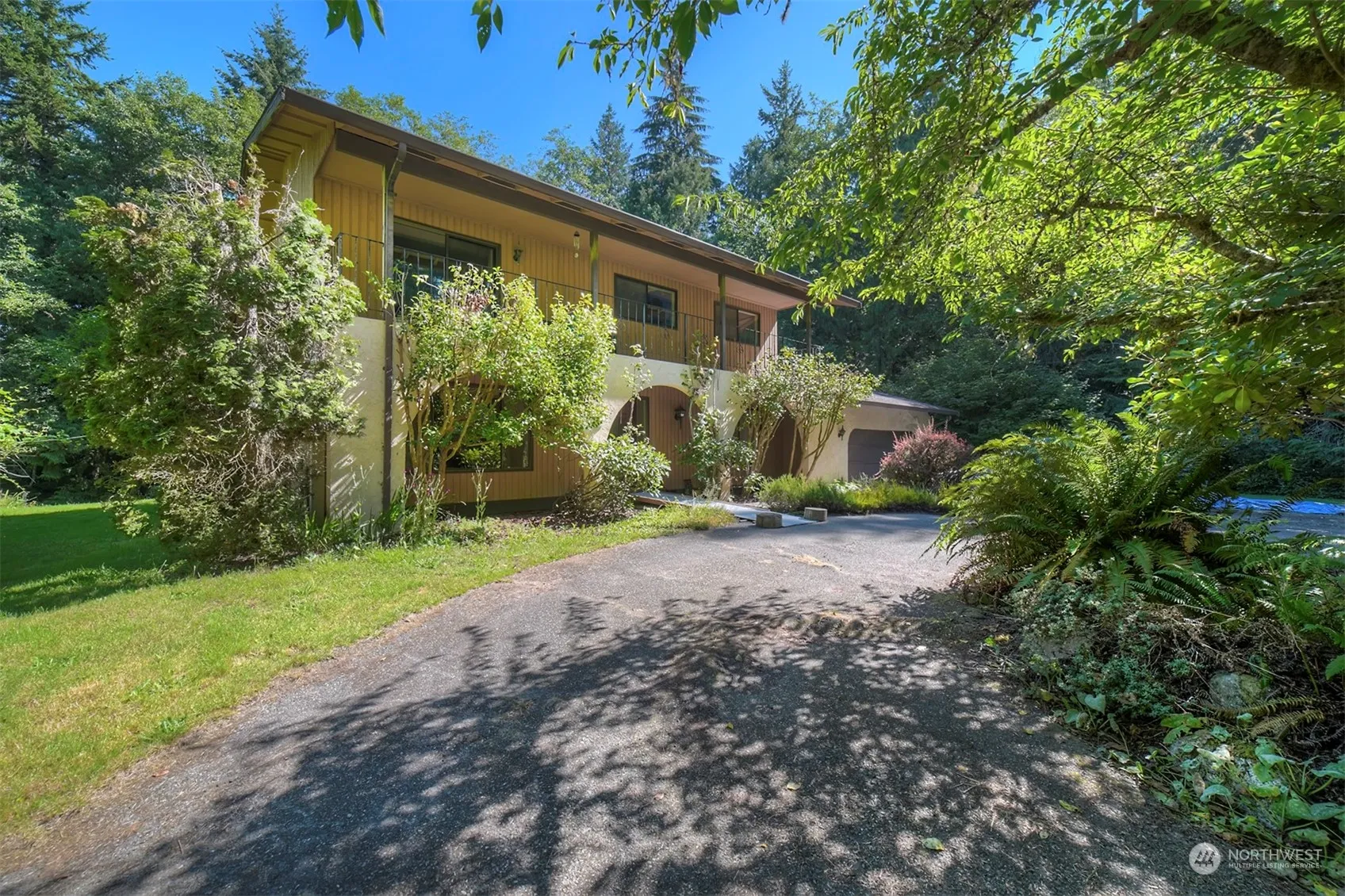 Country Living yet close to shopping. Spacious 4 bedroom home with formal living-dining rooms plus a large, comfortable Rec Room with fireplace and built-in book shelves. Fireplace insert and tools stay. Kitchen has a large pantry with pullout shelves, eating space and efficient work space. Also includes a downdraft stove. Primary Bedroom is 15′ X 18′ with a slider to the front balcony, walk-in closet and bath. Large deck for summer entertaining. Seller is leaving the outdoor furniture for the new owners. Greenhouse and garden area with fruit trees. Property slopes down to a small creek at the back of property.