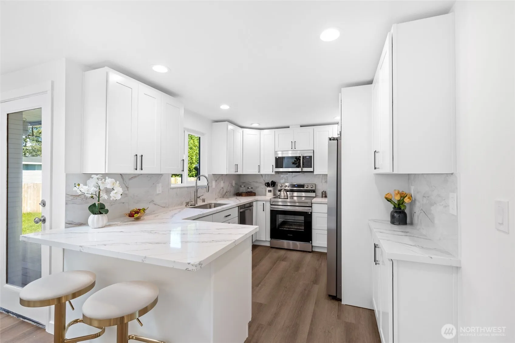 Beautifully remodeled and filled with natural light, this 1,668 sq ft single-story home in the desirable Edmonds community sits on a generous 7,405 sq ft lot and offers an inviting, move-in-ready living experience. Multiple skylights brighten the interior, creating an open, airy atmosphere that enhances the home’s warm and welcoming feel. Inside, fresh paint and updated flooring provide a clean, modern look, while the dining area features a stylish built-in bar — perfect for entertaining. The thoughtfully updated kitchen showcases new cabinetry, sleek countertops, and abundant storage space to support everyday living with ease. Bathrooms have been refreshed with new vanities, hardware, and beautifully updated showers, including a skylight that fills the guest bath with natural light. The spacious primary suite offers a relaxing retreat with a soaking tub, separate shower, and dual sinks designed for comfort and convenience. Extensive system upgrades add long-term value and peace of mind, including new electrical, new water supply lines and an energy-efficient ductless heat pump mini-split system. Outside, the landscaped yard and fully fenced backyard provide space to relax, garden, or entertain, while a storage shed adds additional flexibility. A rare combination of thoughtful updates, natural light, and functional design, this fully refreshed Edmonds home delivers comfort, style, and everyday livability.