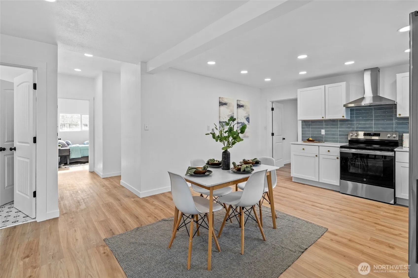 FULLY REMODELED – 3 bed 1.5 bath 1688sq ft – New roof, new carpet upstairs, new flooring throughout, quartz topped kitchen cabinets with tiled backsplash, stainless appliances, open concept living/dining/kitchen. Massive utility room can double as a pantry. Large bedrooms. High end quartz topped bath vanities. Gorgeous tiled shower surround and bath floors. Double sink in the full bath. Beautiful hardware and finishes. Vinyl windows, recessed lighting. High ceilings throughout the first level, a bit lower ceilings upstairs has 3 additional large, carpeted areas that make great additional hangouts, playrooms or flex spaces. New exterior paint. Great fenced yard with a small creek. Plenty of parking in driveway. 3 bay pole barn shop/garage to get creative.