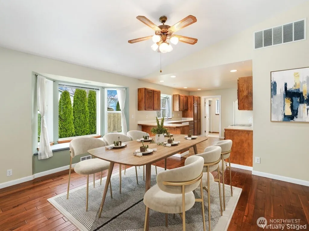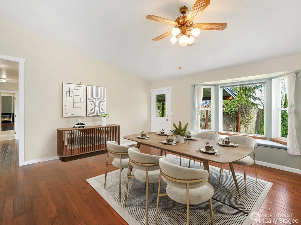 Enjoy Mt. Rainier views from this beautifully maintained, move-in ready 3-bedroom, 1.75-bath rambler home in desirable Berilla Estates. This light-filled residence features an open-concept kitchen and living area with vaulted ceilings and rich hardwood floors, creating an inviting and spacious atmosphere. The vaulted living and dining rooms are anchored by a shared see-thru gas fireplace insert, perfect for cozy gatherings and seamless entertaining. The well-appointed kitchen flows effortlessly into the main living space. The private primary suite offers a relaxing retreat with its own bath and a full wall of closets for ample storage. Two additional bedrooms provide flexibility for guests, work, or hobbies. Step outside to a large side yard with garden space and room for potential RV parking. The covered front porch with durable Trex-style decking adds charm and a welcoming outdoor space to enjoy year-round. Complete with a 2-car garage and located in a peaceful Enumclaw setting!