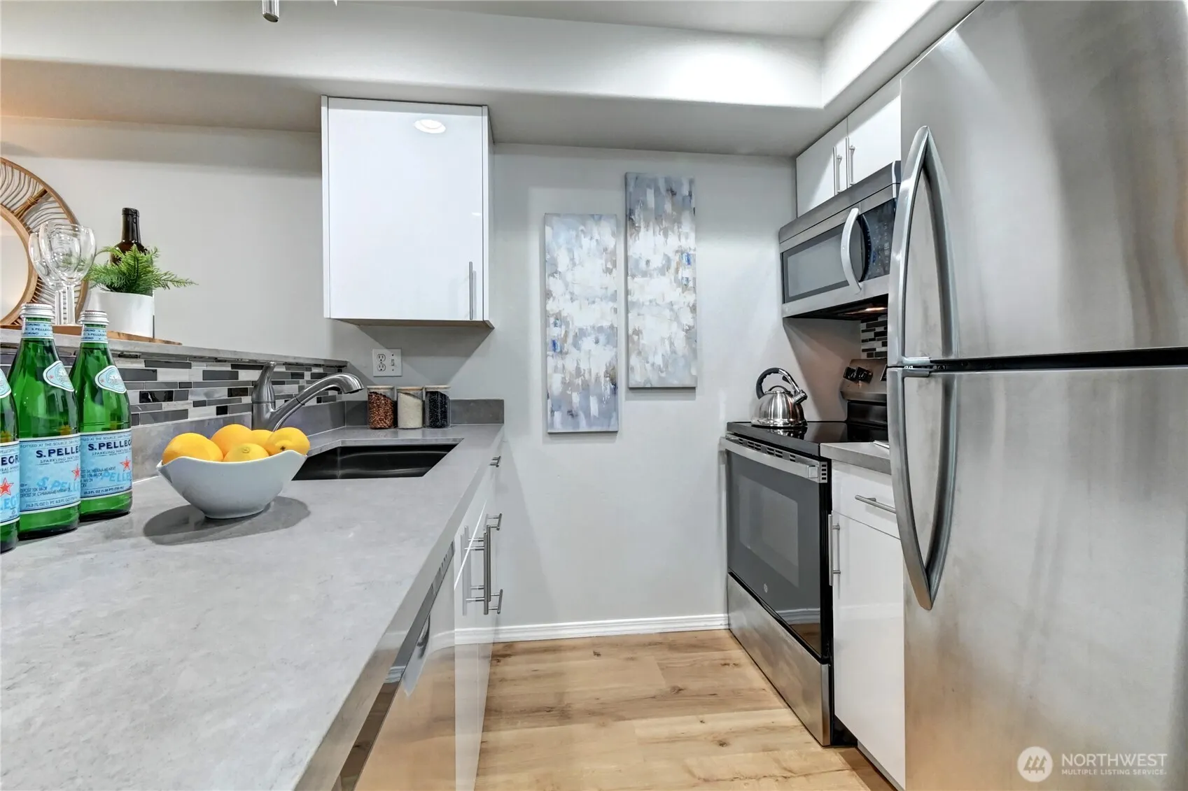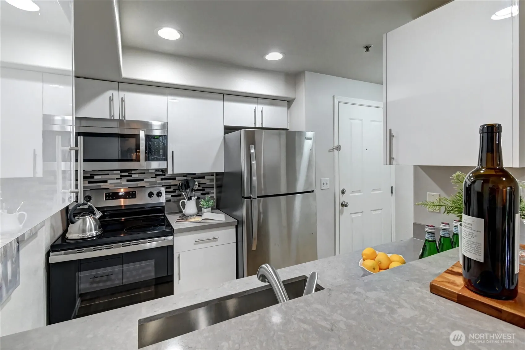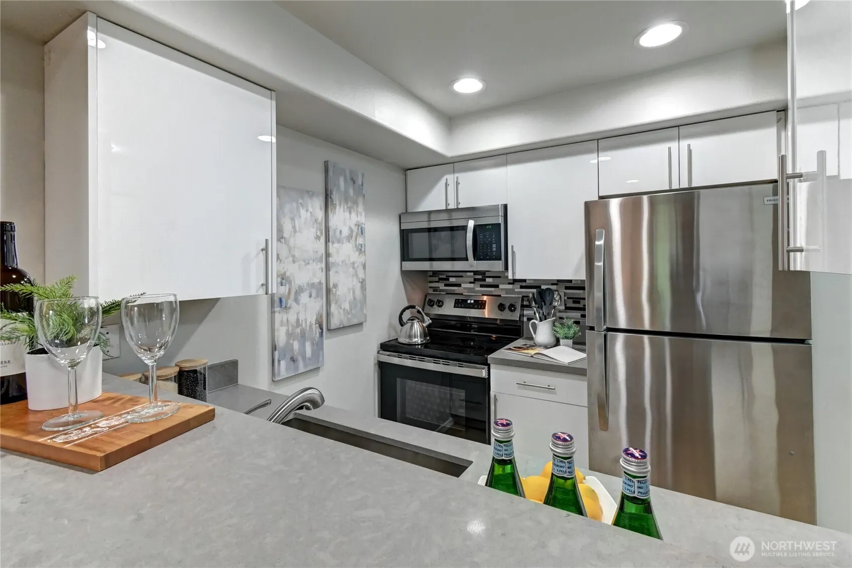 Beautifully updated, light-filled, and perfectly placed in the heart of Monroe! This move-in ready ground-floor condo brings together modern style, everyday convenience, and peaceful pond + territorial views that make coming home feel like a treat. Step inside to a bright, open living space with large windows, fresh luxury vinyl plank flooring, and a cozy gas fireplace that sets the tone for relaxed living. Enjoy morning coffee or evening cocktails on your private patio—complete with extra storage—and step right out to green space and a nearby trail for an easy dose of nature. The sleek, refreshed kitchen features quartz countertops, stainless steel appliances, and ample cabinetry, creating a clean, functional hub for cooking and entertaining. Two spacious bedrooms include a lovely primary suite with its own private bath, and the in-unit washer & dryer add everyday ease. Secure building entry and ramp access make life simple, and this unit truly stands out with both a private garage AND an additional assigned parking space. With no rental cap, this home is a fantastic first-time buy or investment opportunity. Pre-inspected and offering a one-year home warranty for peace of mind. All of this just moments from parks, schools, shopping, dining, and easy highway access. Modern updates, effortless living, and a location that checks every box-Welcome home!