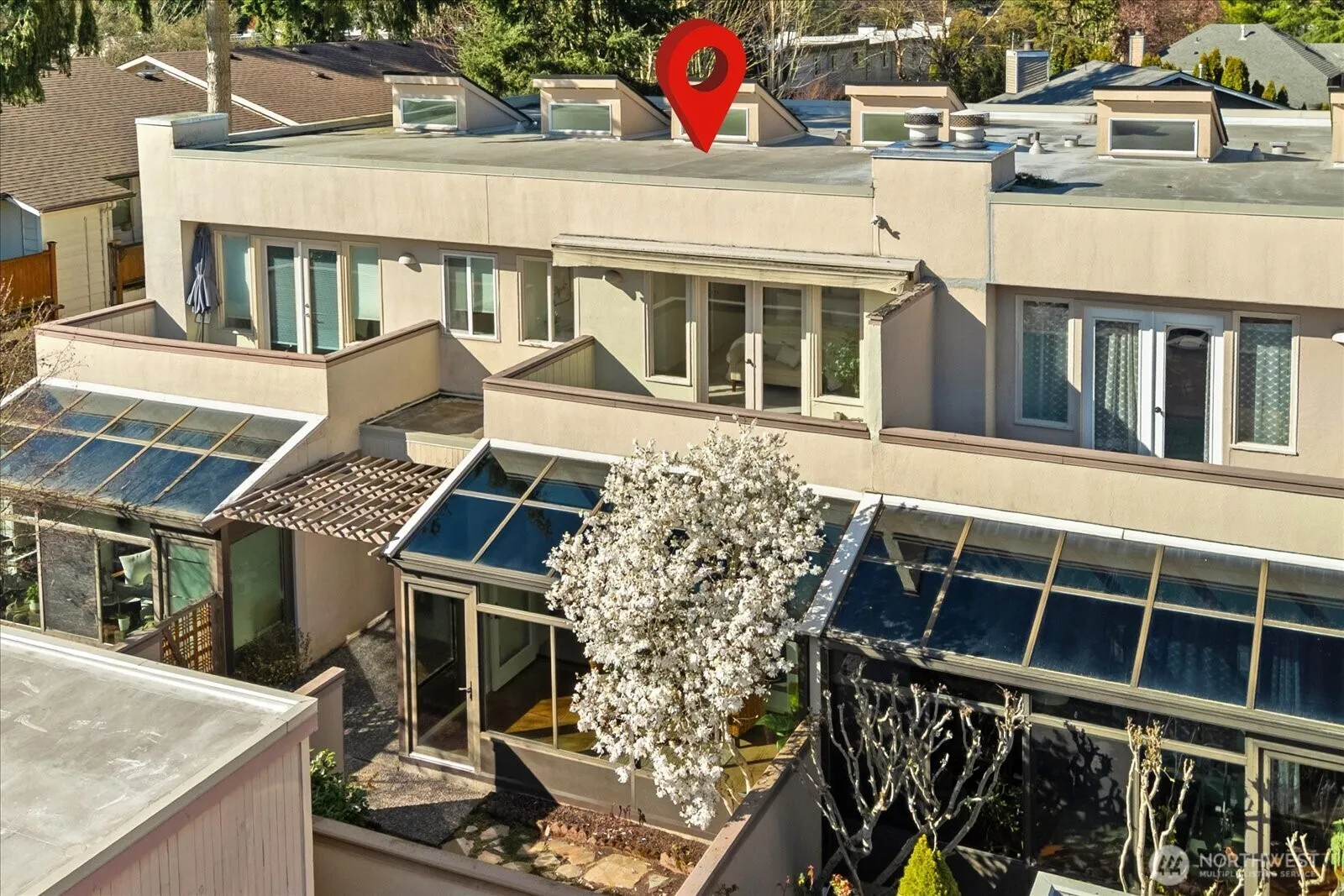 Welcome to this spacious Solaire One townhome in Edmonds’ popular Five Corners neighborhood! Set off the street in the back of the complex, this bright and inviting 2 bed, 1.5 bath townhome lives like a single family home. Just blocks to popular restaurants, cozy coffee shops, top-rated Edmonds School District schools & Swedish hospital, this location offers the perfect blend of convenience and community. Only a quick five-minute drive West brings you to vibrant downtown Edmonds & the sparkling waterfront. Inside, enjoy a light-filled sunroom with access to a private patio & garden space, a spacious living room, and an open-concept kitchen with adjacent dining area and generous pantry/storage. Main level powder bath adds convenience. Relax or entertain on the fenced back deck—your own serene outdoor retreat! Upstairs features a large primary suite with private balcony, desk nook, and oversized closet. One other large bedroom and full bath, plus in-unit laundry for easy living. One car garage and one assigned parking space. Pets allowed up to 40 lbs. Investor opportunity as it is under the rental cap. Pre-inspected for your peace of mind. Prime commuter location with quick access to freeways, Light Rail, bus lines and Sounder train. Amazing value!