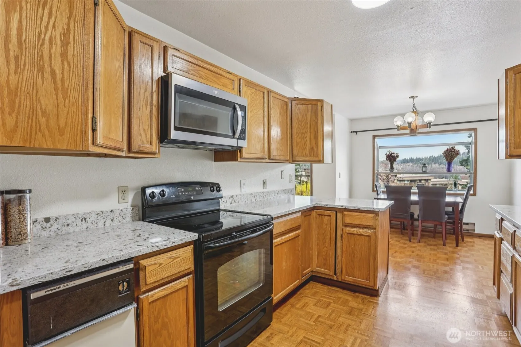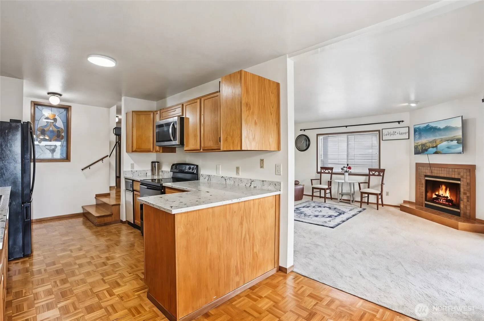 Enjoy lake-view living in this beautifully updated 2 bed, 2 bath condo with views of Lake Sammamish from both the balcony and dining nook. The light-filled living room is anchored by a cozy wood-burning fireplace, creating a warm and inviting space. The updated kitchen features granite countertops, sleek black appliances, and timeless oak cabinetry that flows throughout the home. Spacious bedrooms offer comfort and functionality, while the primary suite showcases a charming bay window with shutters, dual vanities, dual closets, and a walk-in shower. Thoughtful updates blend seamlessly with classic design touches. Step outside to take in evening sunsets or explore nearby lake access and outdoor recreation. Complete with dedicated parking, this home offers both convenience and a serene setting.