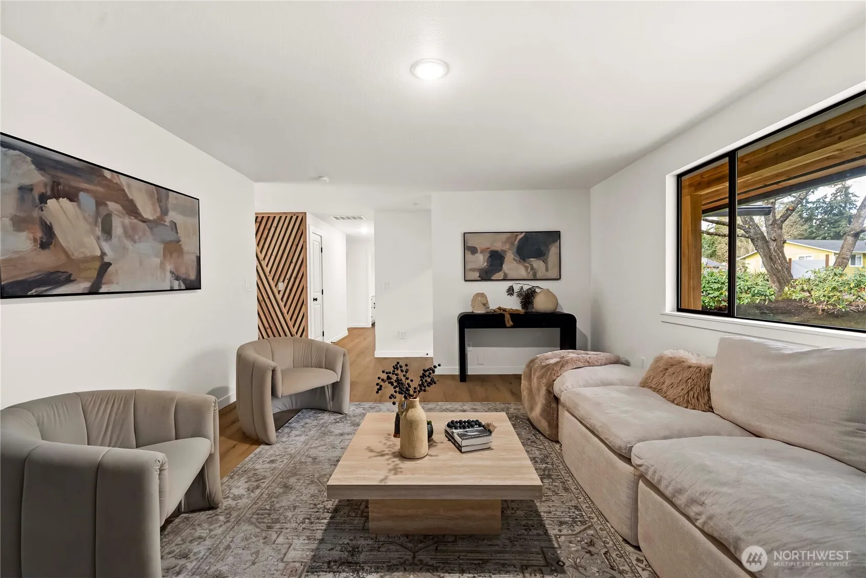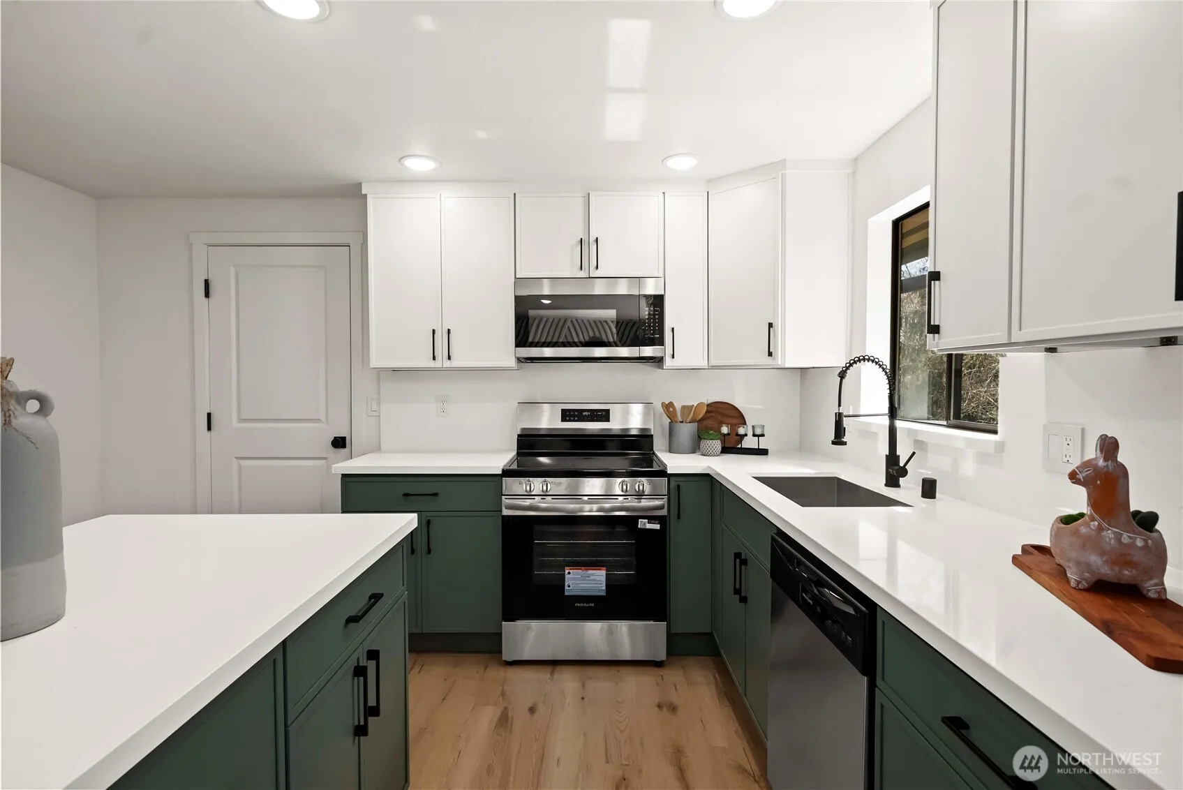 Some homes just feel different the moment you walk in — and this Lacey gem delivers on every level. Completely remodeled from the ground up, this stunning 3-bedroom, 1.75-bath retreat in Lacey delivers 1,345 square feet of thoughtfully designed living space where contemporary style and natural beauty come together effortlessly. The heart of the home is a show-stopping kitchen featuring sage and white cabinetry, gleaming quartz countertops, stainless appliances, and a large island perfect for morning coffee, weekend entertaining, or everything in between. Luxury vinyl plank floors flow seamlessly throughout, while a custom wood-slat accent wall adds warmth and a designer touch that makes this space truly one of a kind. But step outside – that’s where the magic happens. Your backyard opens directly to lush green space with a tranquil pond and creek just steps away. Gather around your fire pit and let the stress of the day quietly fade. This is the kind of backyard people dream about. Whether you’re sipping coffee on a quiet morning or hosting friends around the fire on a cool Pacific Northwest evening, this home offers the lifestyle you’ve been waiting for. Once you see it, you’ll want to stay.