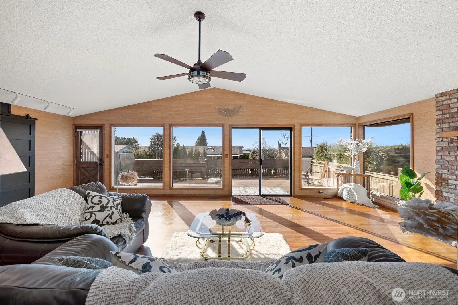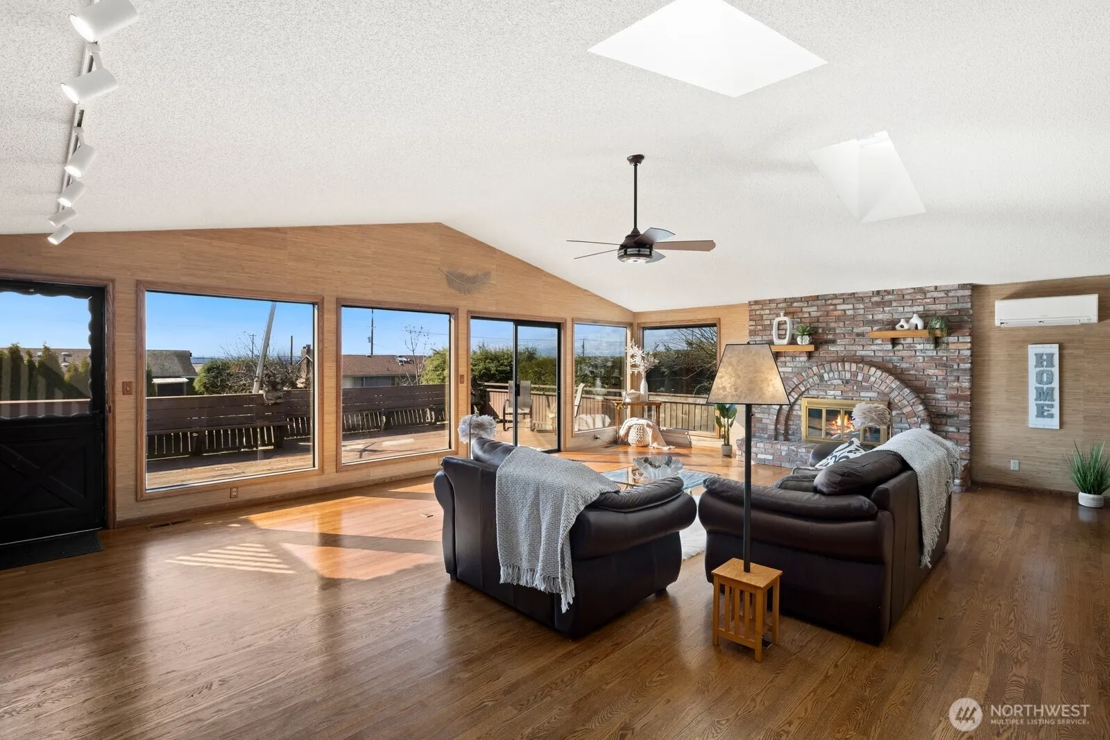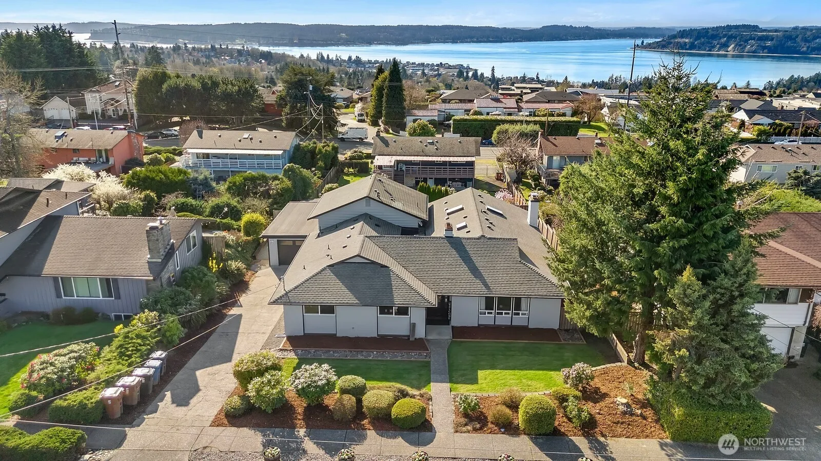 Welcome to this inviting mid-century home with partial water and territorial views, and bright, light-filled living spaces. Expansive windows and vaulted ceilings create an open, airy feel in the main living area, while warm wood tones and a classic brick fireplace add character and comfort. The layout offers a natural flow between the living, dining, and kitchen areas—ideal for both everyday living and entertaining.The upstairs primary suite has been thoughtfully renovated into a private retreat, featuring two walk-in closets and a beautifully updated bathroom with heated floors. The remainder of the home maintains its original charm, offering a solid foundation and the opportunity to update over time, if desired. Conveniently located on main floor, the home features a second primary en-suite with its private bathroom with a shower, along with 2 bedrooms and a full bathroom-offering flexible living options. Enjoy outdoor living with French doors leading to a spacious new deck overlooking the yard, perfectly positioned to take in the water and territorial views. The fully fenced backyard provides room for gardening, play, or relaxation, complemented by well-maintained landscaping and added privacy. Located near University Place area, known for its highly regarded schools, established neighborhoods, and convenient access to parks, shopping, and waterfront amenities.This home offers a great blend of mid-century character and modern updates, with flexibility to make it your own!