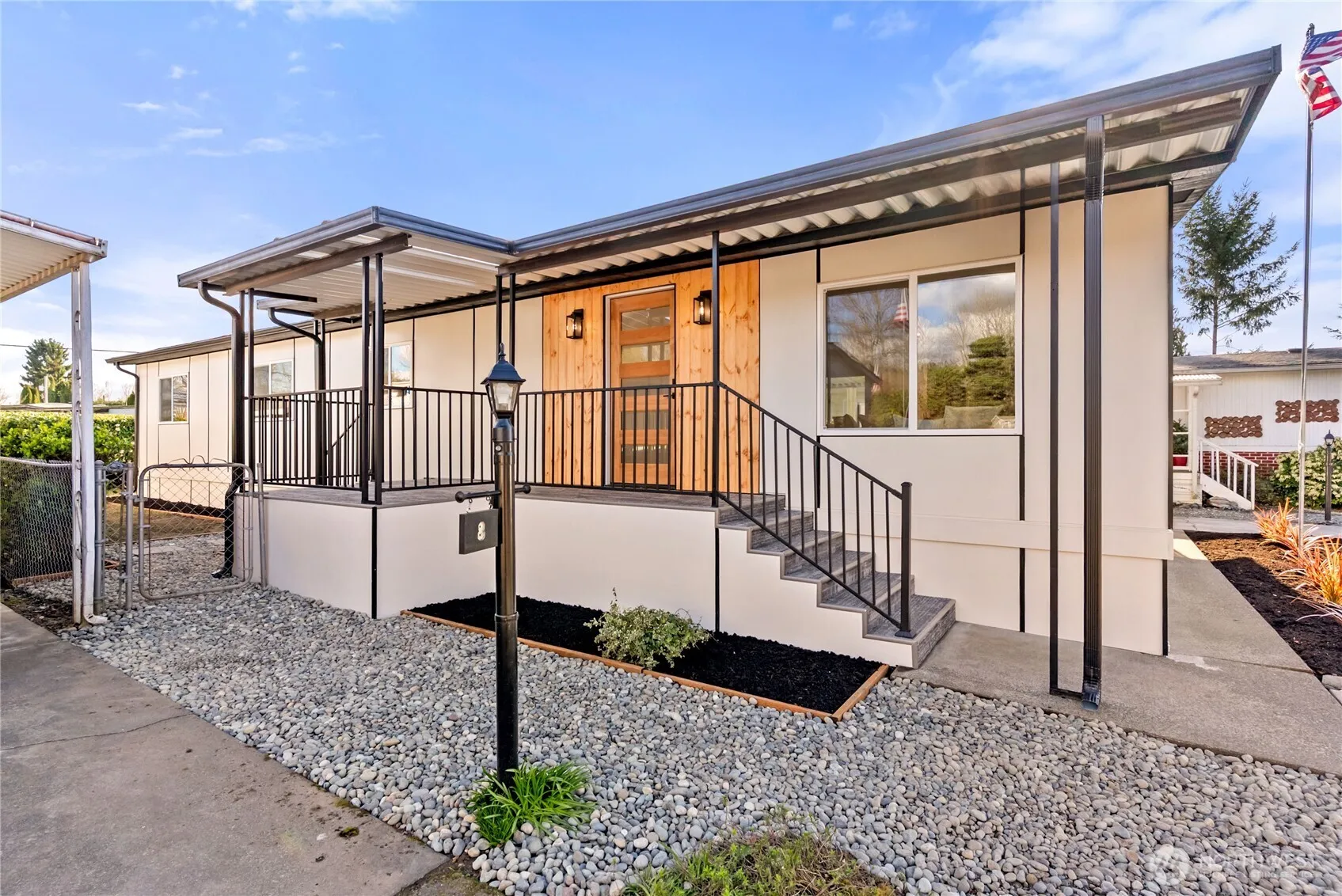 One of the finest homes in the sought-after 55+ Walnut Grove community, this fully remodeled 3-bedroom, 2-bath residence offers exceptional style and comfort throughout. Thoughtfully updated inside and out, featuring a new roof, new windows, new furnace with heat pump, and beautiful LVP flooring. The stunning chef’s kitchen showcases new custom cabinetry, waterfall quartz countertops, full-height quartz backsplash, under-cabinet and island lighting, stainless steel appliances, and a sleek slide-in range. Vaulted ceilings elevate the expansive living room, anchored by a striking electric fireplace and seamless flow into the dining area—perfect for entertaining. Enjoy year-round relaxation on the covered front porch with a warm wood accent entry, surrounded by mature landscaping. The spacious layout includes a generous laundry room with direct access to a 3-car carport and a large storage shed. Retreat to the luxurious primary suite featuring a second electric fireplace, oversized walk-in closet, double vanity with motion-sensor lighting, and a spa-inspired jetted tub with customizable lighting. A versatile second suite with its own bath offers ideal flexibility for guests or shared living. Ideally located near scenic trails, the Green River, shopping, dining, and transit including Kent Station. This is refined, turnkey living at its best—truly a must-see.
